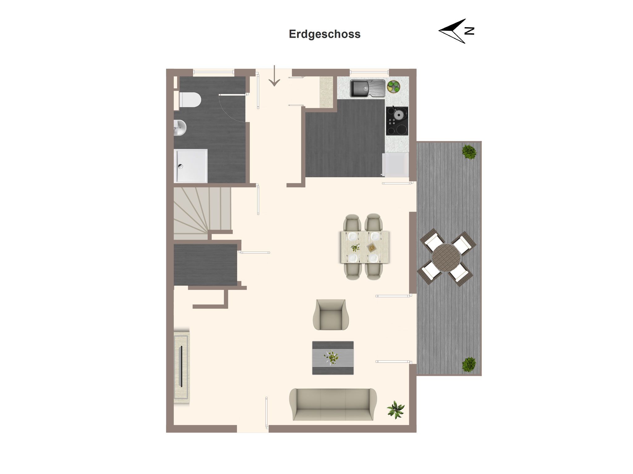 Im Erdgeschoß befindet sich ein modernes Duschbad mit Walk In Dusche, Handtuchheizkörper, Fußbodenheizung, WC und Waschtisch.Ein offener Wohn-/ Küchenbereich, sowie ein HWR schließen sich an. Auf der nach Süden ausgerichteten Terrasse lässt sich nicht nur der Abend genießen.