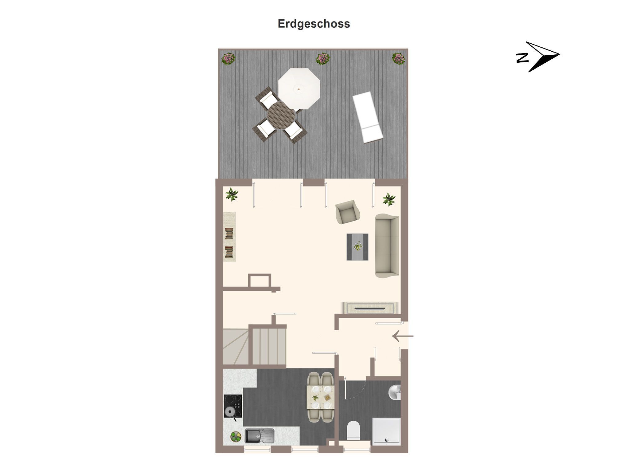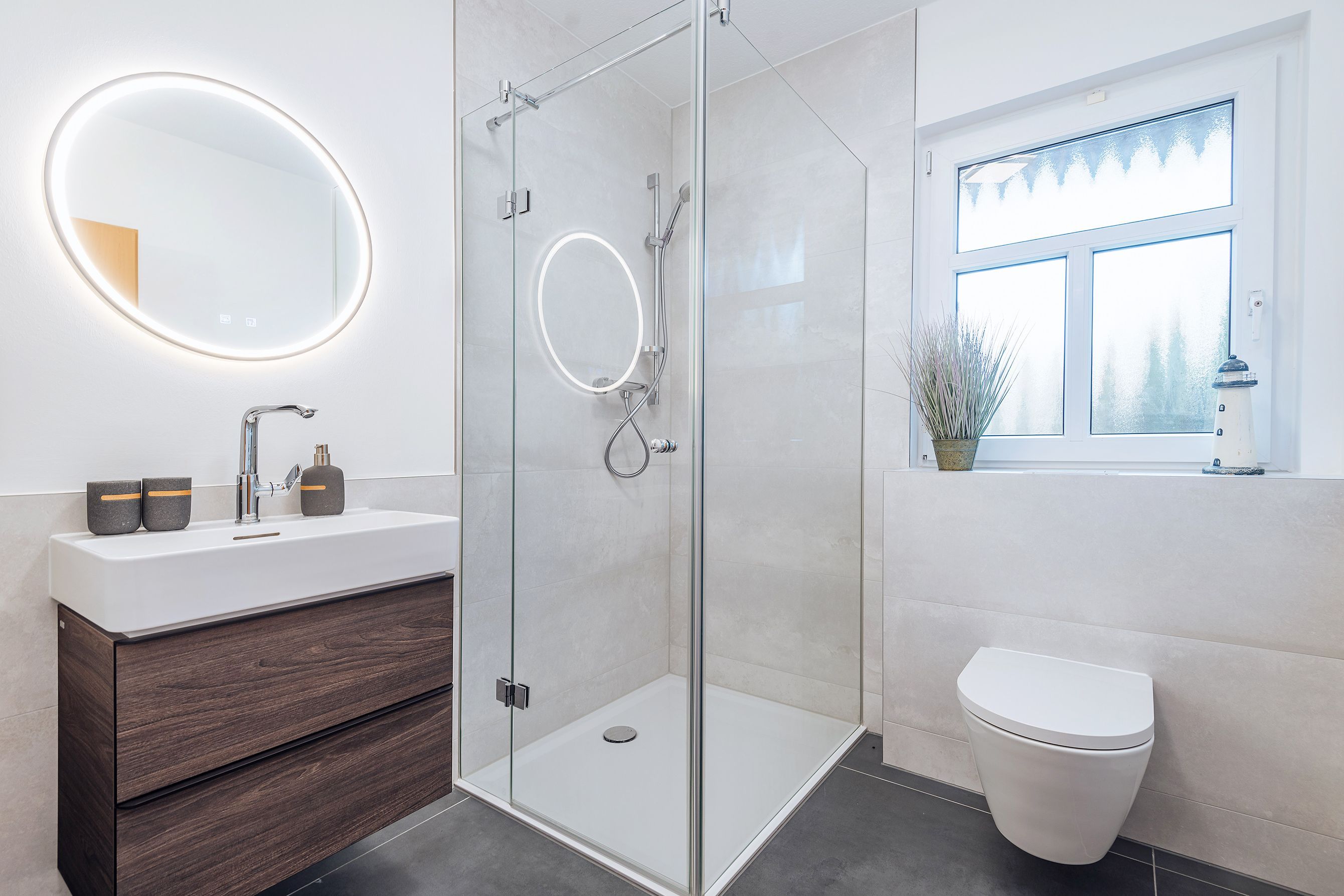 - Walk-In-Dusche im EG mit Handtuchheizkörper, Waschtisch, WC, Fußbodenheizung