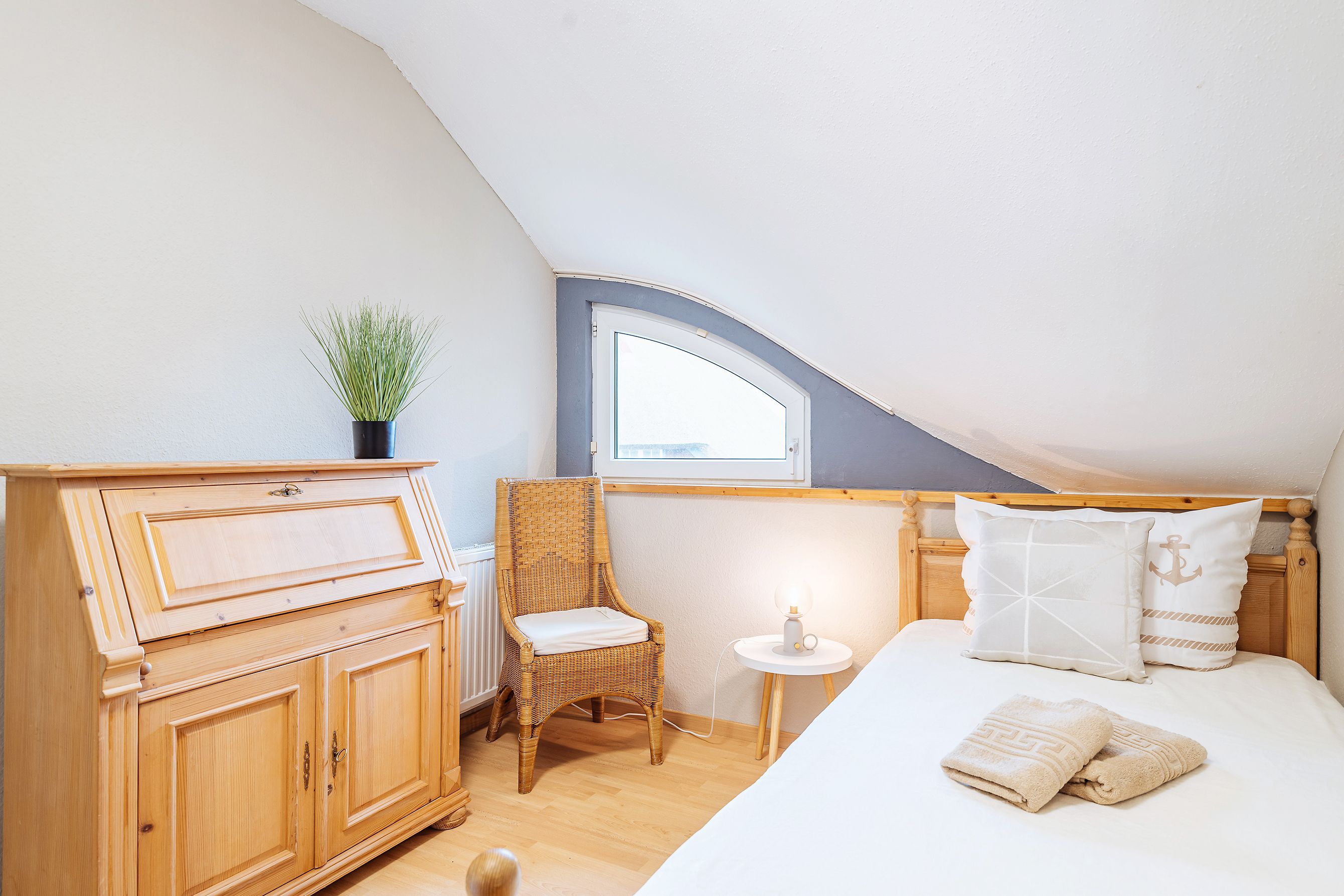 Das Ferienhaus verfügt über einen offenen Wohn -/Küchenbereich, zwei Schlafzimmer mit Boxspringbetten, zwei moderne Duschbäder, eine nach Süden ausgerichtete Terrasse, einen HWR und einer gemütlichen Rückzugsmöglichkeit zum Schnökern im Obergeschoß. Ein Besuch auf der Halbinsel, auch außerhalb des Sommers, lohnt sich immer.