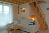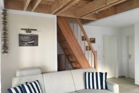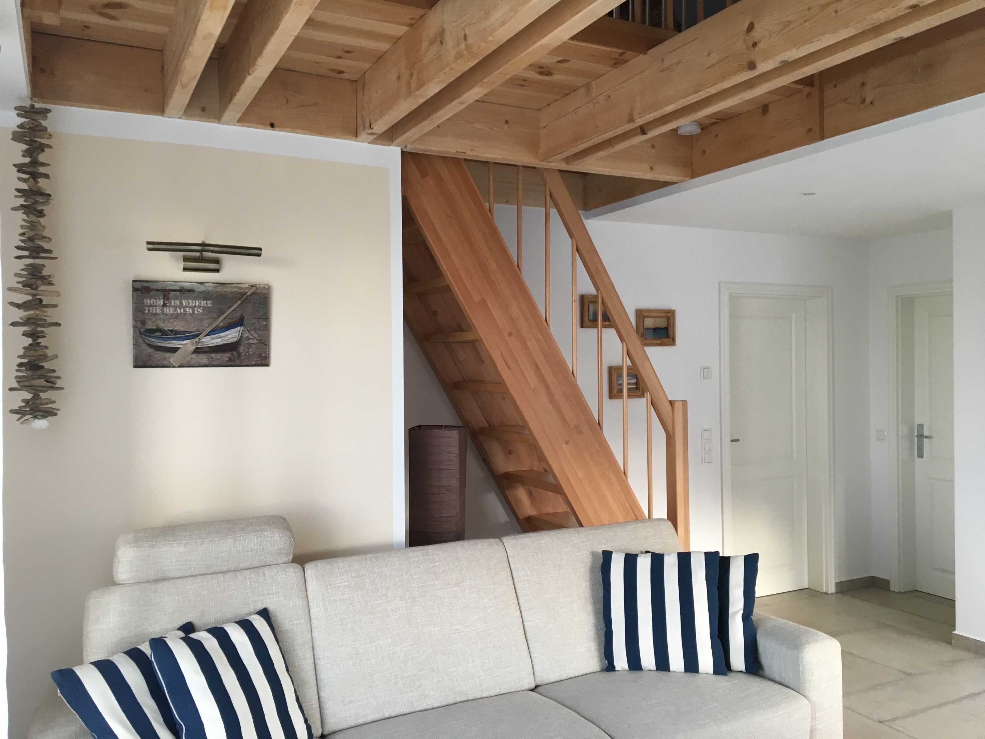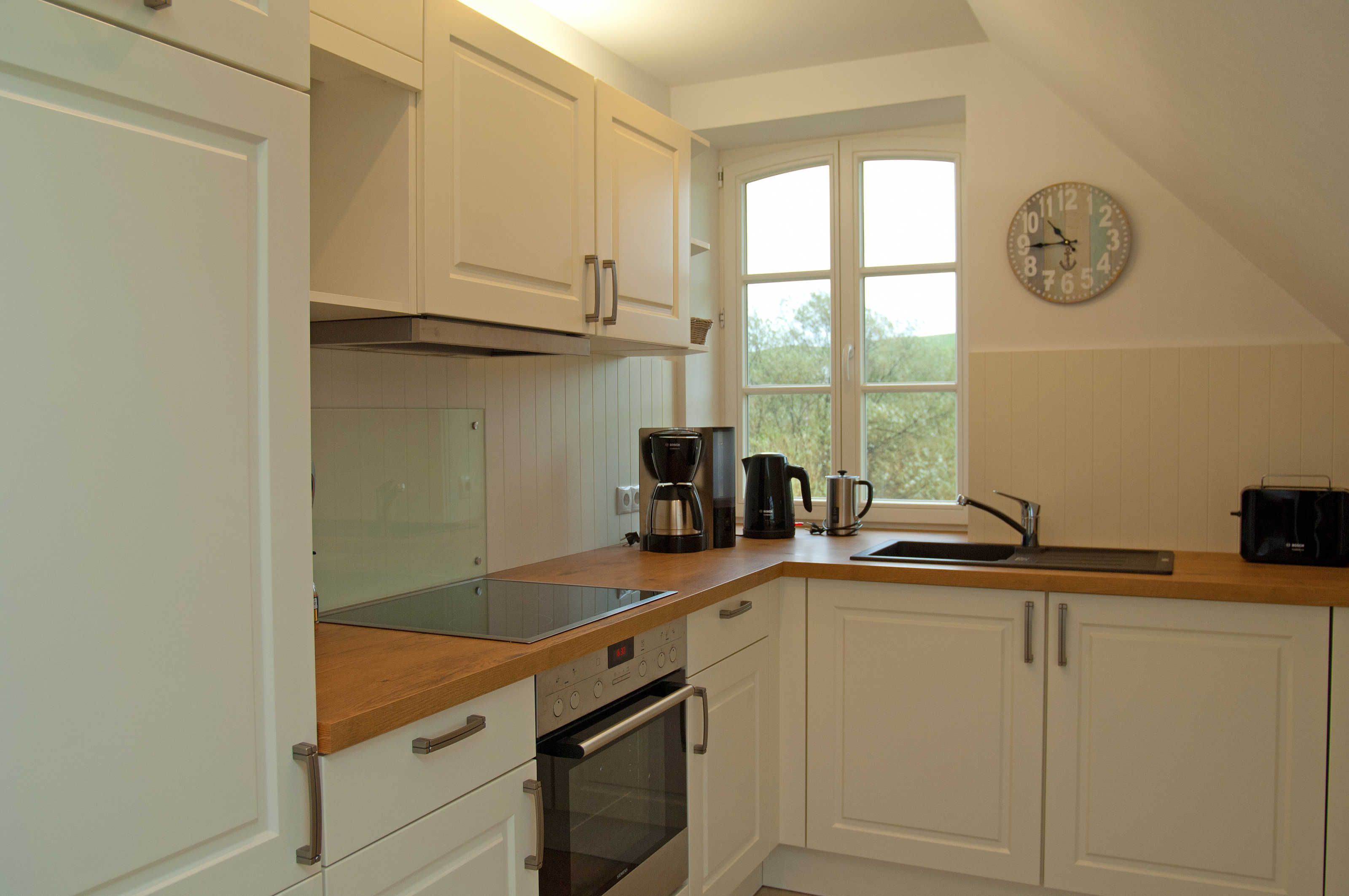 Die wunderschöne Küche im Landhaus Stil ist mit hochwertigen Markengeräten ausgestattet. Ein großer Esstisch bietet Platz für gemütliche Abende mit weitem Ausblick bis hin zur Insel Vilm. Die beiden Schlafbereiche sind mit Doppelbetten und Flachbild-TV ausgestattet. Den besonders gemütlichen Schlafbereich im Spitzboden erreicht man über eine Treppe vom Wohnzimmer. Die im Wohnbereich offene Zwischendecke mit freiliegenden Balken ist das Highlight dieser Wohnung. Zum luxuriös ausgestattete Bad mit großer ebenerdiger Regendusche gehört eine große Badewanne und ausreichend Platz. Das nicht im Bad befindliche WC ist von beiden Schlafbereichen separat zugänglich.