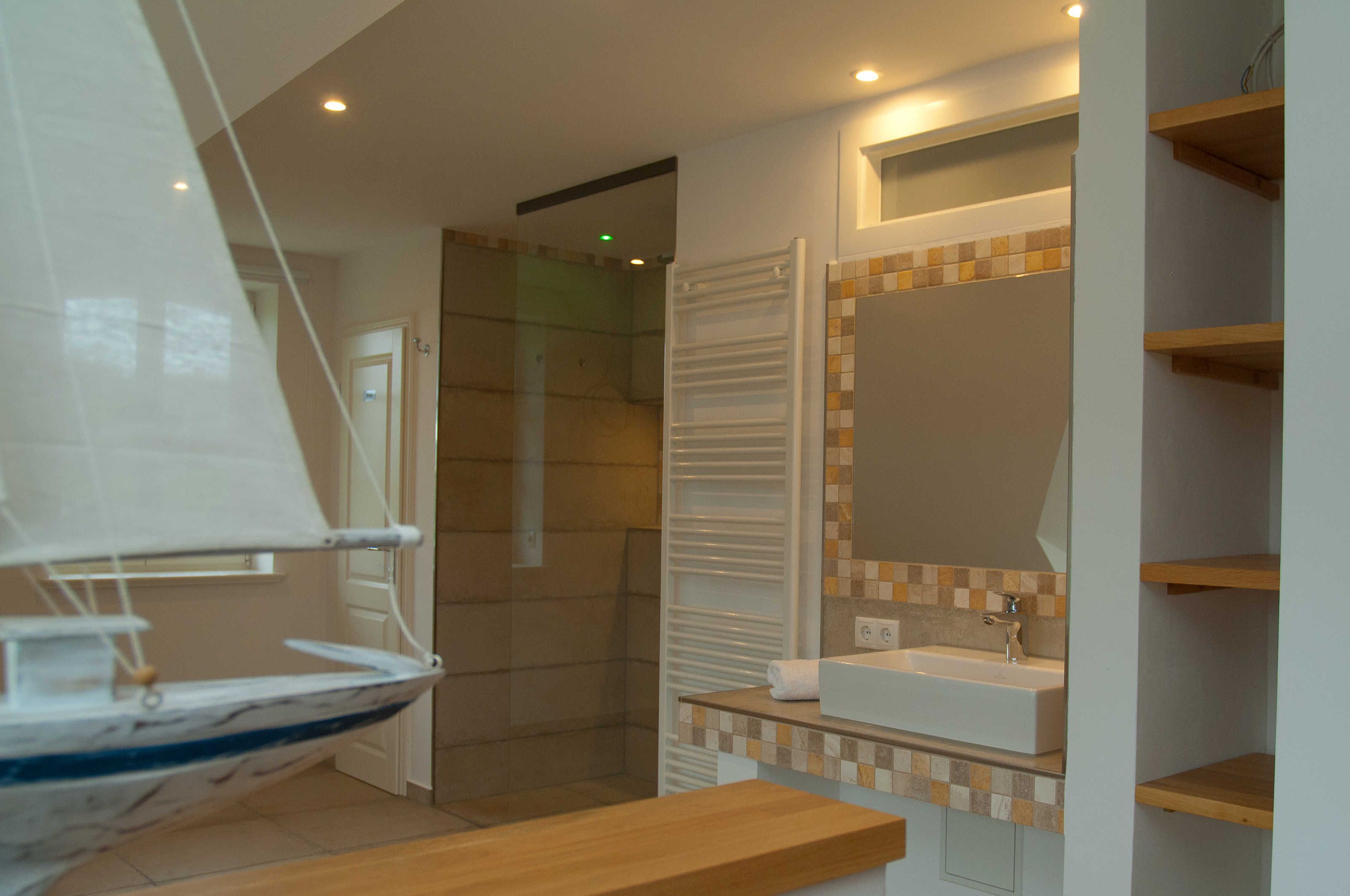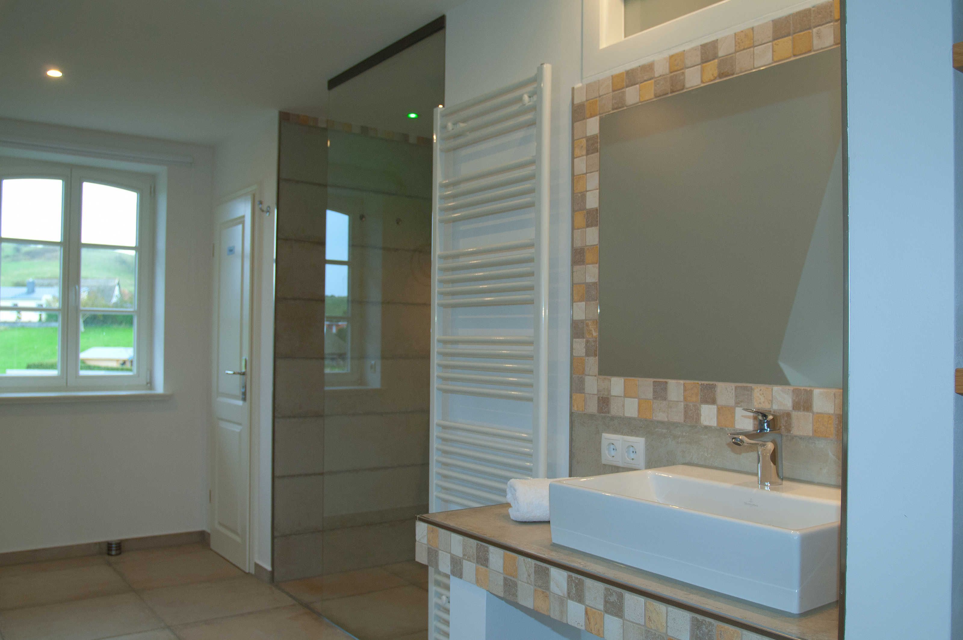 Der Badbereich mit Wellness-Regendusche bietet ausreichend Platz zum Relaxen.