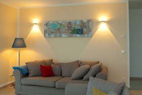 Auf der dem Wohn- und Küchenbereich angeschlossenen, moblierten Terrasse können Sie den Sonnenverlauf nahezu ganztägig genießen. Beide Schlafzimmer sind mit großem Doppelbett und Flachbild-TV ausgestattet. Zum luxuriösen Bad mit großer ebenerdiger Regendusche gehört ein separates Gäste-WC. Der großzügige Küchenbereich mit angeschlossenen Barhockern fügt sich in den Wohnbereich hervorragend ein und ist mit hochwertigen Markengeräten ausgestattet. Die Küche ist komplett eingerichtet.