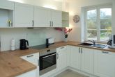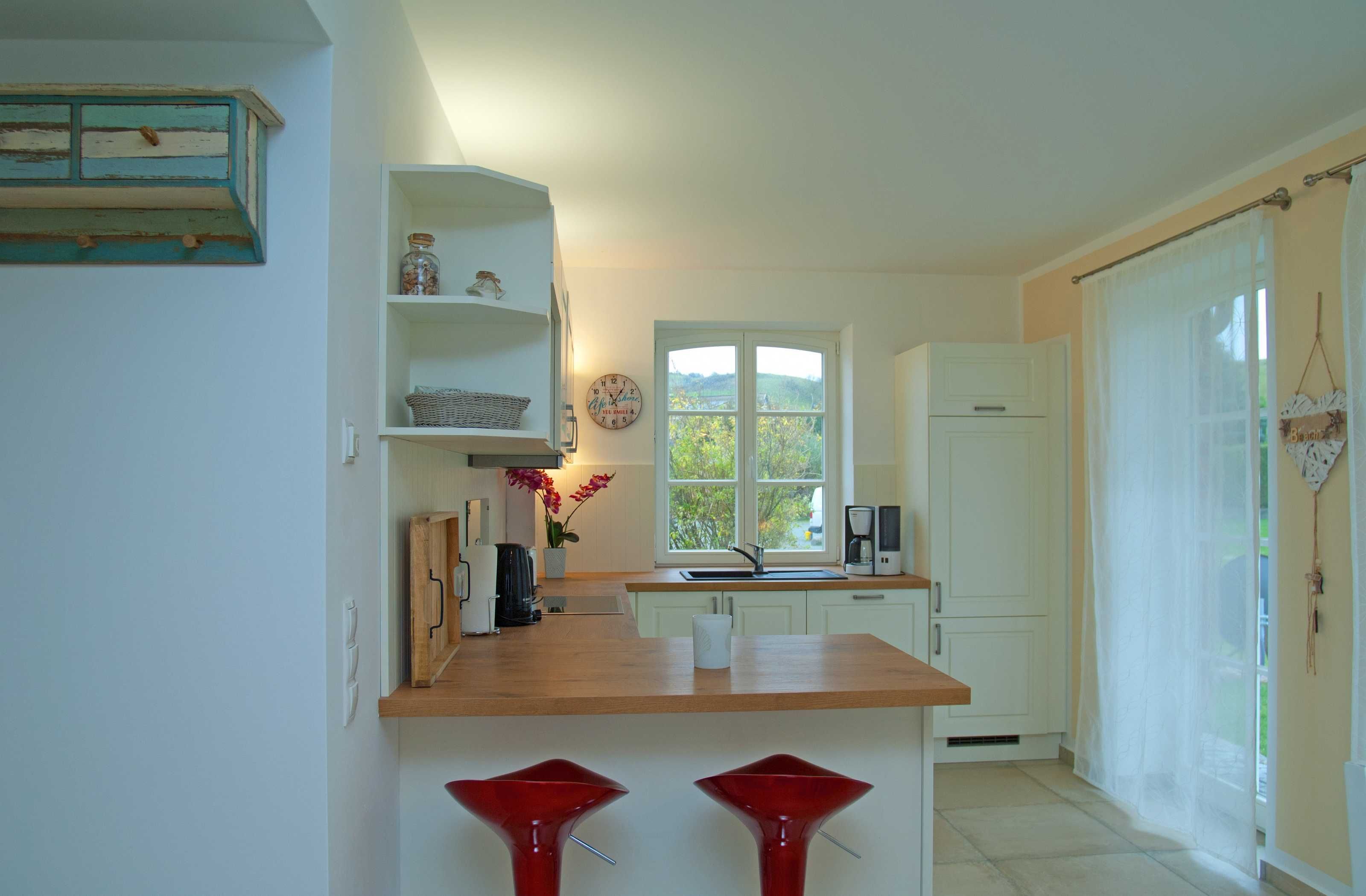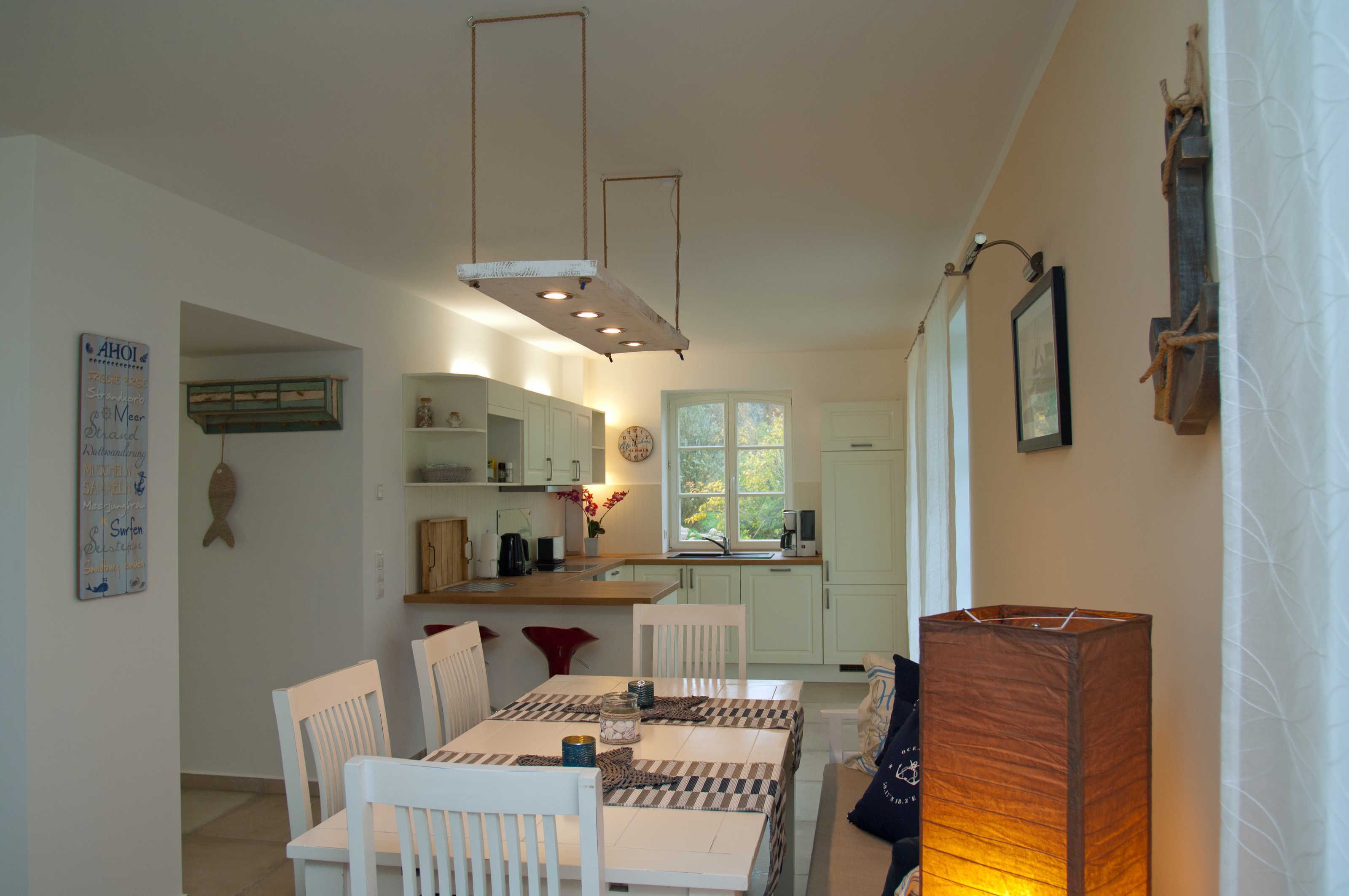 Die liebevoll eingerichtete Ferienwohnung Boddenblick (EG) verfügt über einen großzügigen Wohnbereich mit offener Küche und Esstisch für gemütliche Abende für bis zu vier Personen.