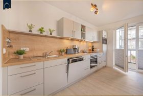 Das Herzstück der Ferienwohnung ist der offen gestaltete Wohnbereich mit gemütlicher Sofaecke, TV und Essplatz. Von hier aus gelangen Sie direkt auf den möblierten Balkon – ideal für entspannte Abende an der frischen Seeluft. Die voll ausgestattete Küche lässt keine Wünsche offen: Geschirrspüler, Backofen, Mikrowelle, Kühlschrank mit Gefrierfach, Kaffeemaschine, Küchenutensilien und sogar eine Küchenmaschine stehen zur Verfügung.