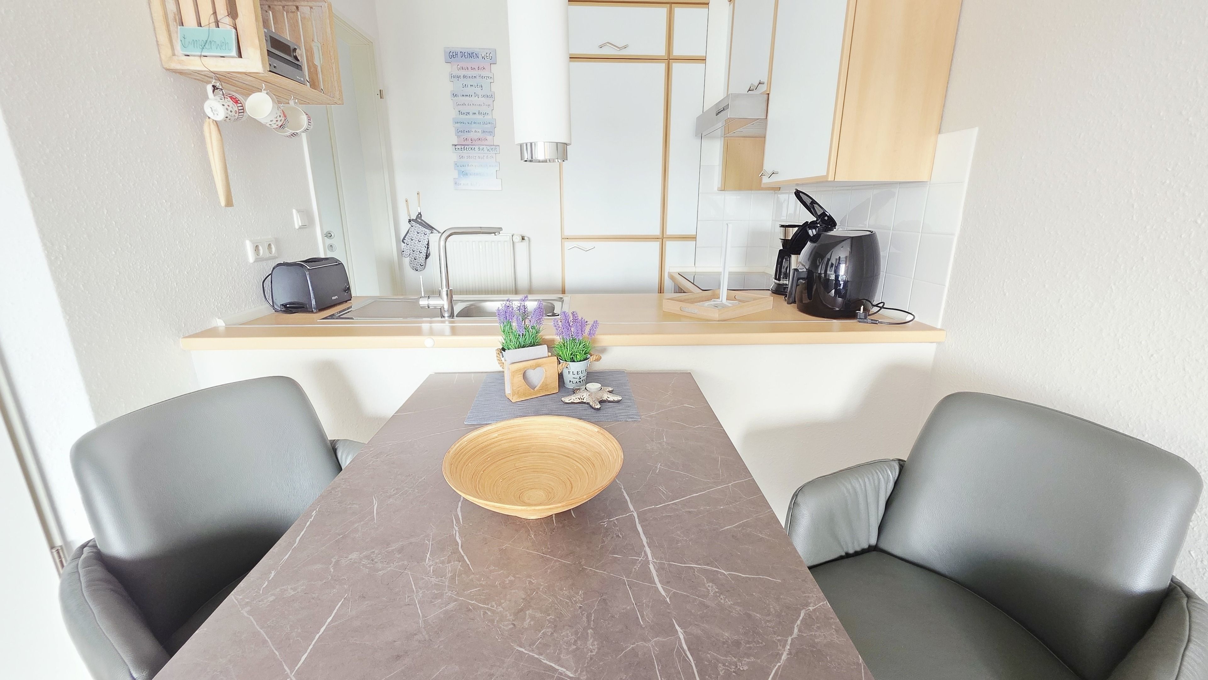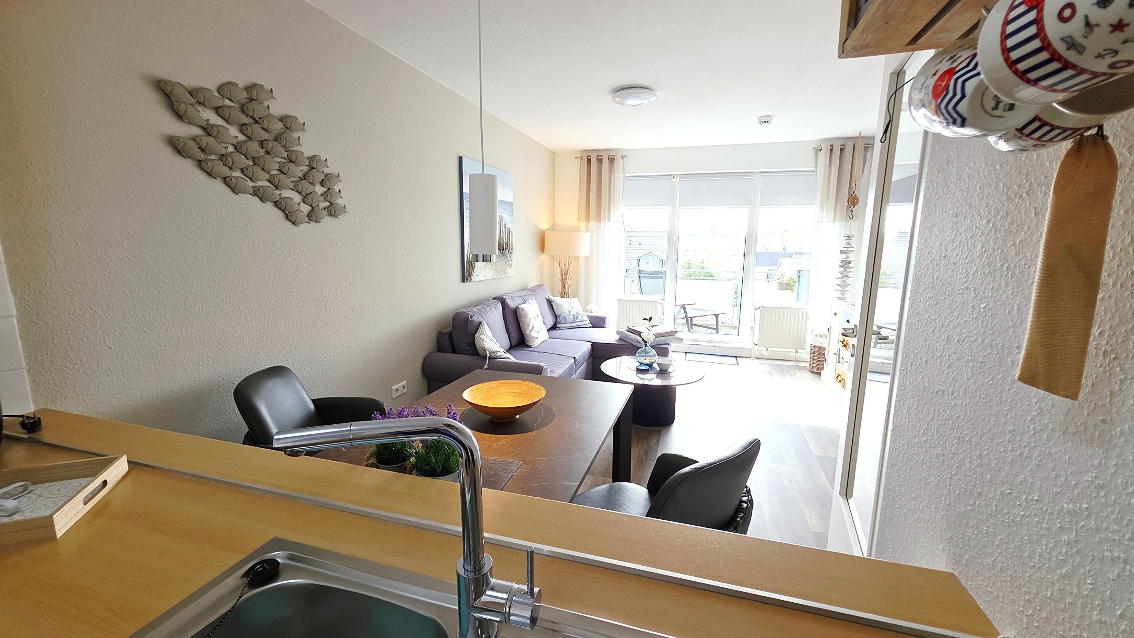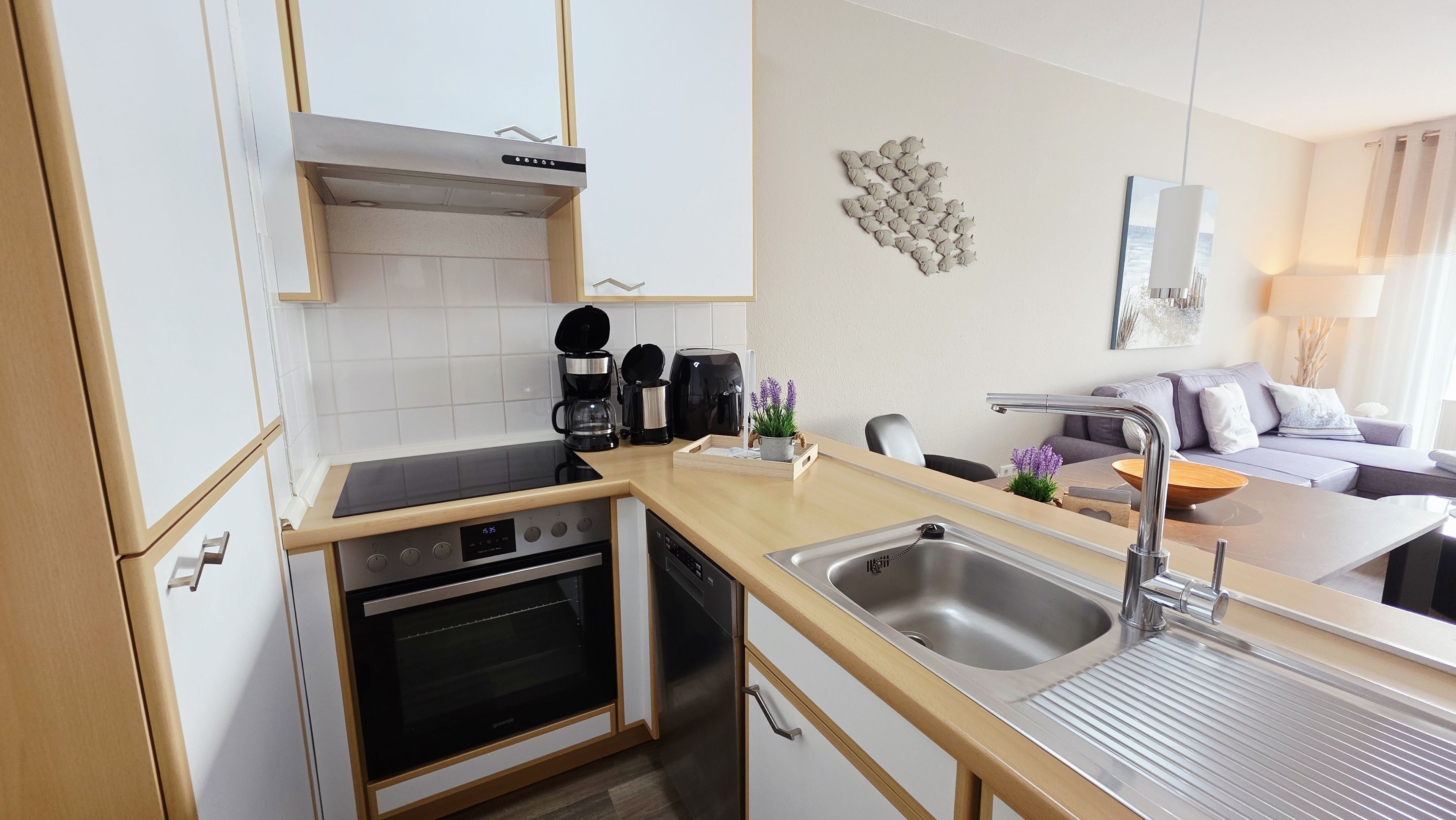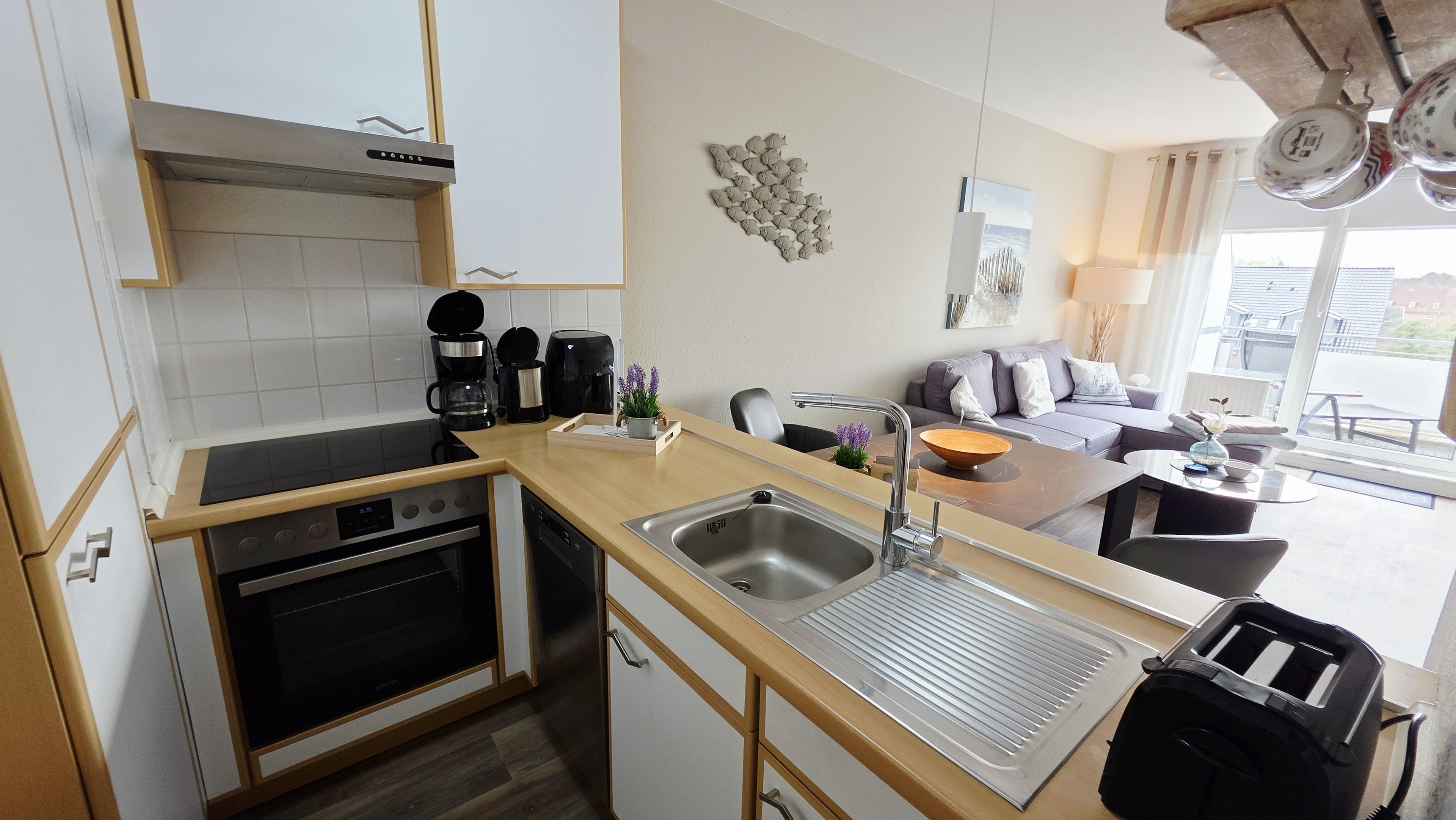 Die seitlich angrenzende, offene, moderne Einbauküche ist mit Backofen, Cerankochfeld, Geschirrspüler, Kühlschrank mit Gefrierfach, Airfryer (1 Korb) und allen üblichen Küchengeräten sehr gut ausgestattet.