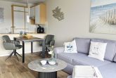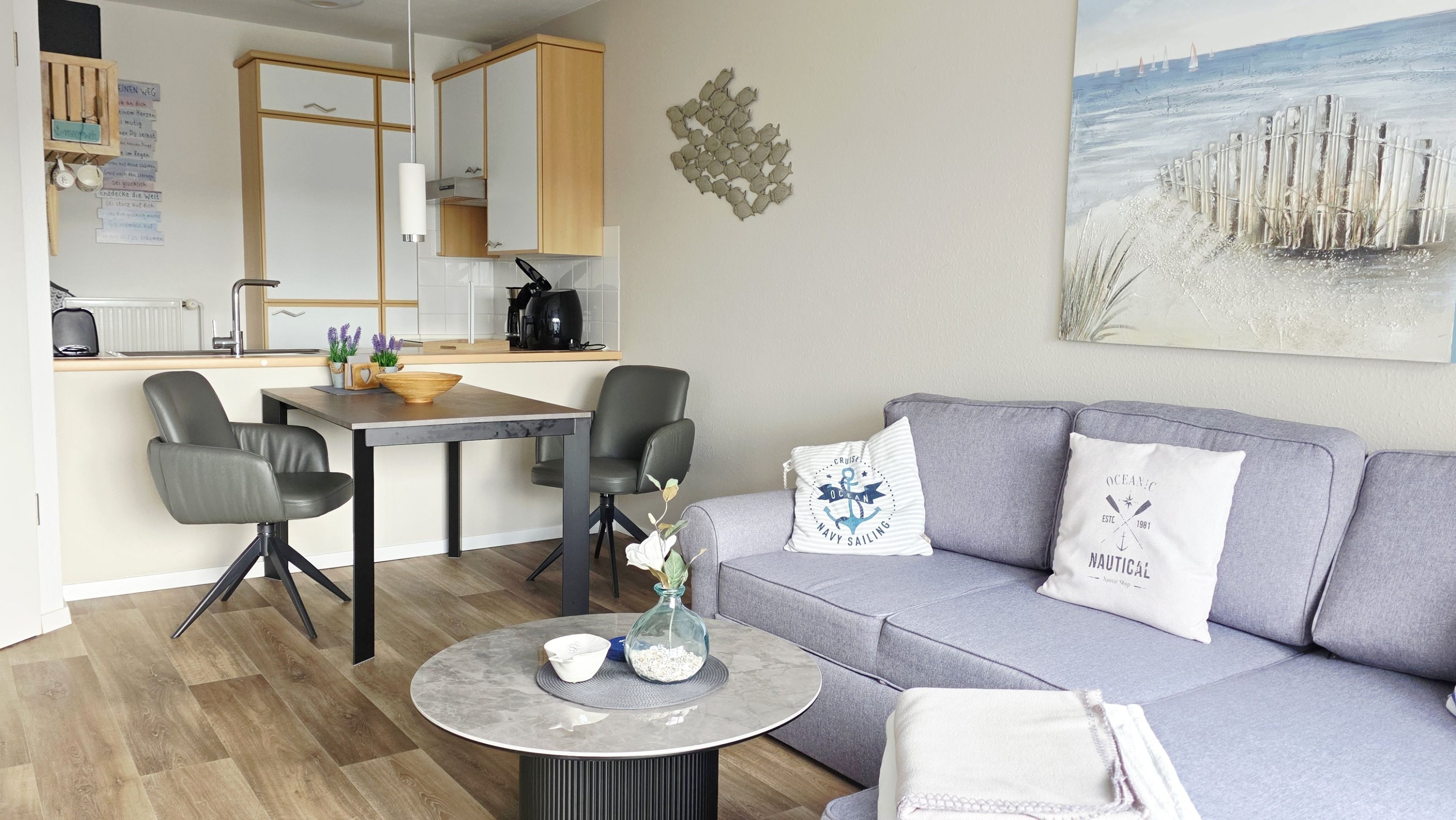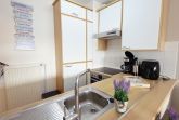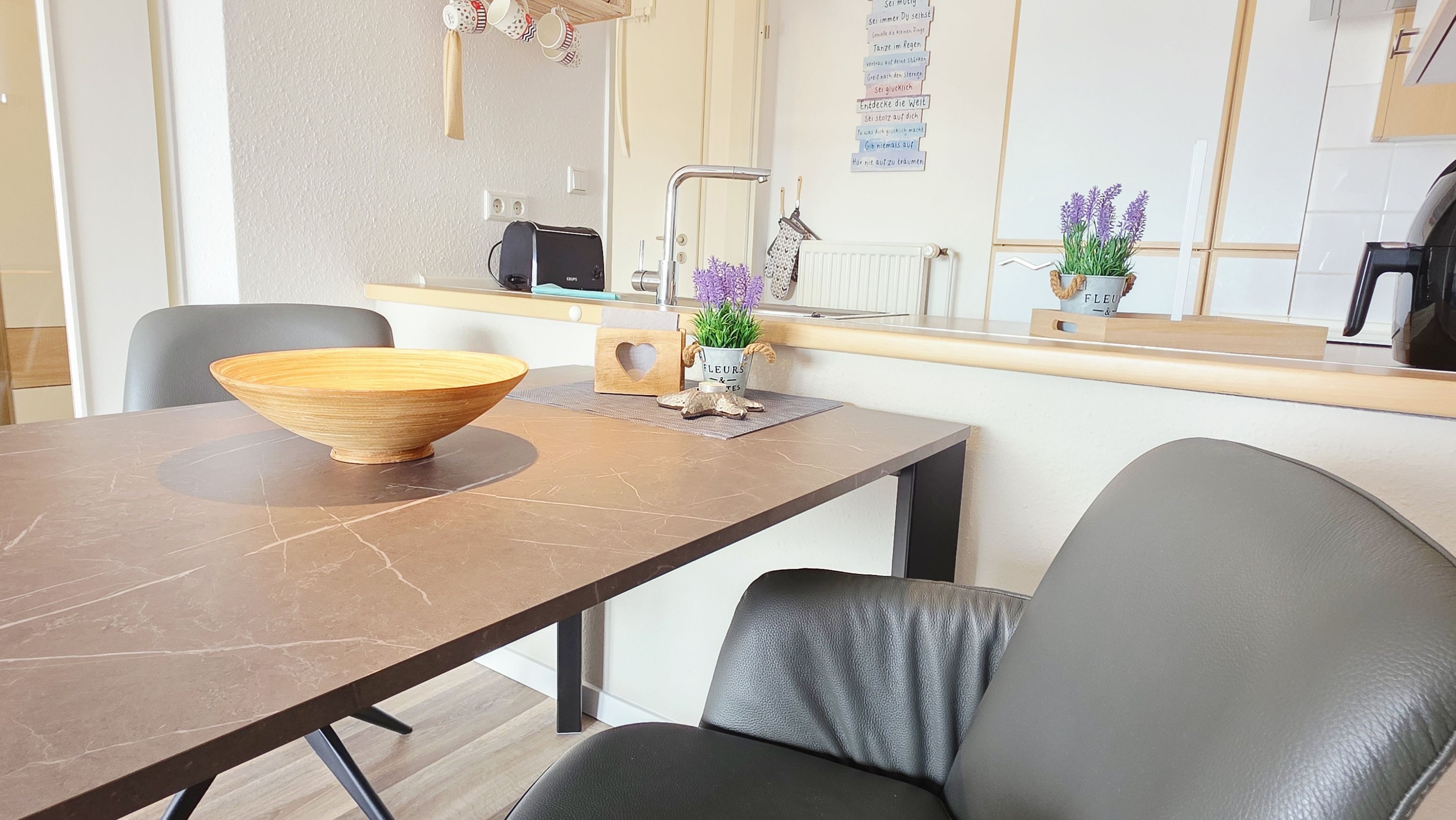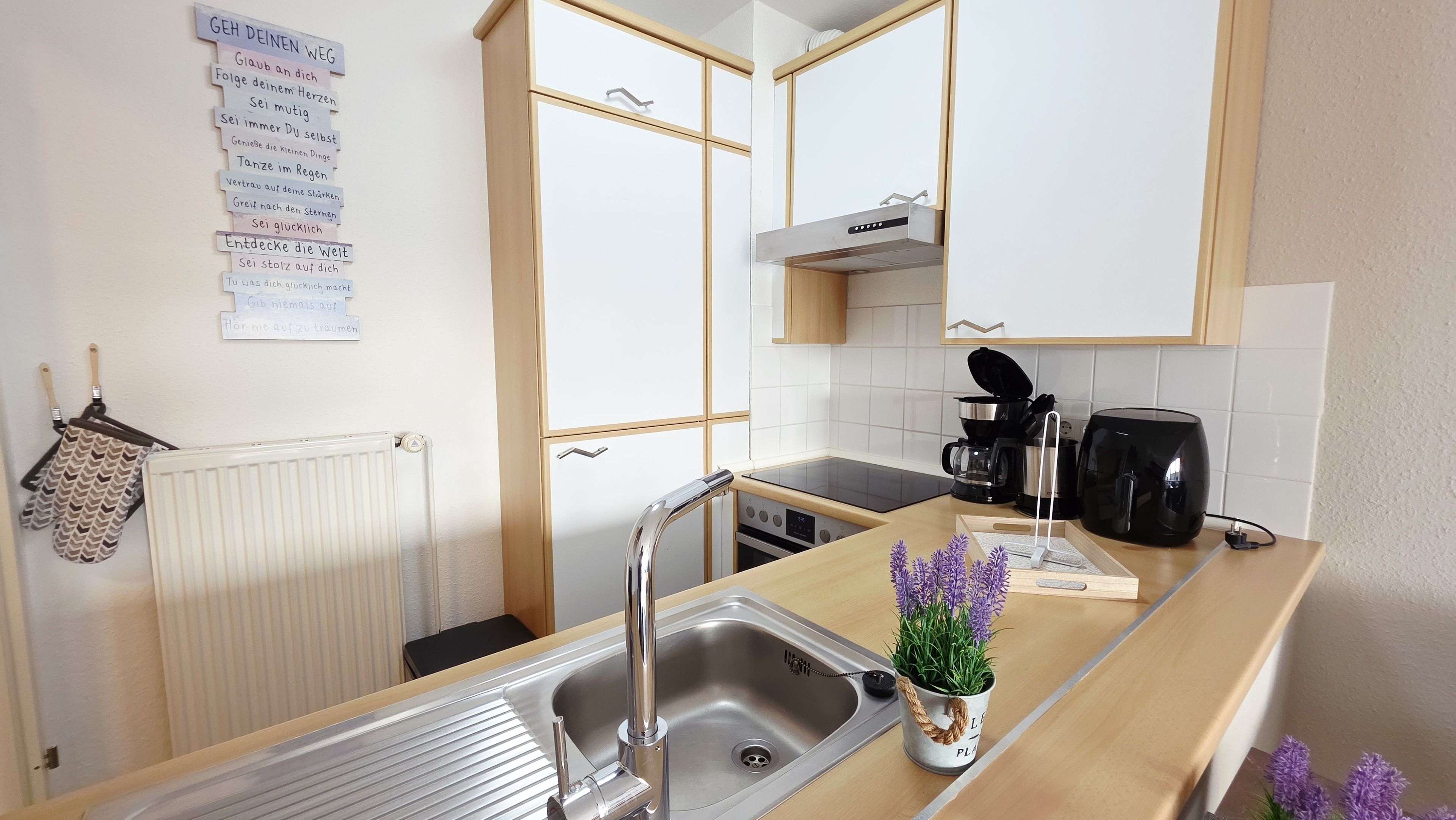 Die seitlich angrenzende, offene, moderne Einbauküche ist mit Backofen, Cerankochfeld, Geschirrspüler, Kühlschrank mit Gefrierfach, Airfryer (1 Korb) und allen üblichen Küchengeräten sehr gut ausgestattet.