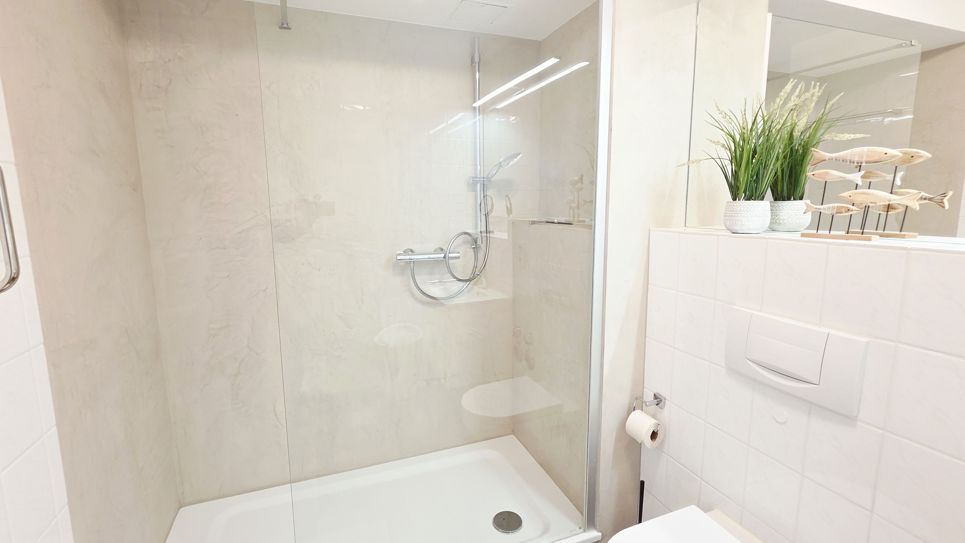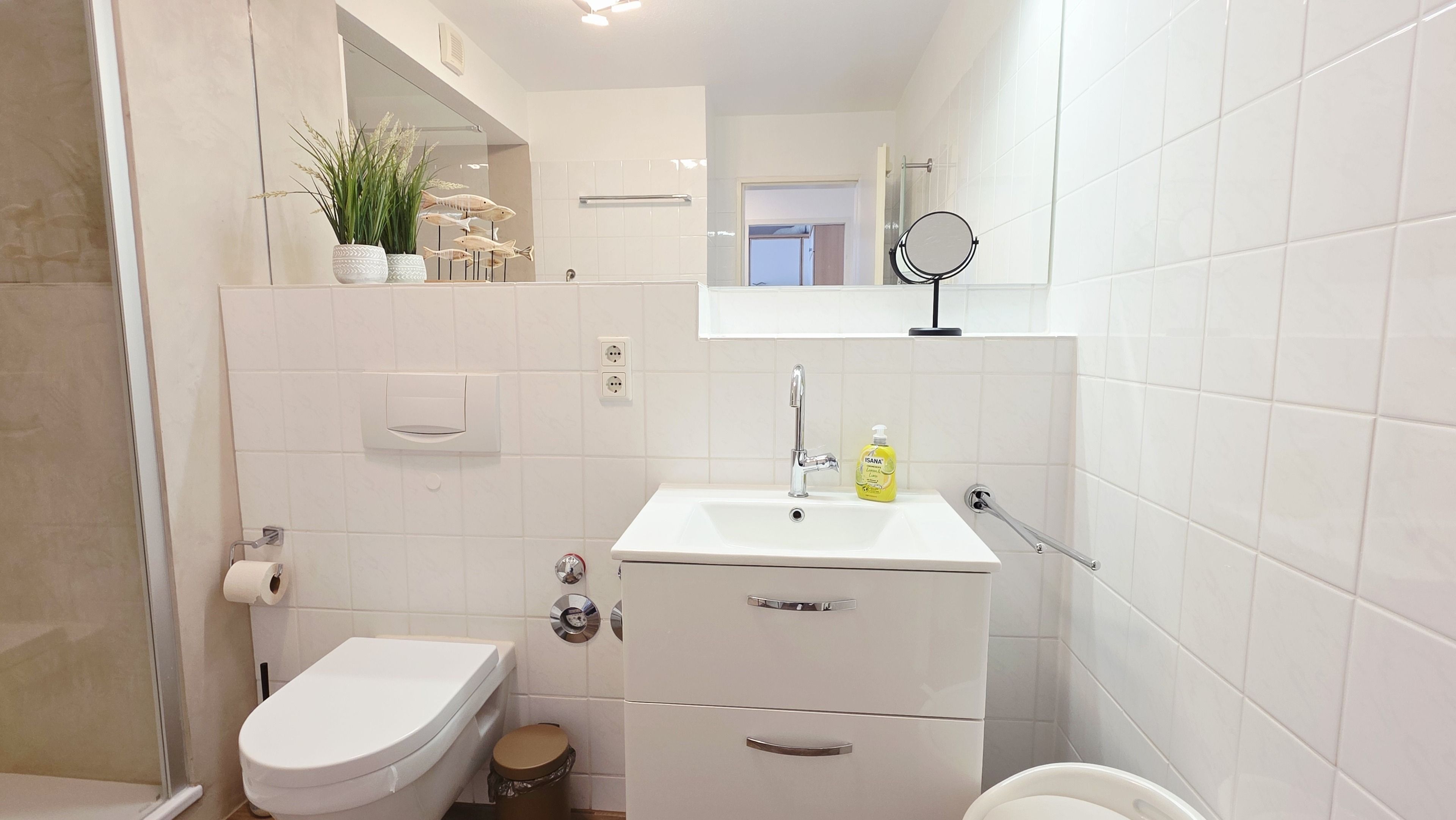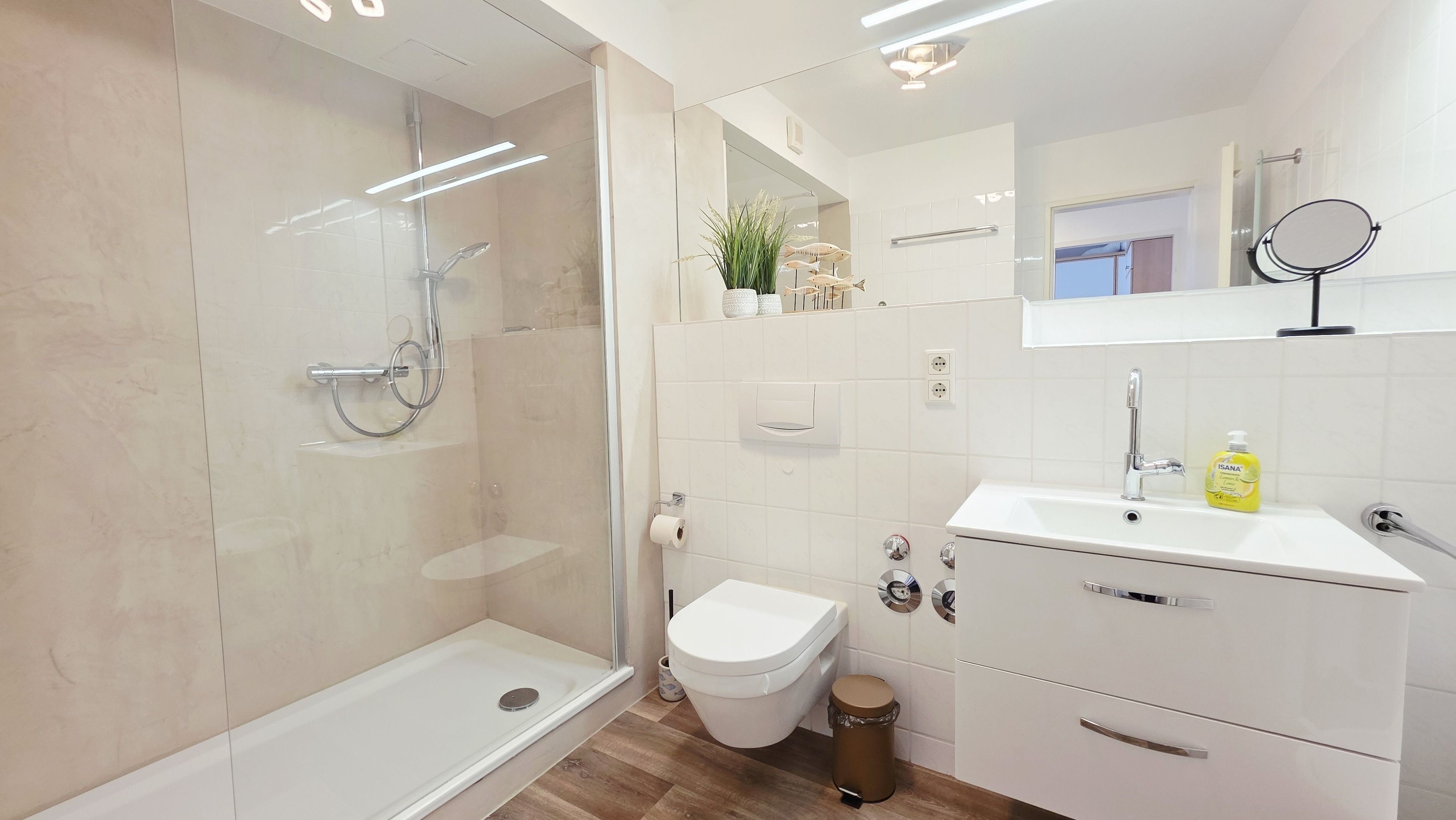 Das helle, innen liegende Badezimmer hat einen großzügig gestallteten Duschbereich mit Glastrennwand, modernen Waschtisch mit Unterschrank, Spiegelschrank und WC.