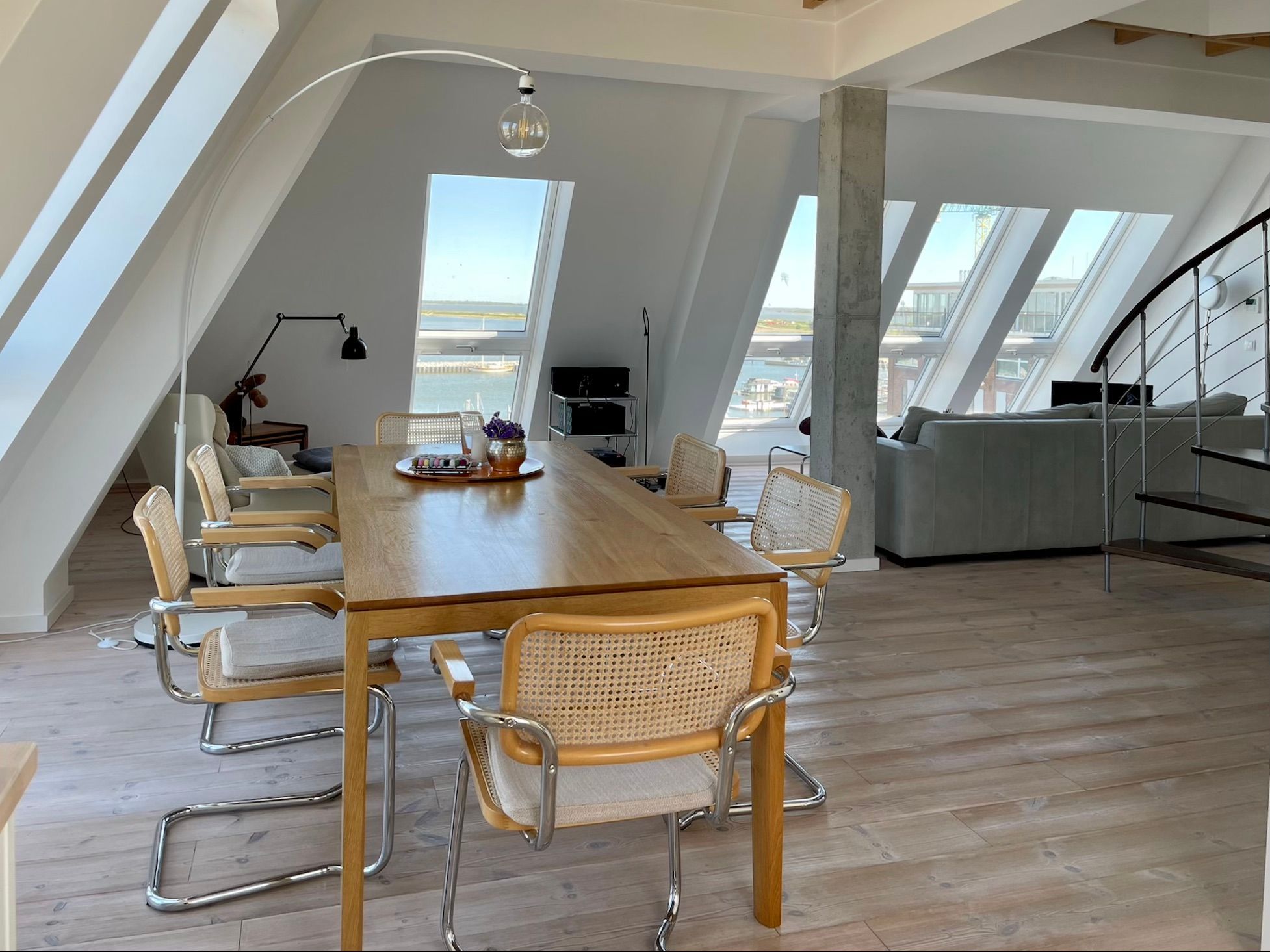Die Renovierung des denkmalgeschützten Speichers wurde 2021 abgeschlossen. Mit einem Aufzug erreichen Sie die Maisonette-Wohnung, die sich über zwei Ebenen erstreckt und Ihnen eine hochwertige, designorientierte Ausstattung bietet: