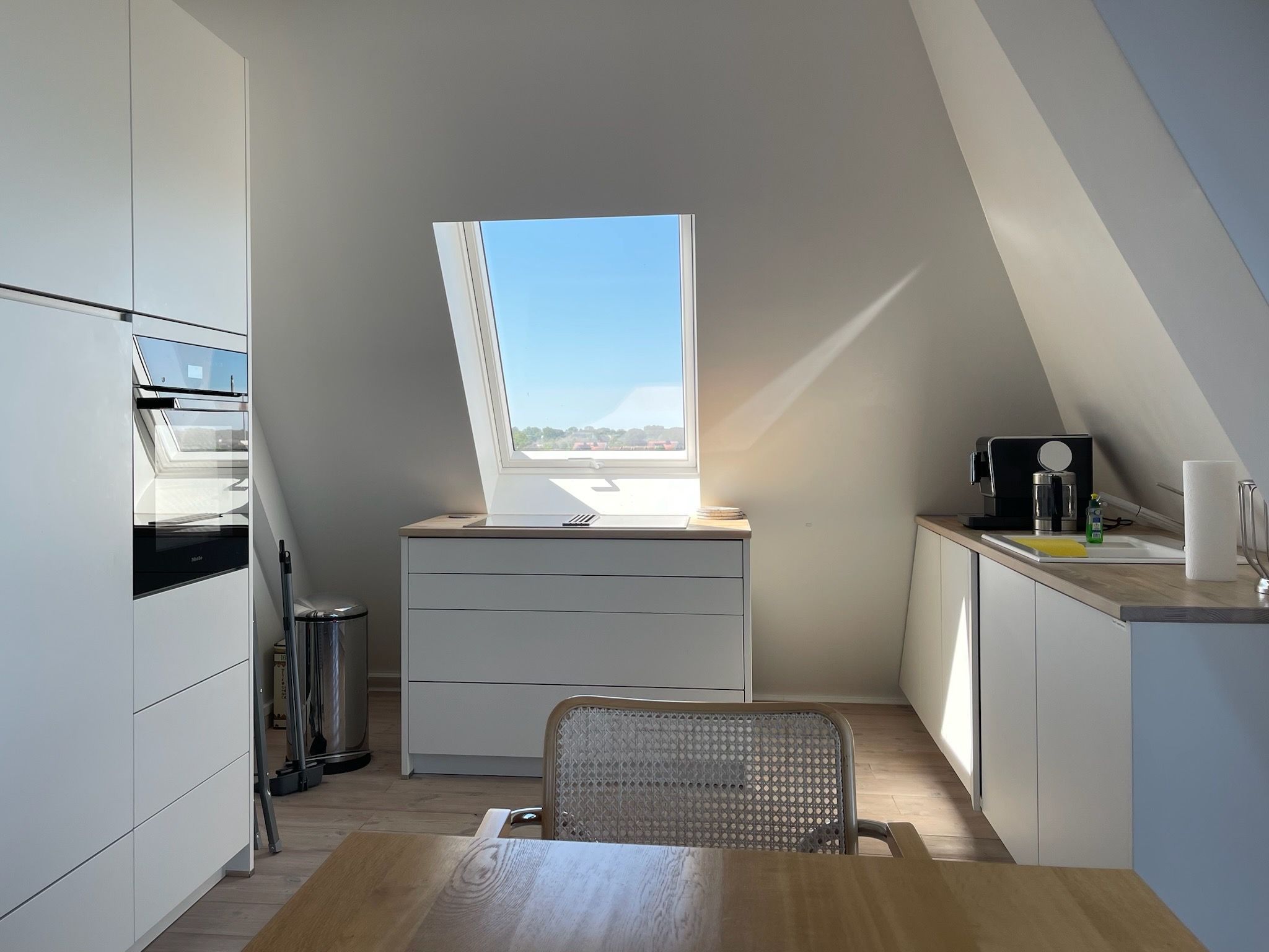 moderne offene Wohnküche mit Esstisch für vier Personen (Kaffeevollautomat mit Bohnen - vorrätig)