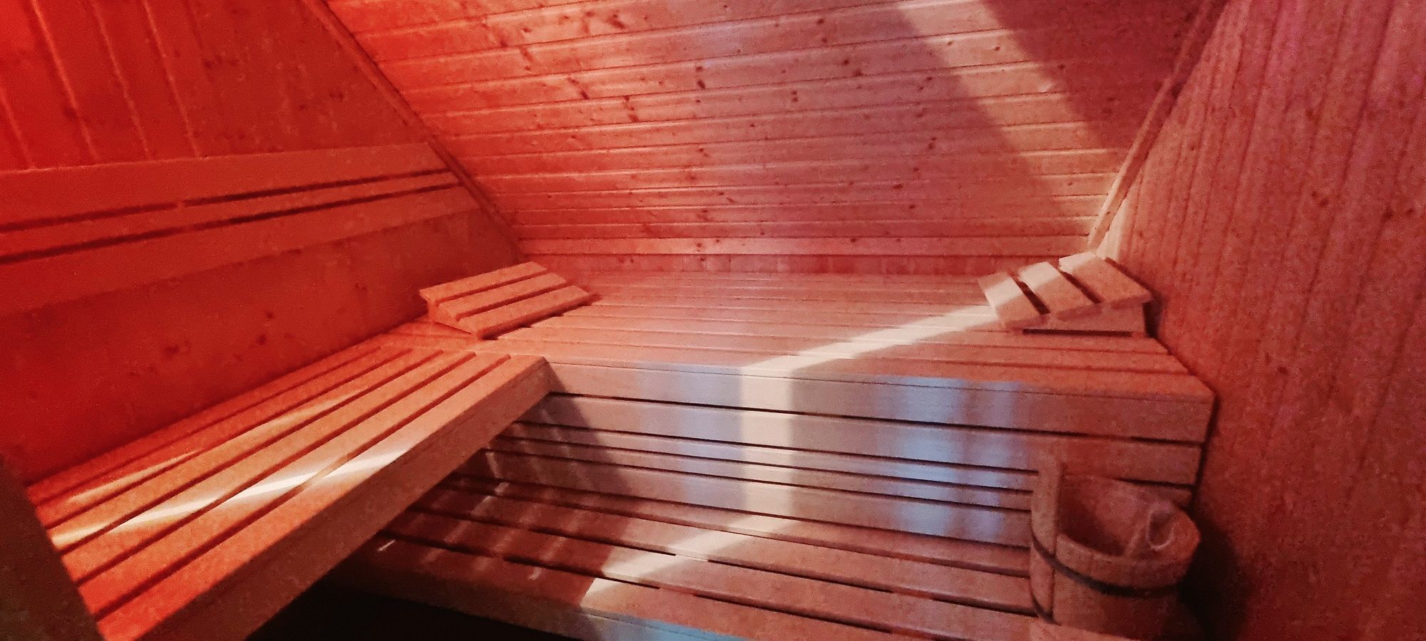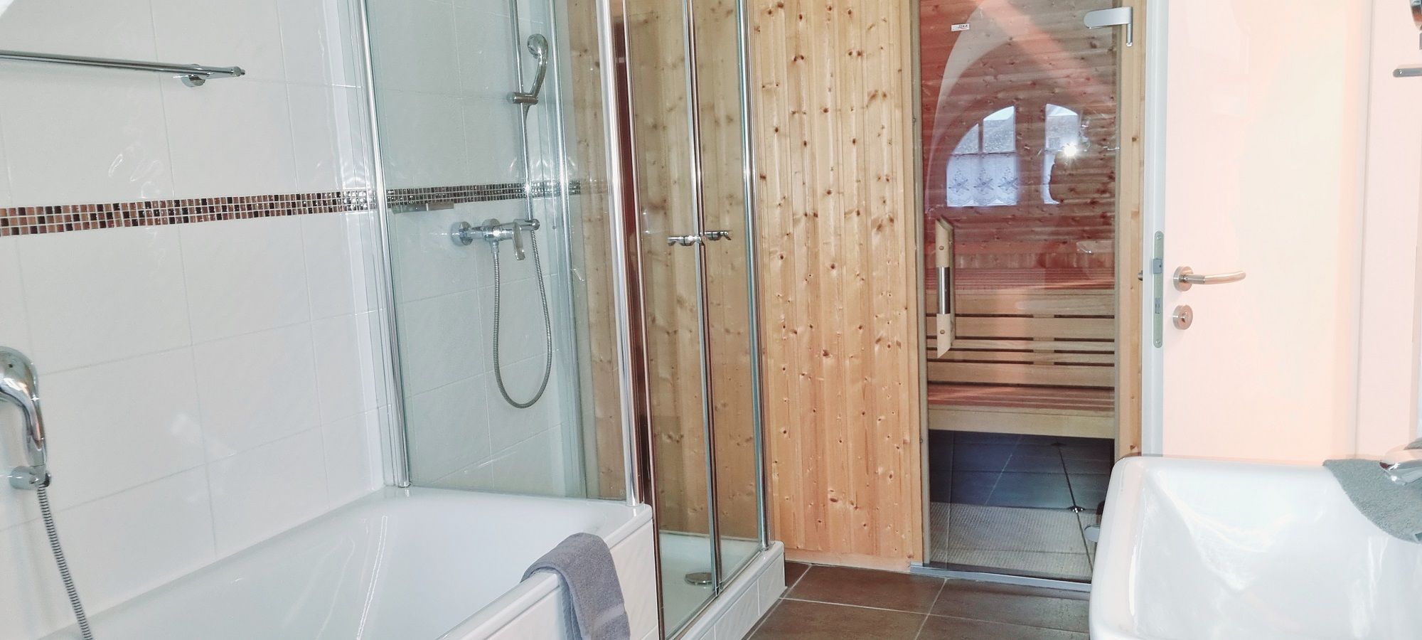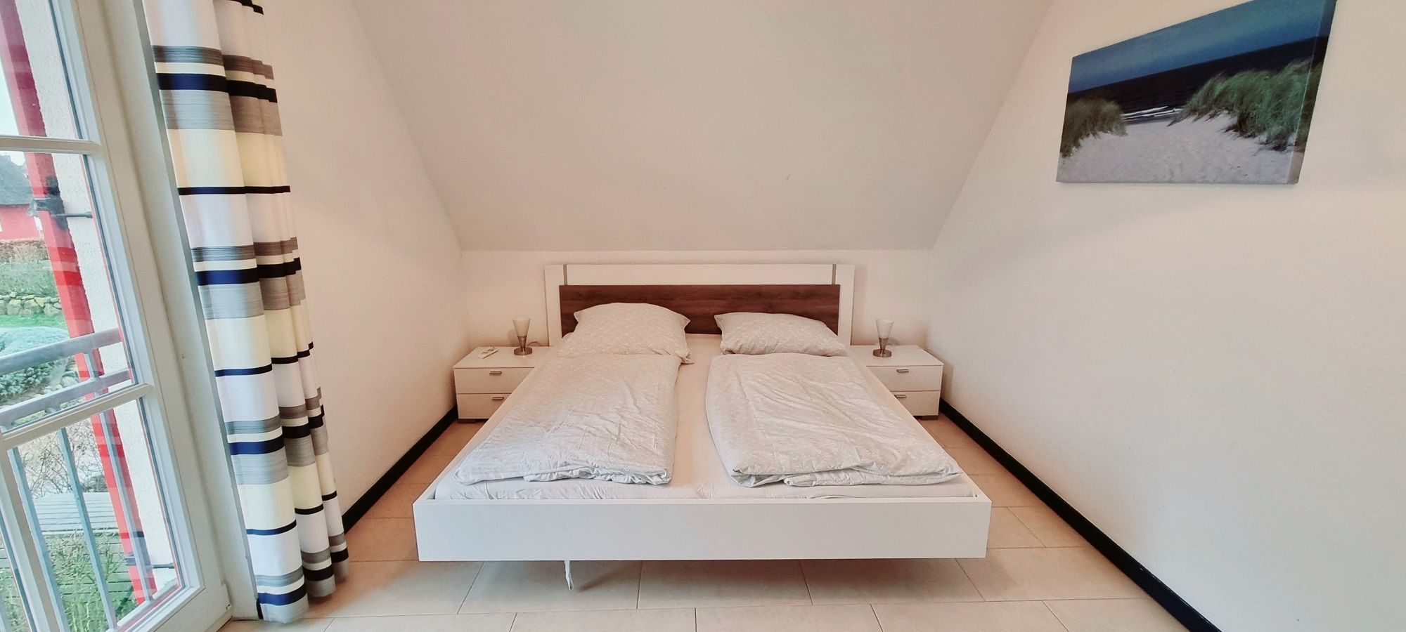Im Obergeschoss befindet sich das Elternschlafzimmer mit Doppelbett und das Vollbad mit Badewanne, Dusche und der Sauna.