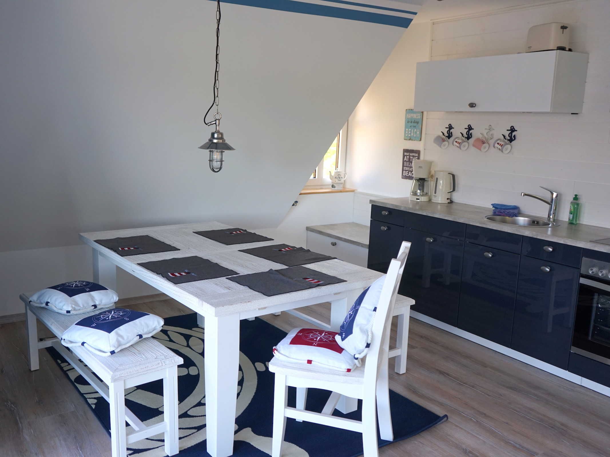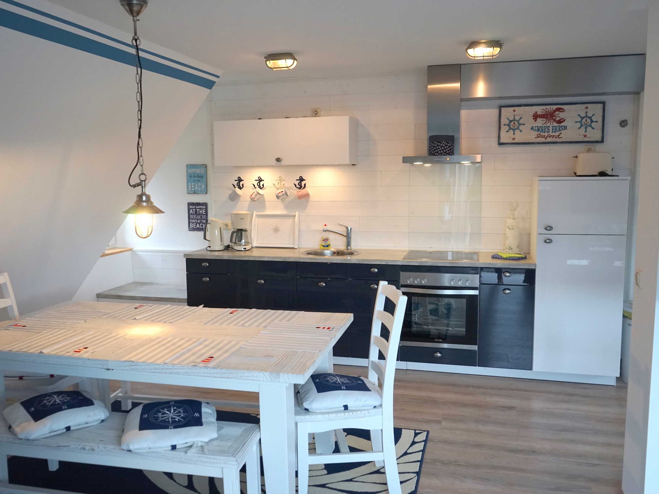 • Küche mit Kaffeemaschine, Toaster, Geschirrspüler, E-Herd, Kühlschrank