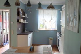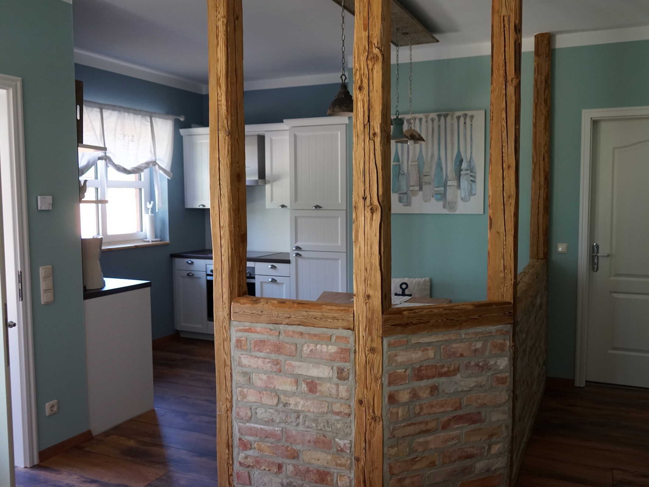 • Küche mit Kaffeemaschine, Toaster, Geschirrspüler, E-Herd, Kühlschrank