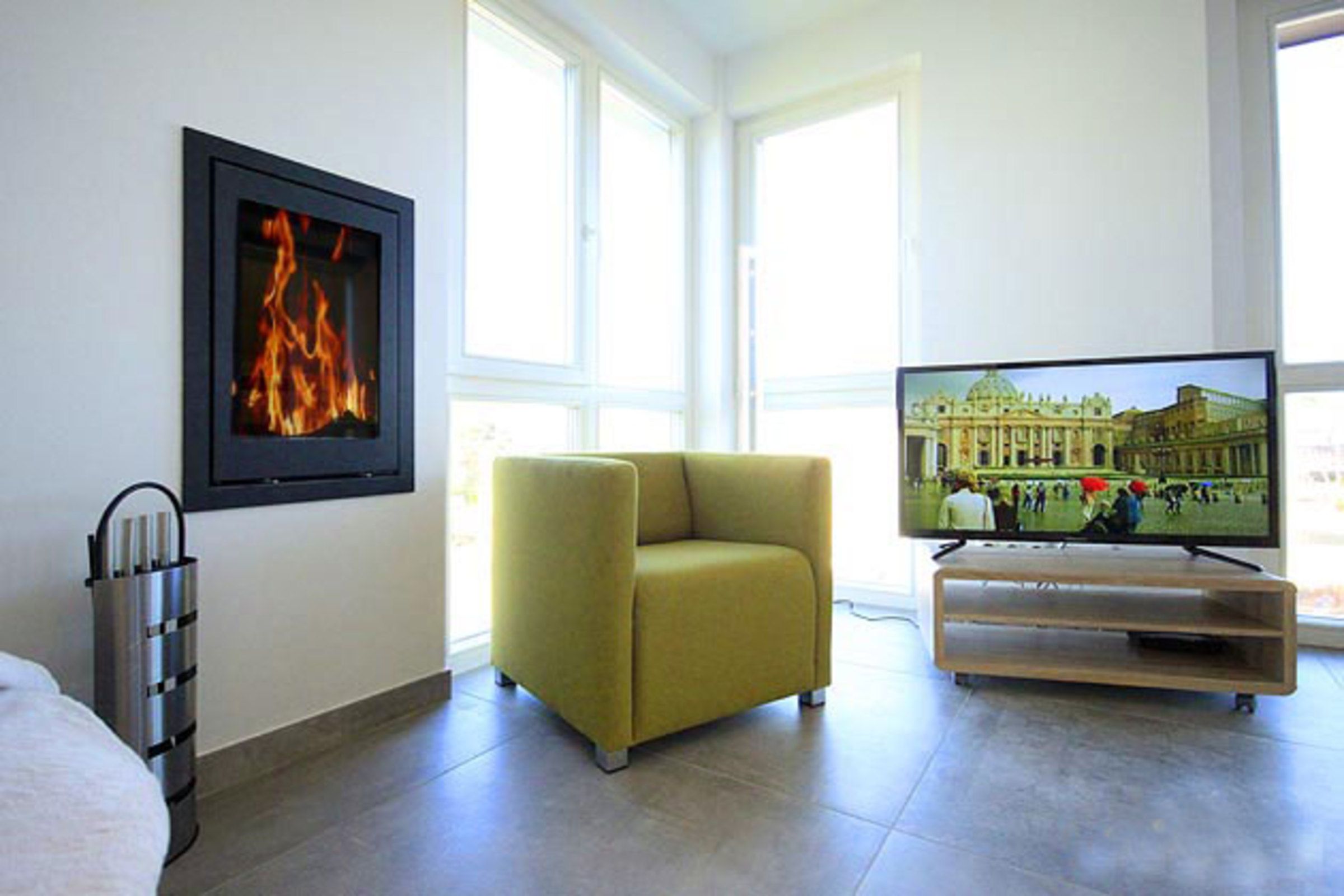 Die gesamte Wohnung ist stufenfrei und sehr hochwertig eingerichtet mit vielen kleinen Details. Besonders schön: Der Strandkorb auf der Balkonterrasse mit Blick zum Meer. Der großzugig geschnittene Wohn- und Essbereich verfügt über eine gemütliche Sofaecke, einen großen Flachbild-TV sowie einen modernen Kamin für kuschelige Abende.