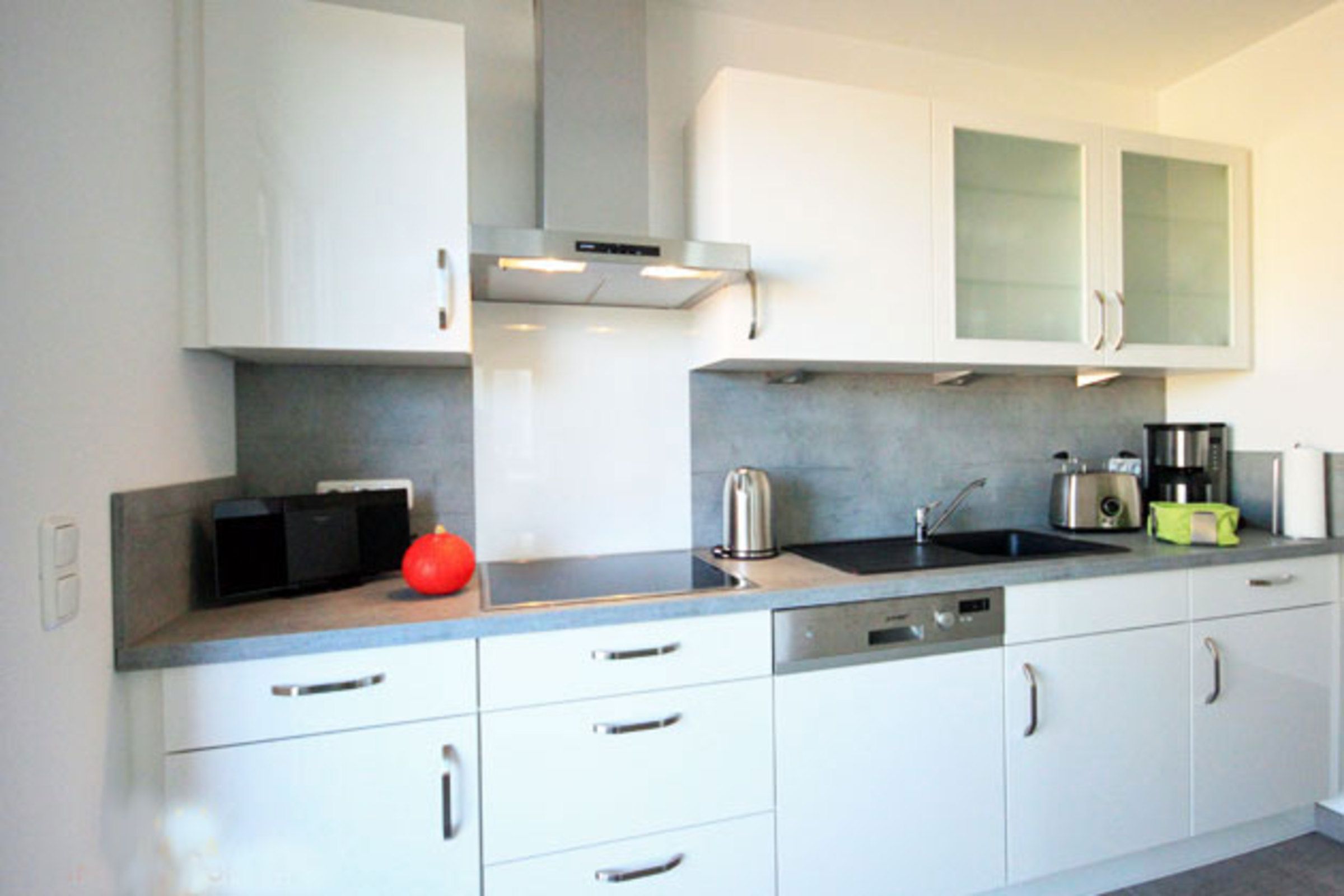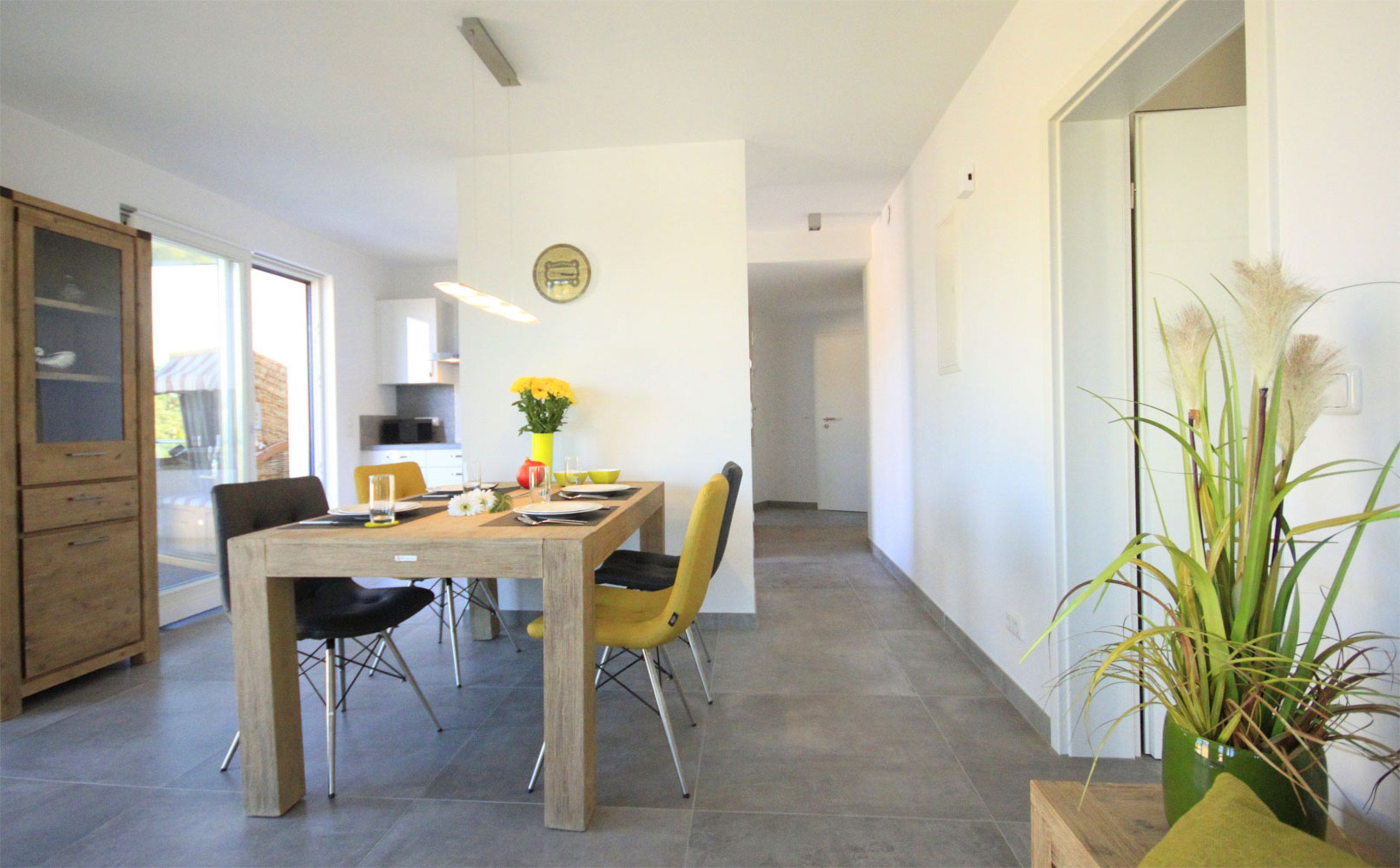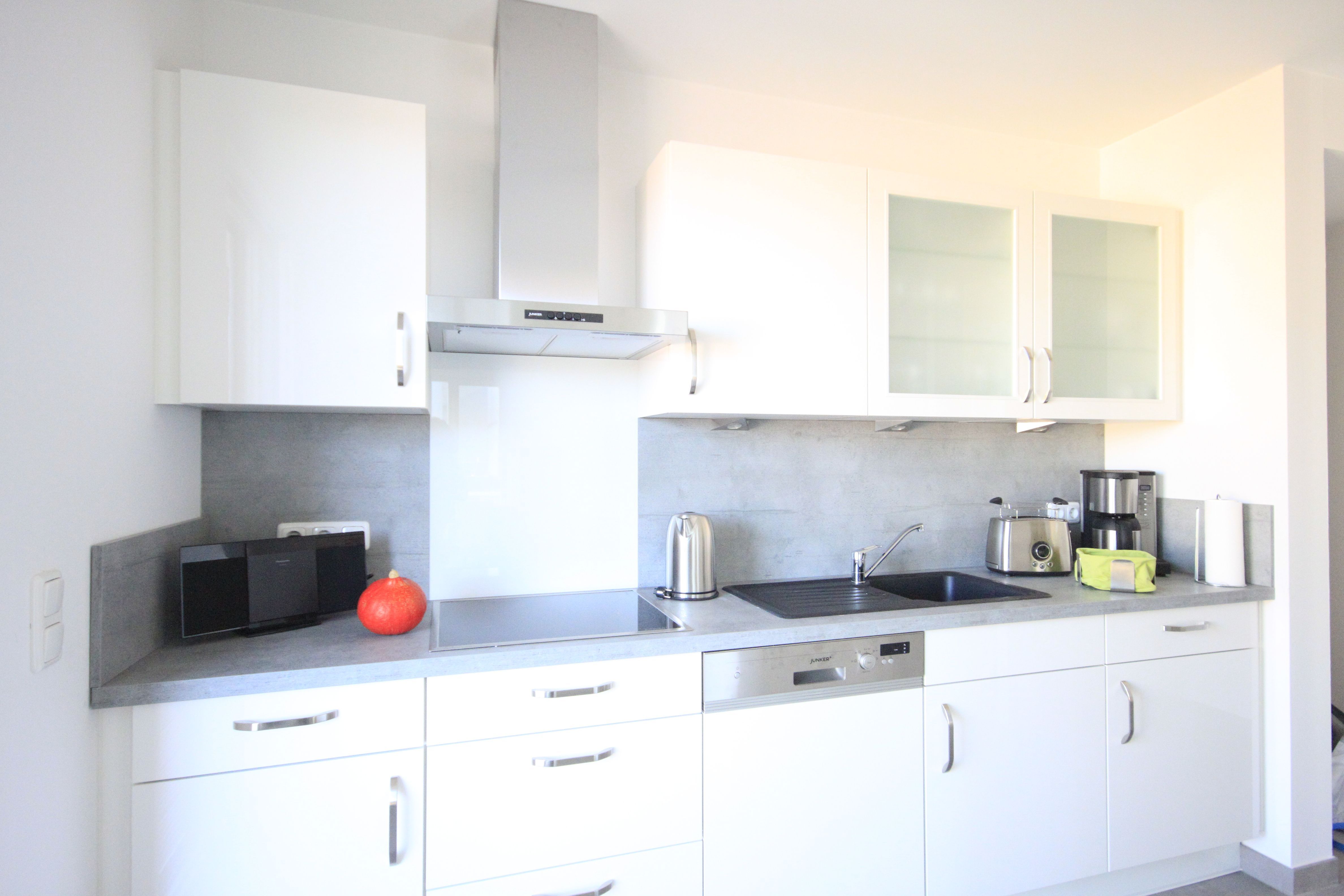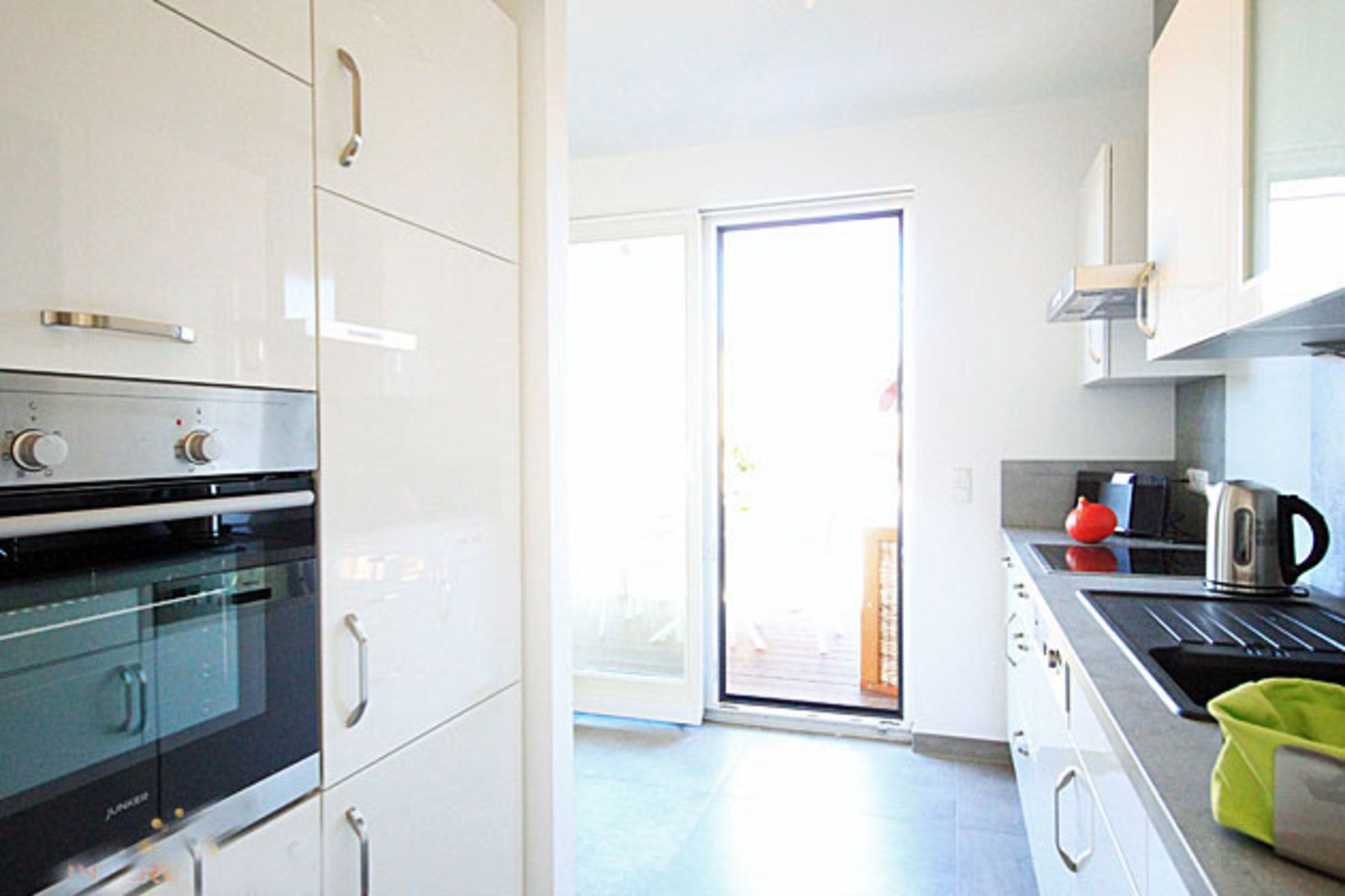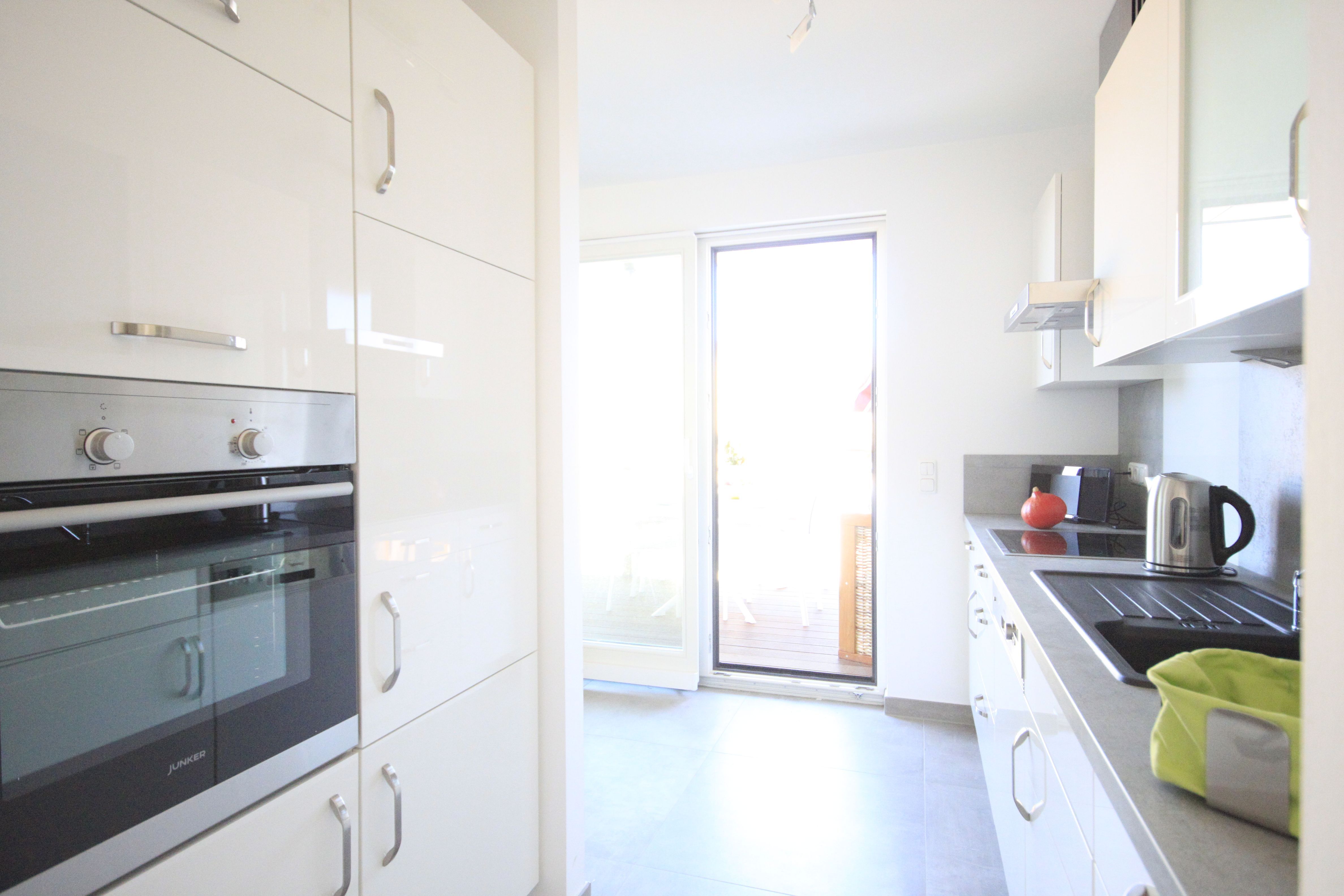 An den komfortablen Essbereich schließt sich die halb offene, voll ausgestattete Küche mit Induktionsherd und Geschirrspüler an. Aus der Küche betritt man den 9qm großen Balkon mit Strandkorb und Essplatz, hier bietet sich ein schöner Blick bis zum Meer.