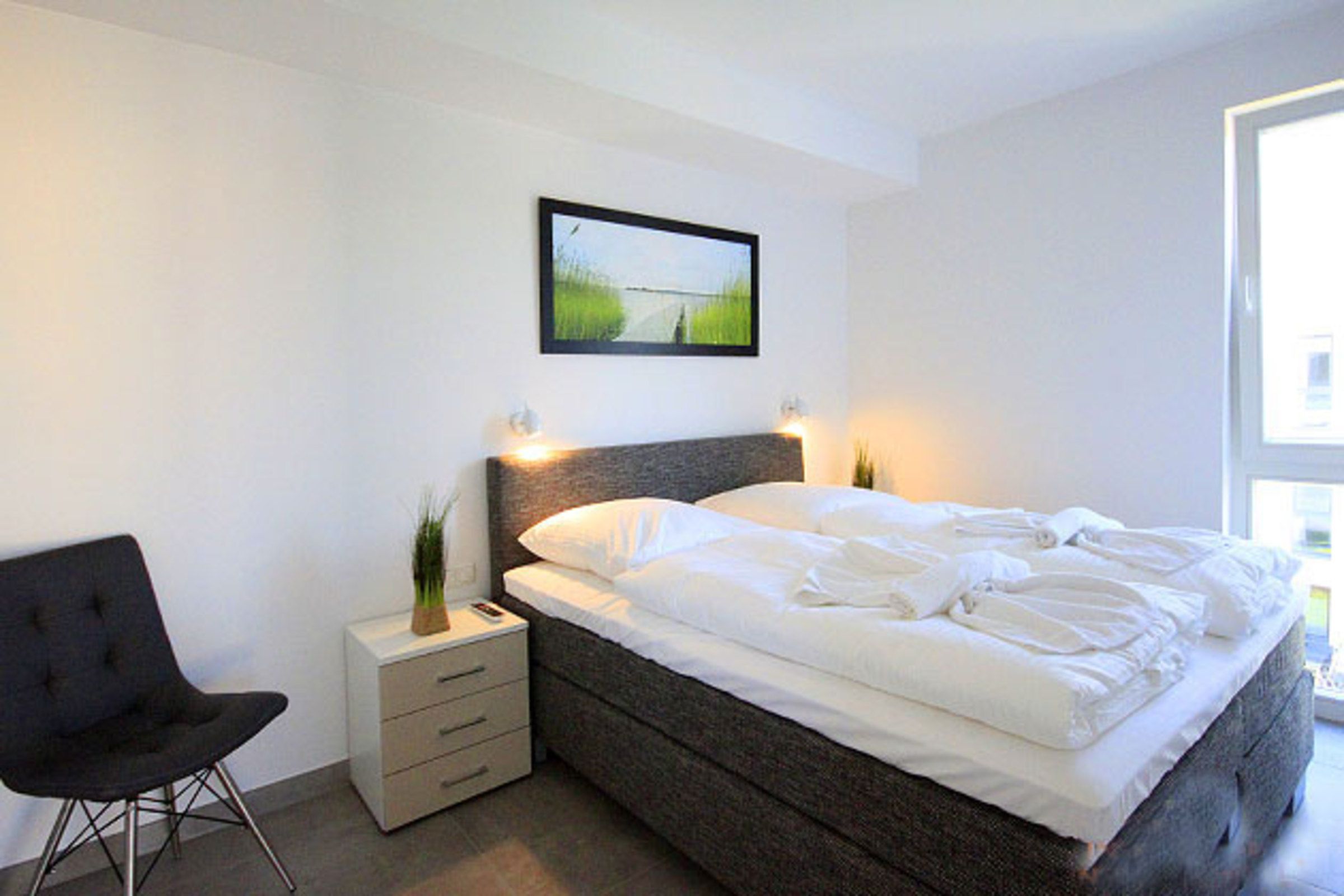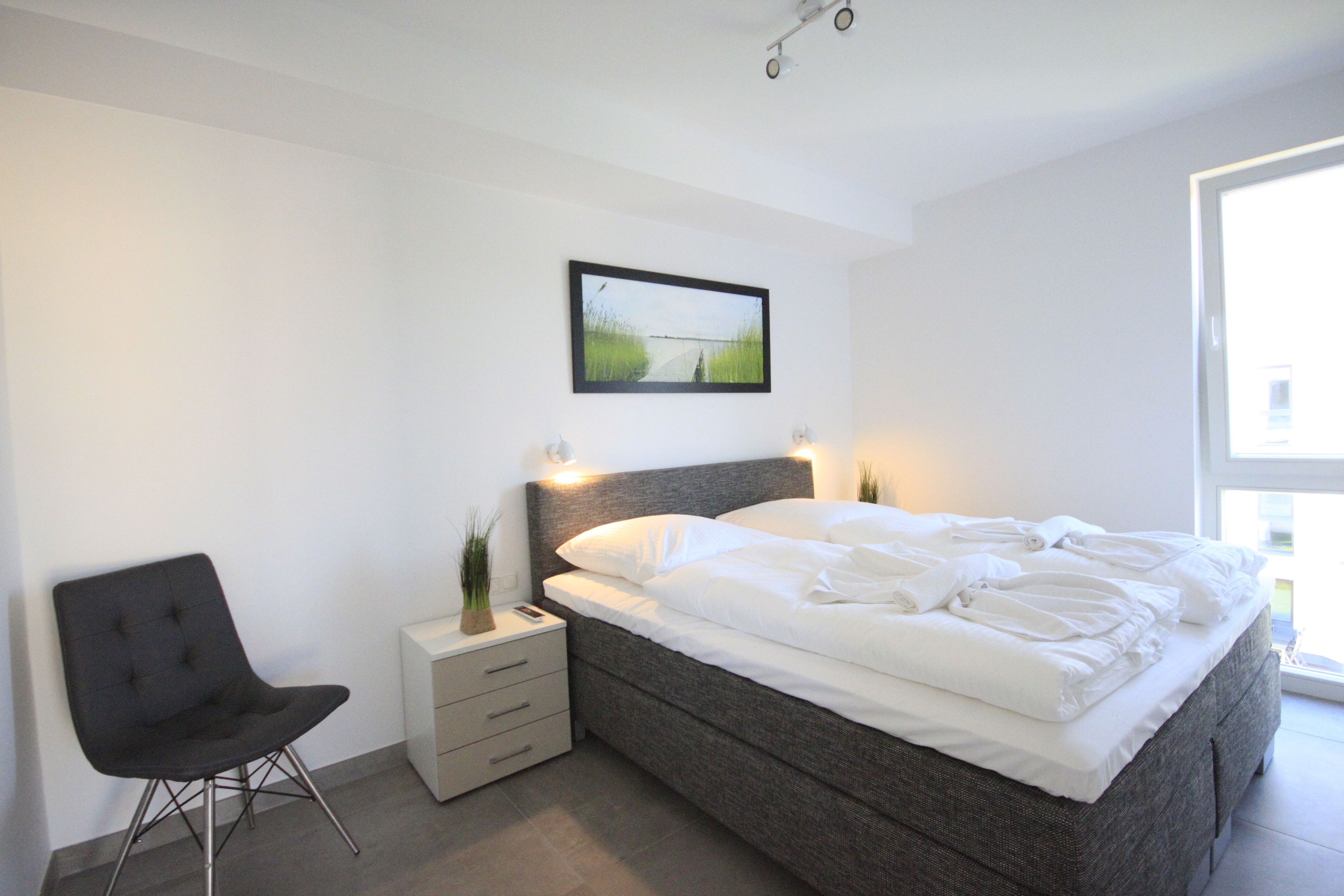 Die 72 qm große Wohnung ist wie folgt aufgeteilt: 1 Schlafzimmer mit Doppelbett (Boxspringbett), Flachbild-TV und DVD Player, 1 Schlafzimmer mit zwei Einzelbetten, die jedoch auch zu einem Doppelbett zusammengeschoben werden können. Auch hier gibt es einen Flachbildfernseher. In beiden Schlafzimmern befindet sich ein großer Kleiderschrank. Das Badezimmer ist das Highlight der Wohnung: Hier befindet sich neben der Whirlpool-Wanne (Jaccuzzi) und der ebenerdigen Dusche auch eine Sauna.