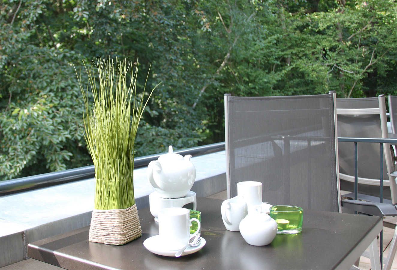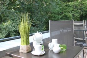 Der Balkon mit Blick ins Grüne verfügt über zwei Sitzplätze.