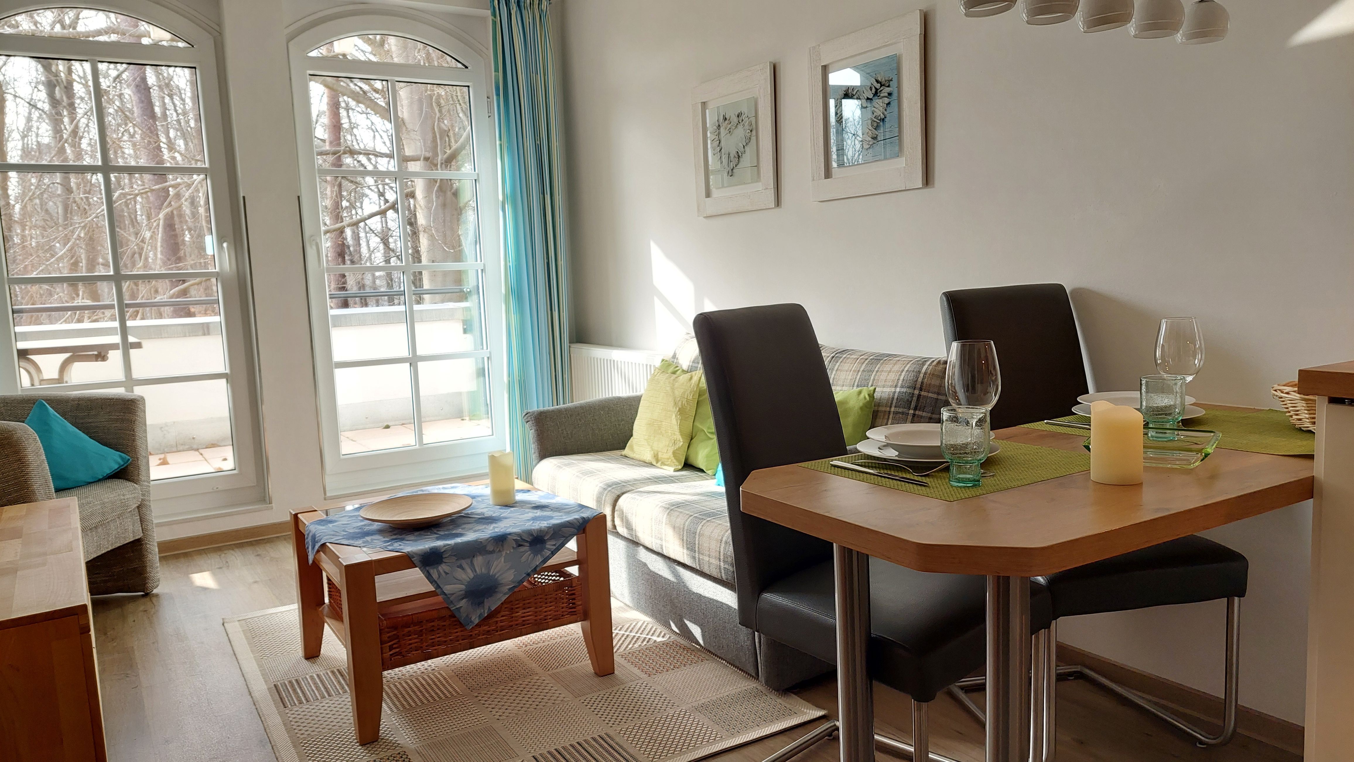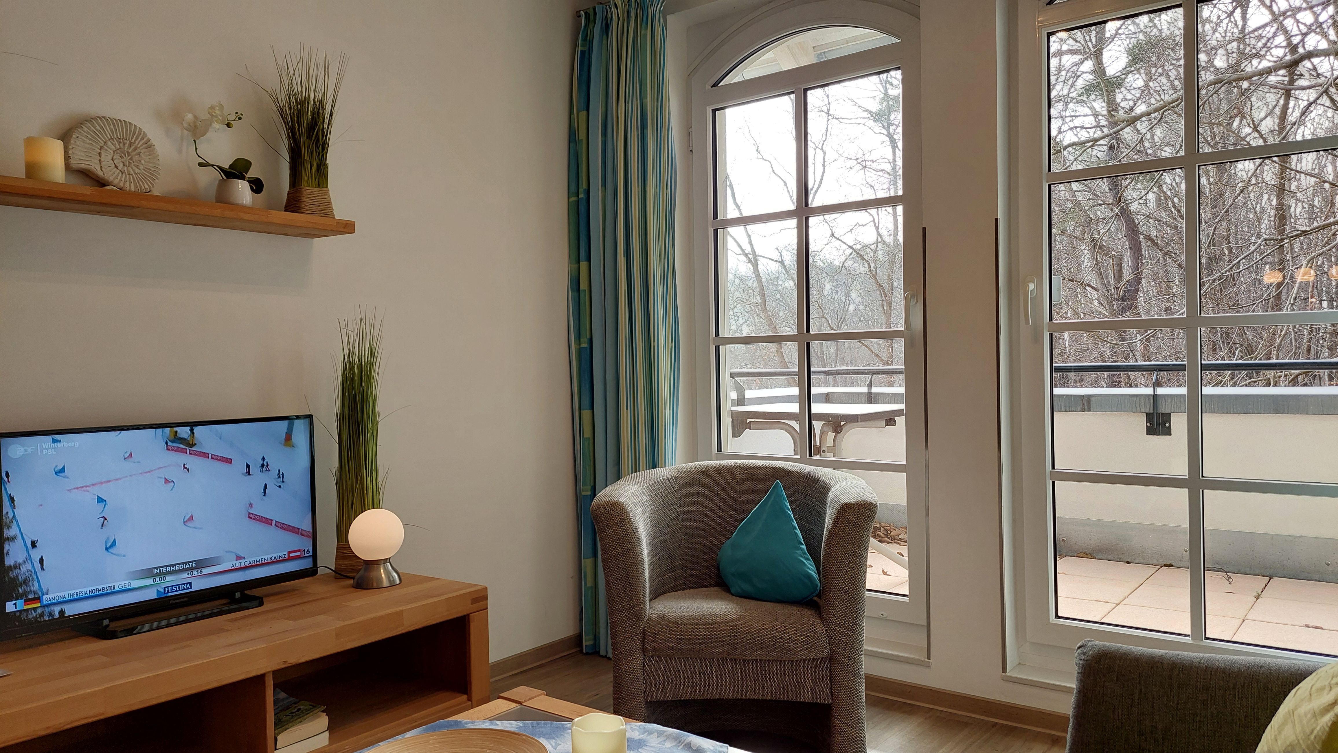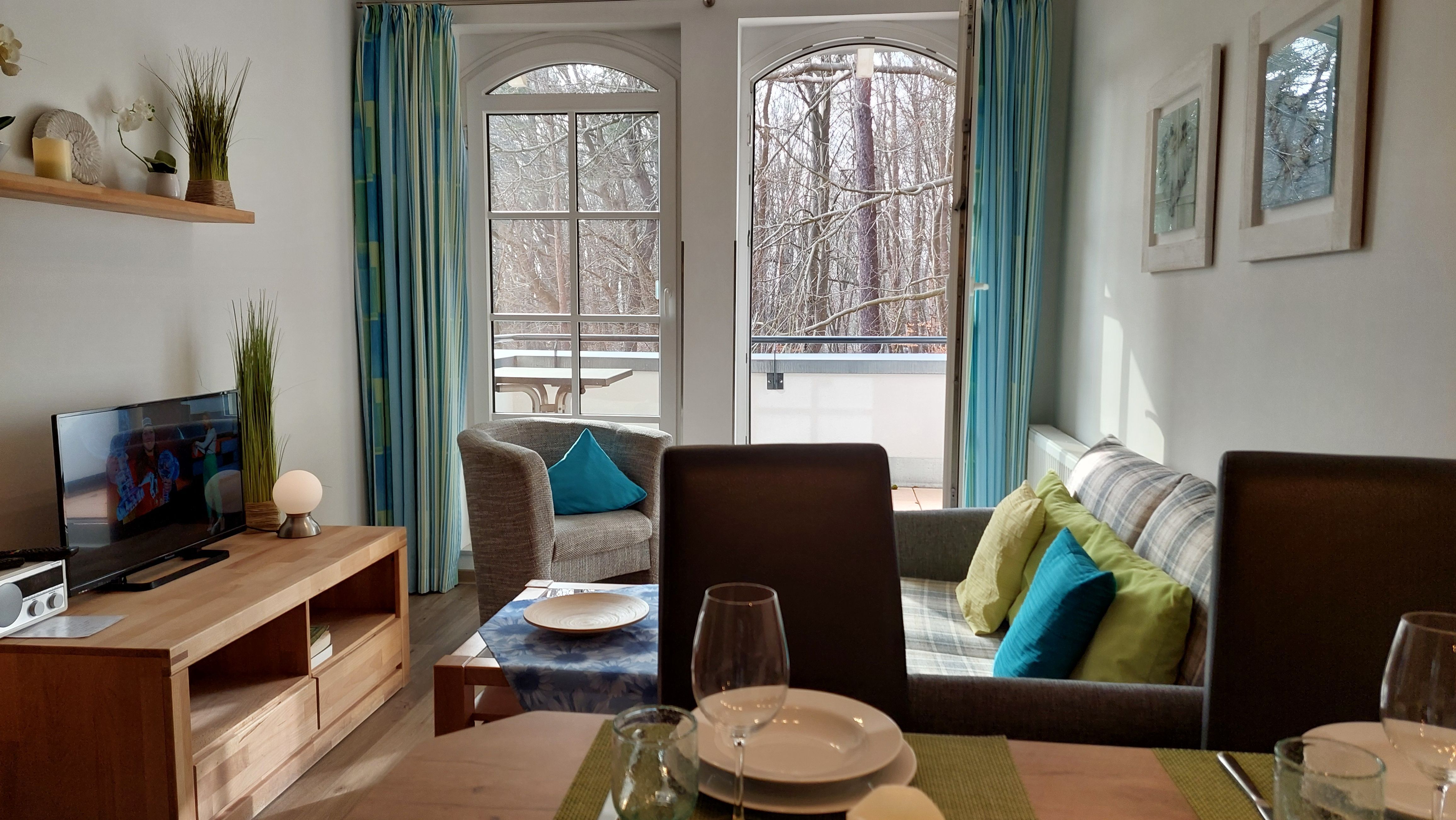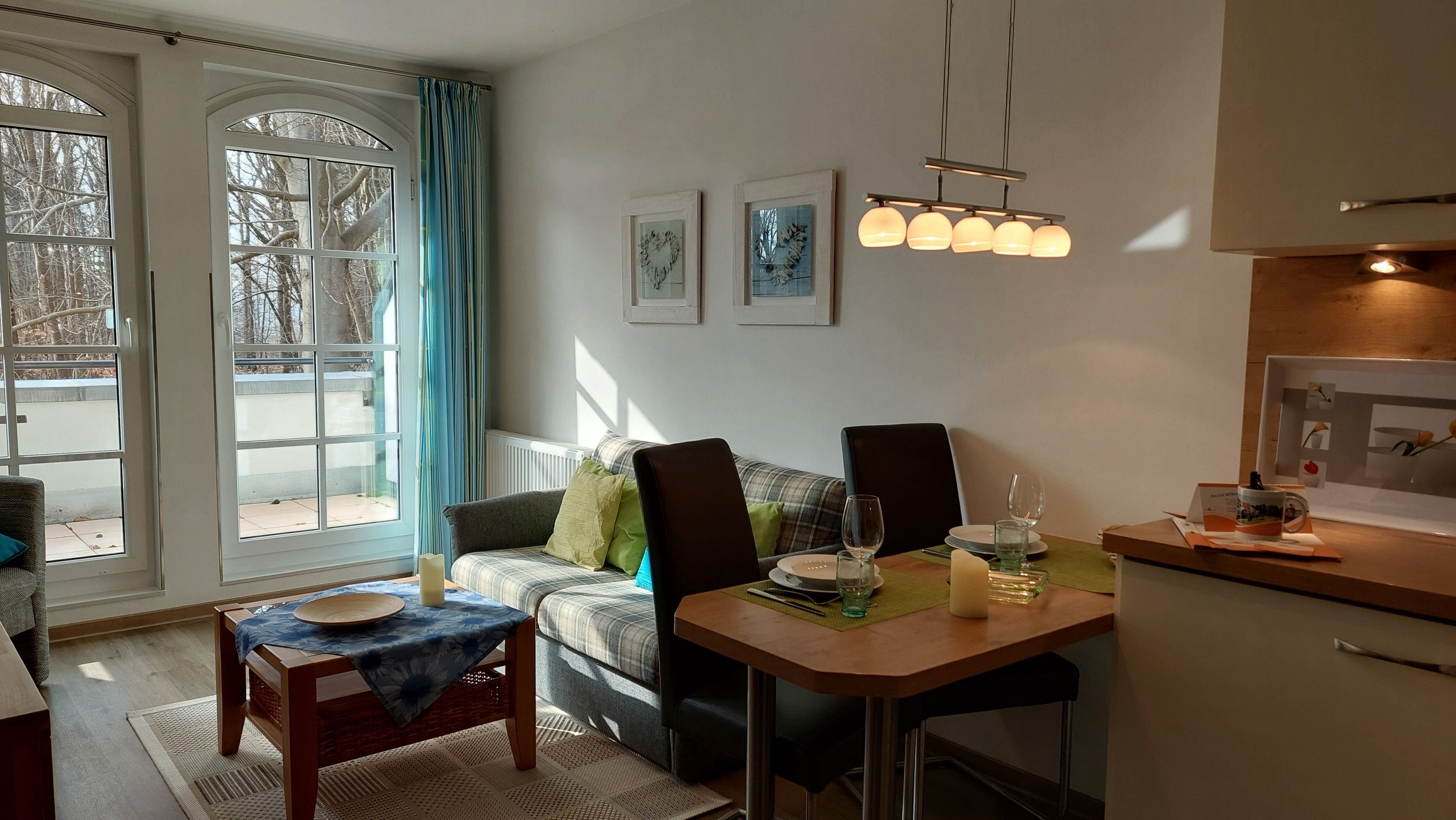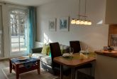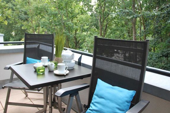 Kleine aber feine Ferienwohnung für 3 Personen mit Balkon und schönen Blick ins Grüne. Die Ferienwohnung liegt in der 3. Etage vom Haus Meeresblick. Das erst 2013 neu eröffnete Haus Meeresblick mit Schwimmbad, Massage- und Saunabereich liegt direkt am Strand von Baabe.