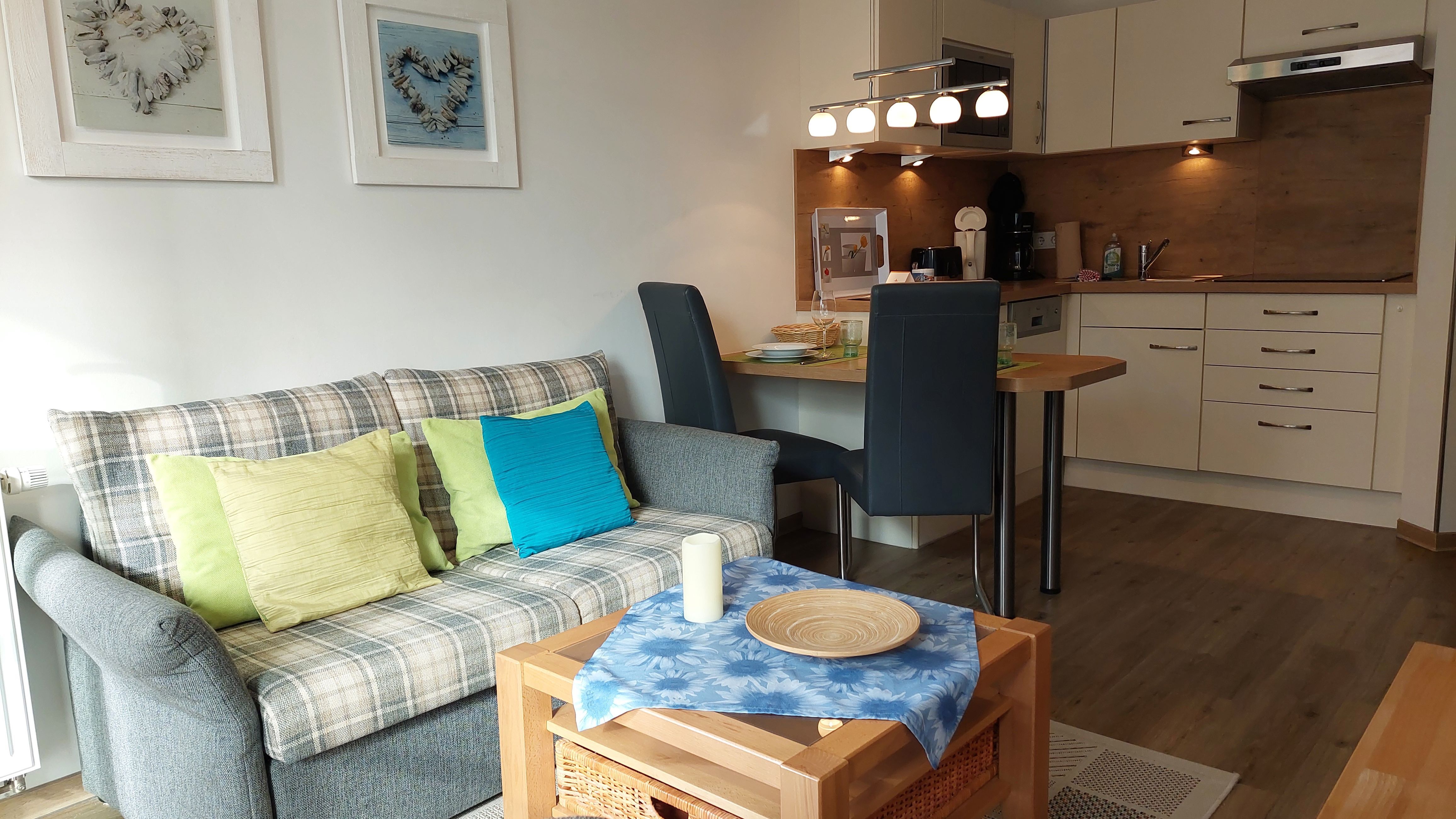 Hell, freundlich und Platz für 2-3 Personen: Die Nichtraucher-Ferienwohnung Strandkrabbe hat ein separates Schlafzimmer mit Doppelbett sowie ein Schlafsofa für eine dritte Person im Wohn- und Essbereich. Dort steht Ihnen auch der Fernseher sowie eine gut ausgestattete Küchenzeile zur Verfügung. Sie hat einen 4-Plattenherd, eine Spülmaschine, einen Kühlschrank mit Gefrierfach, eine Mikrowelle, eine Kaffeemaschine und einen Toaster.