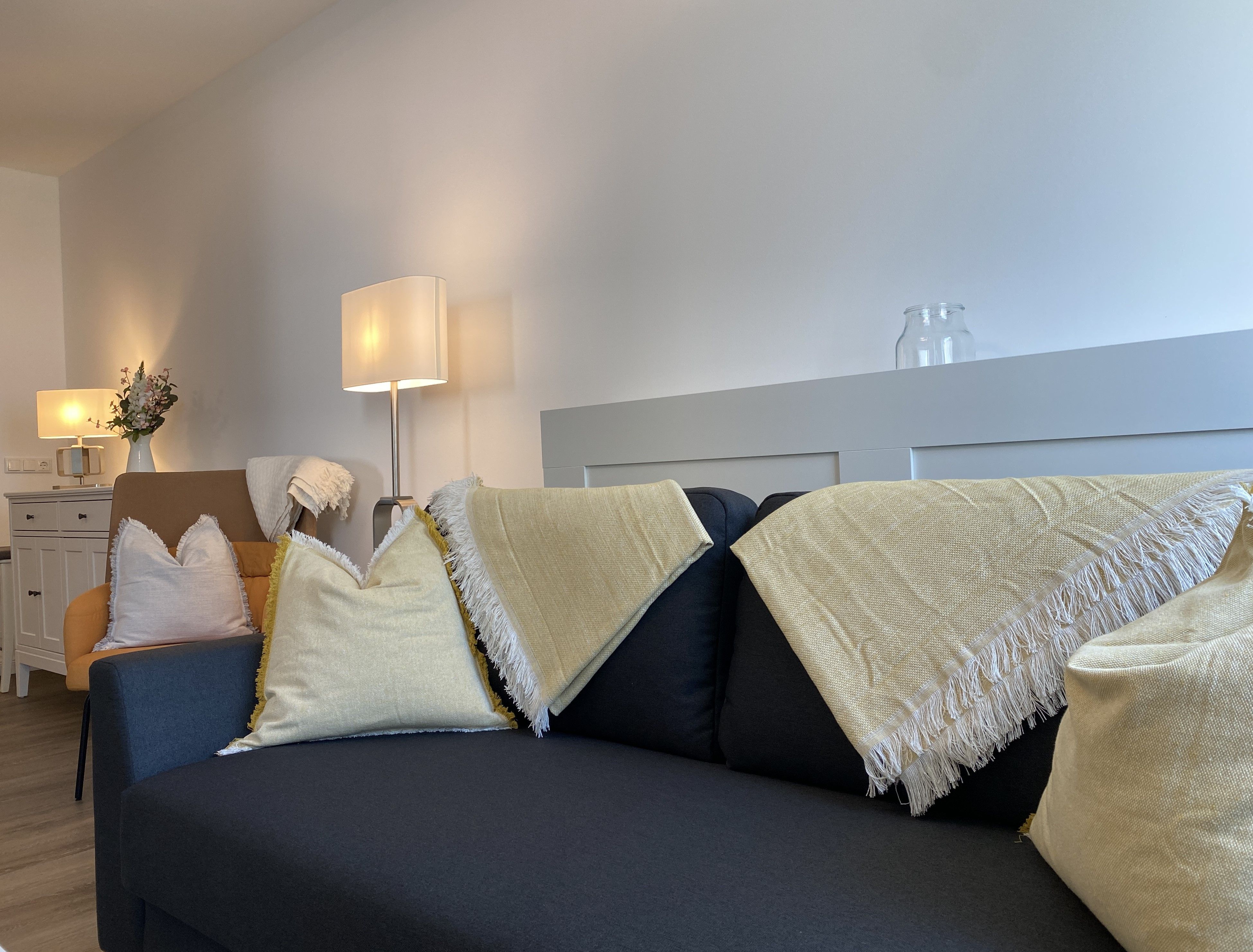 Im Wohnzimmer eine super bequeme Bruno-Schlafcouch mit Taschenfederkernmatratze zum ausziehen und einer Liegefläche von 180 x 200 cm. TV, Ohrensessel und Stubentisch laden zum verweilen ein.