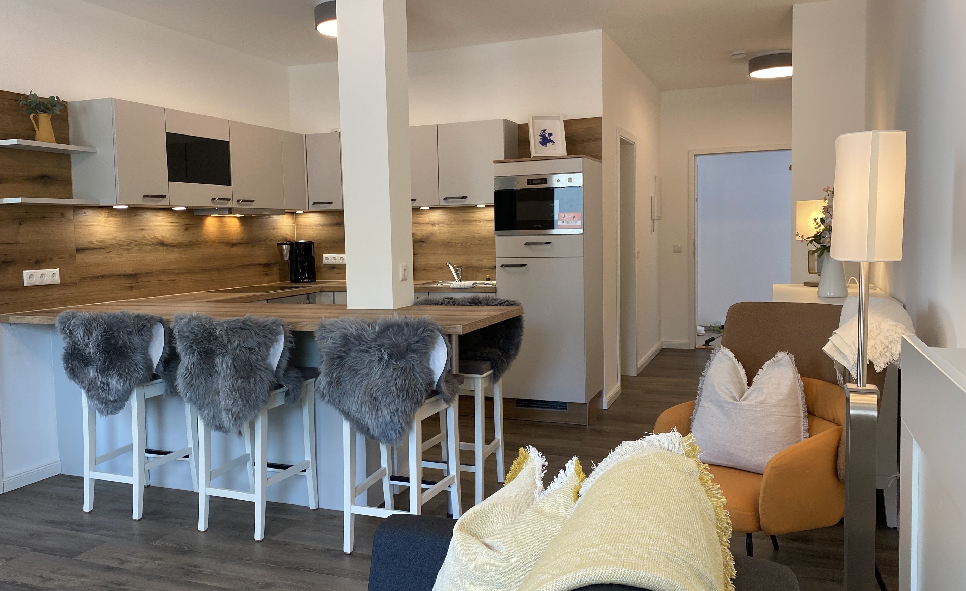 Große Wohküche mit Sitztresen für bis zu 6 Personen.