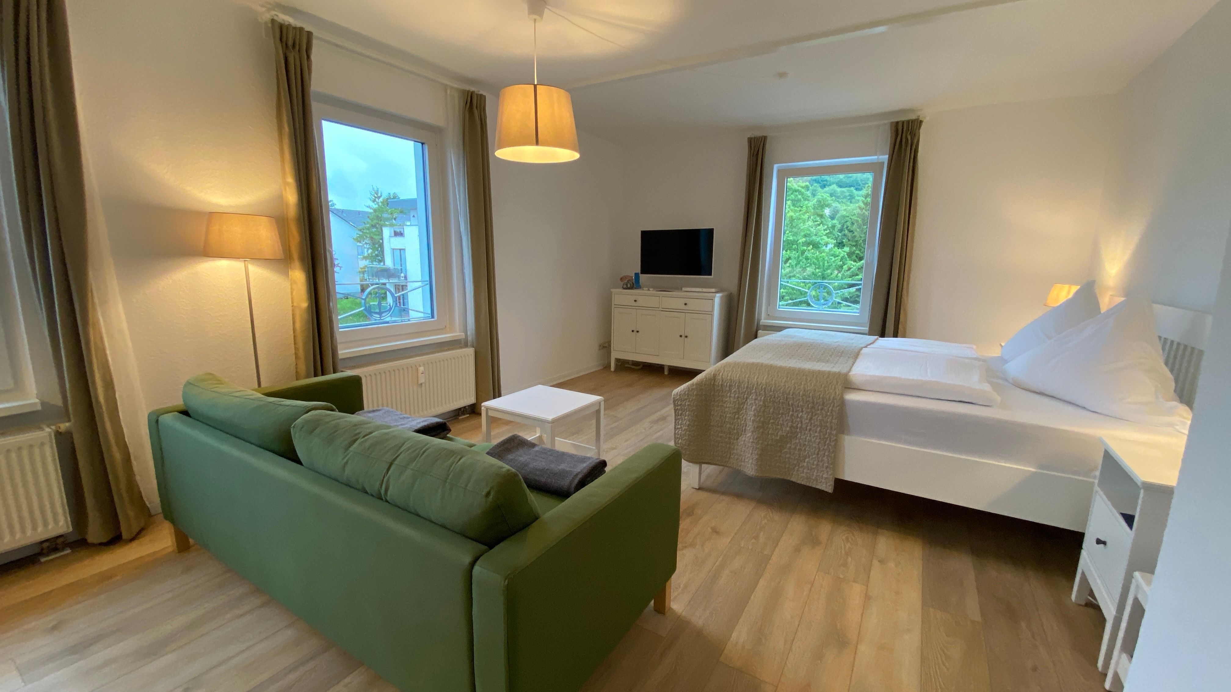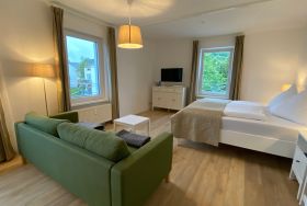 1 Raum-Ferienwohnung mit seitlichen Ostseeblick, NIchtraucher, für bis zu 2 Erwachsene und bis zu 2 Babybetten, gelegen im 2. Obergeschoss.