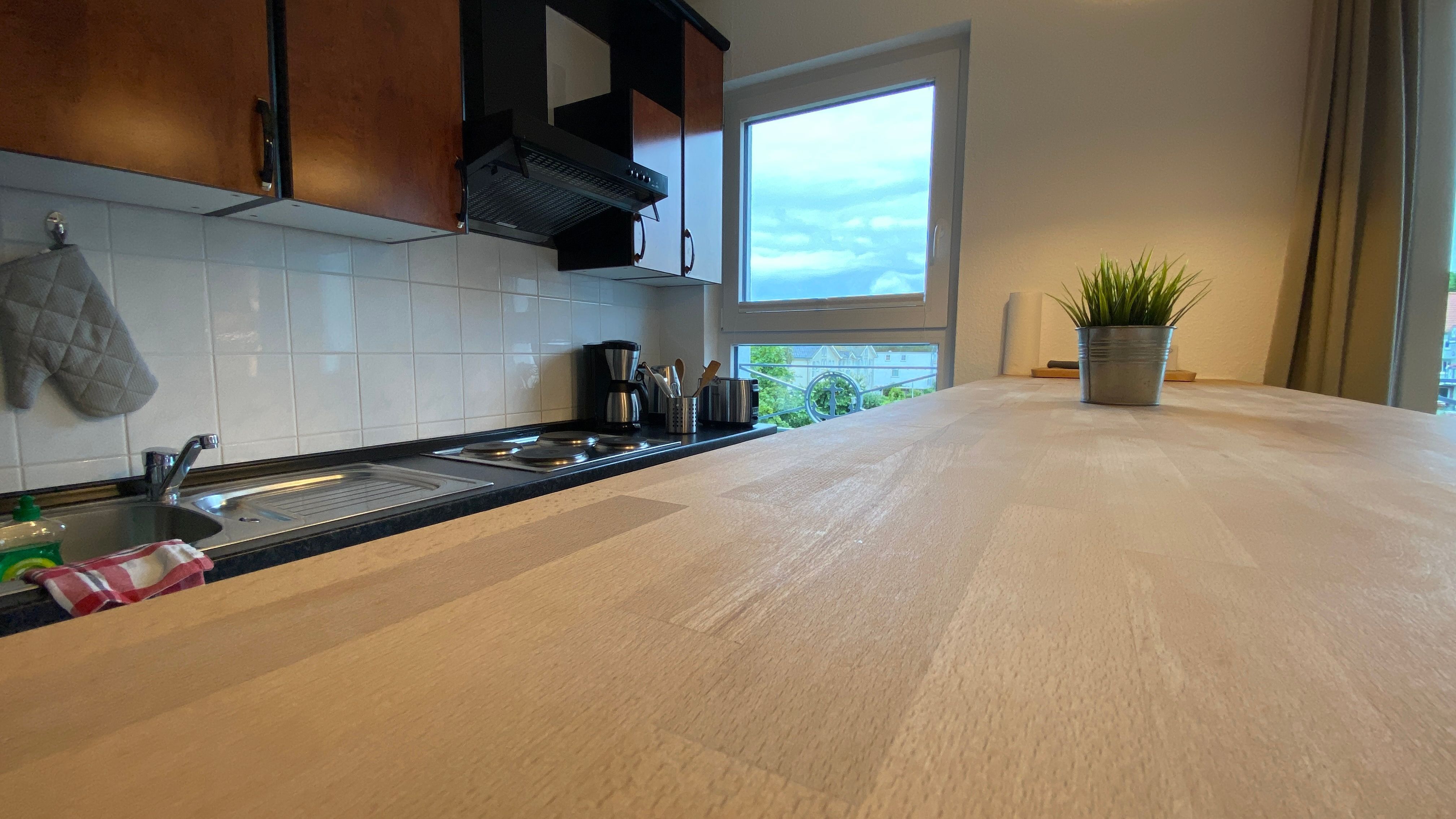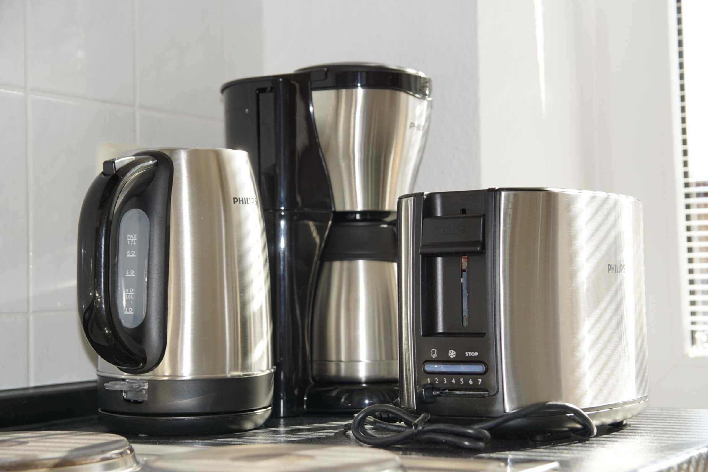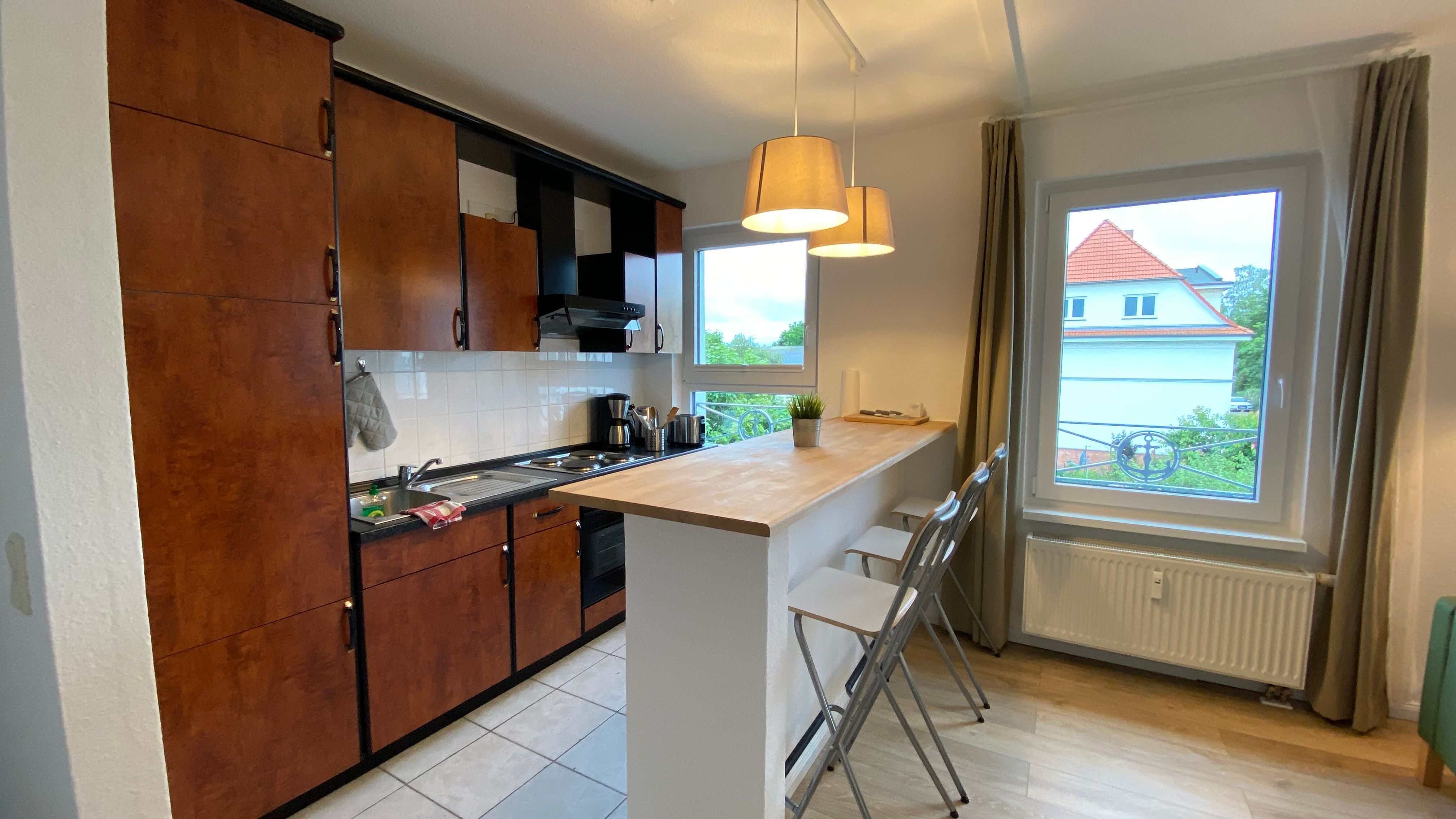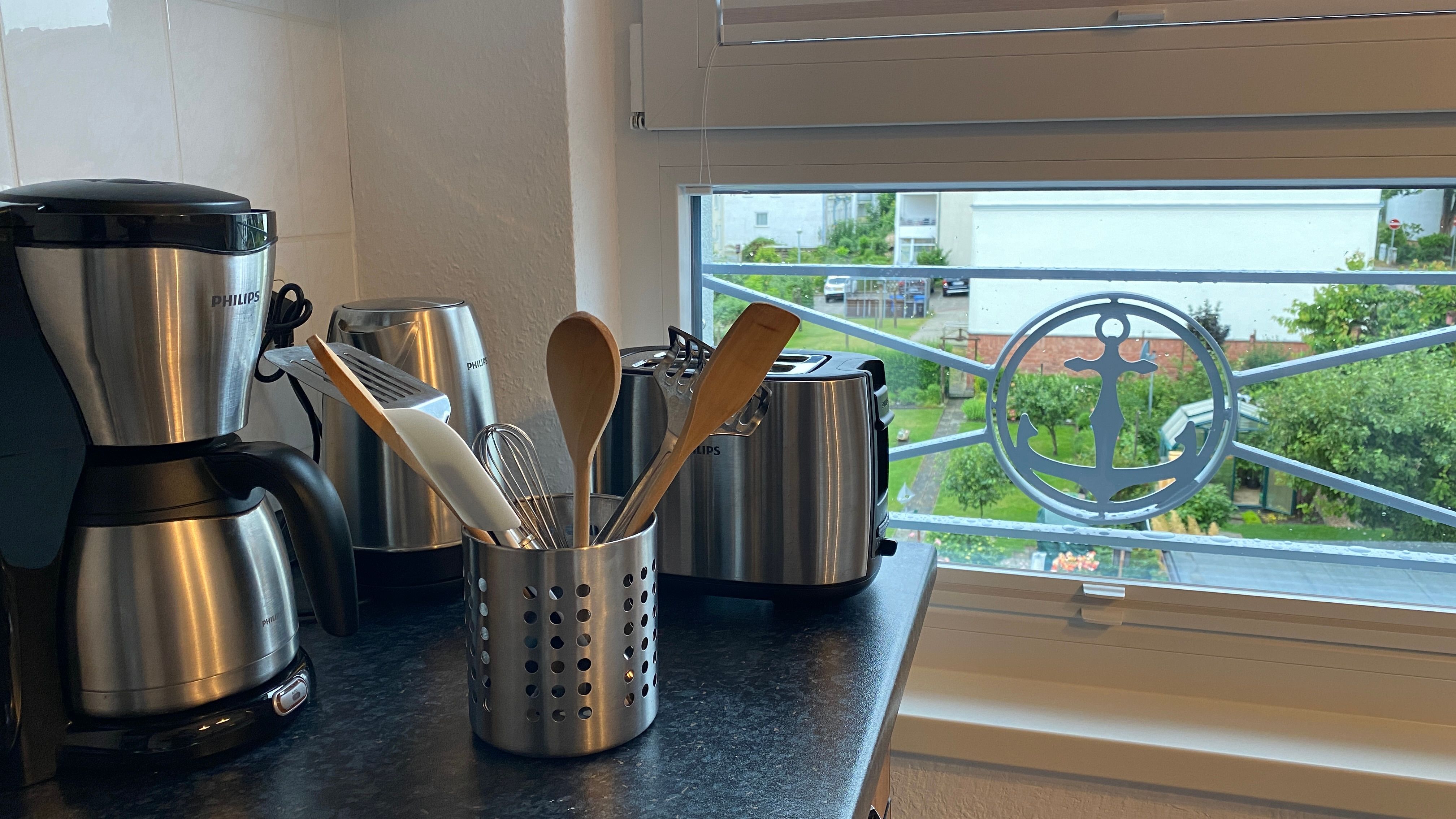Die Küche ist ausgestattet mit Cerankochfeld, Backofen, Mikrowelle, Filterkaffeemaschine, Toaster, Wasserkocher, Kühlschrank mit Tiefkühlfach, Geschirr, Besteck, Koch- und Bratgeschirr, gemütlicher Sitztresen und vier Hochstühle.