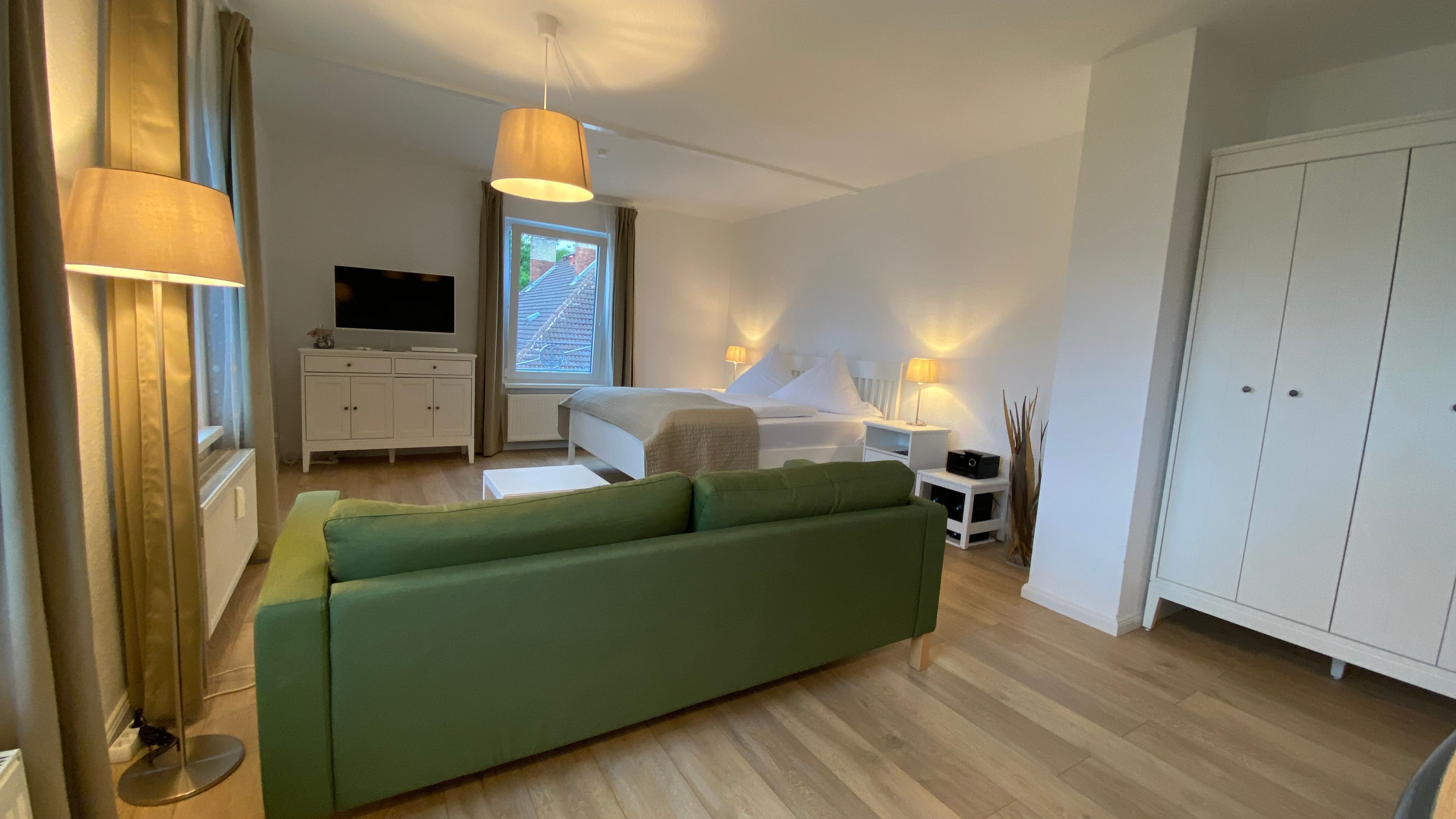 Wohn- Schlafraum ist ausgestattet mit einem großen Doppelbett (180 x 200 cm), Nachttischschränke & Lampen, Kleiderschrank, Sitzcouch, Tisch, Kabel-TV Flat Screen und separater Blu-ray Player, Stereo Musikanlage mit CD Player, Bluetooth und USB für MP3.