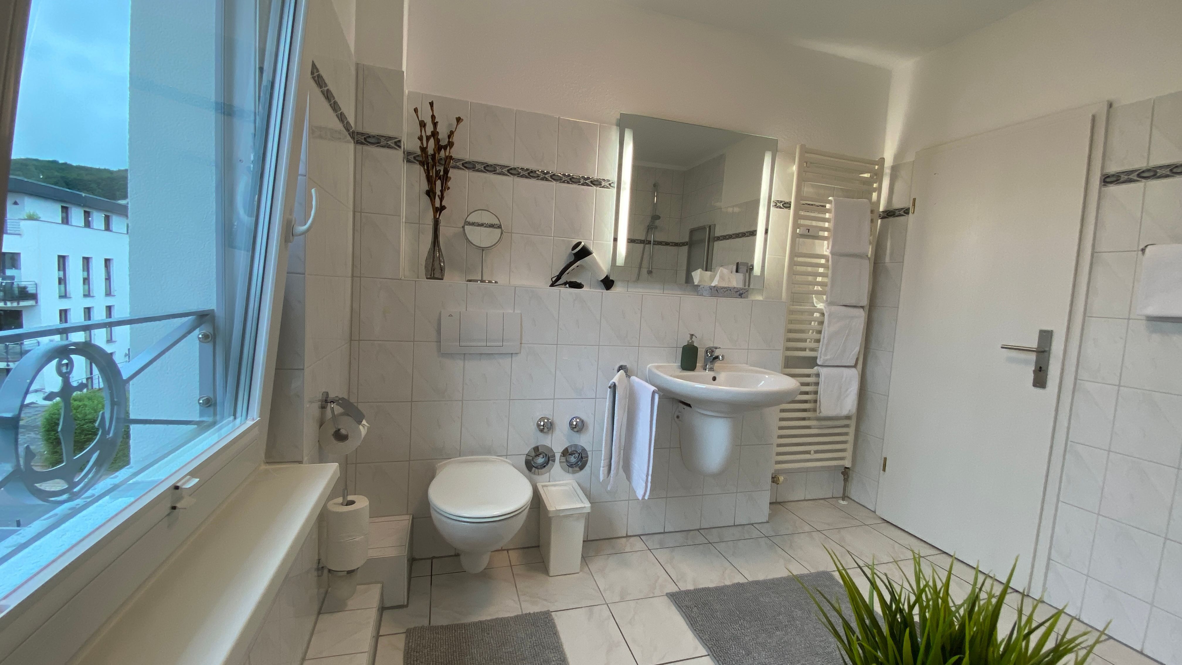 Bad mit Dusche, WC, Waschbecken, großer beleuchteter Spiegel, Schminkspiegel.