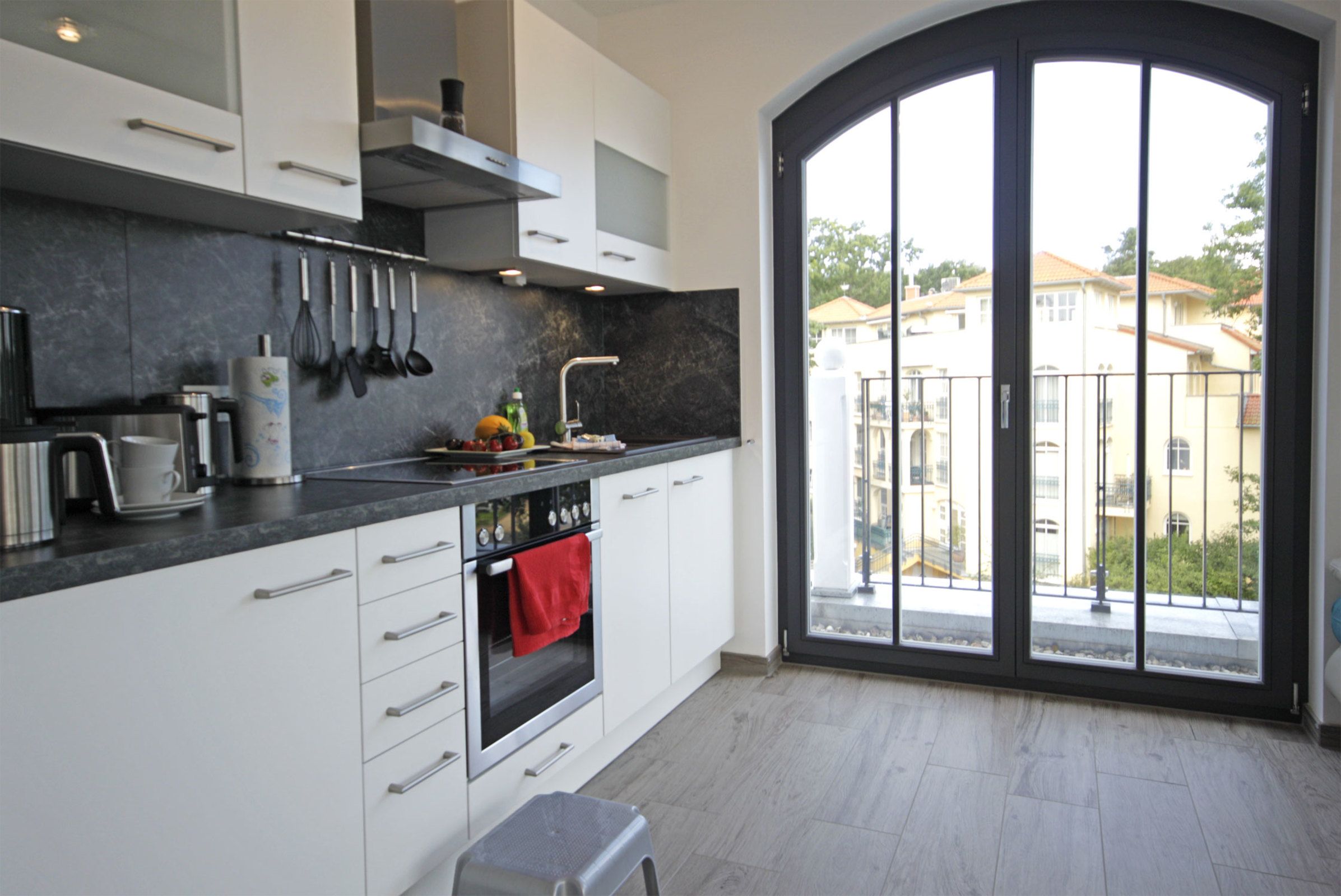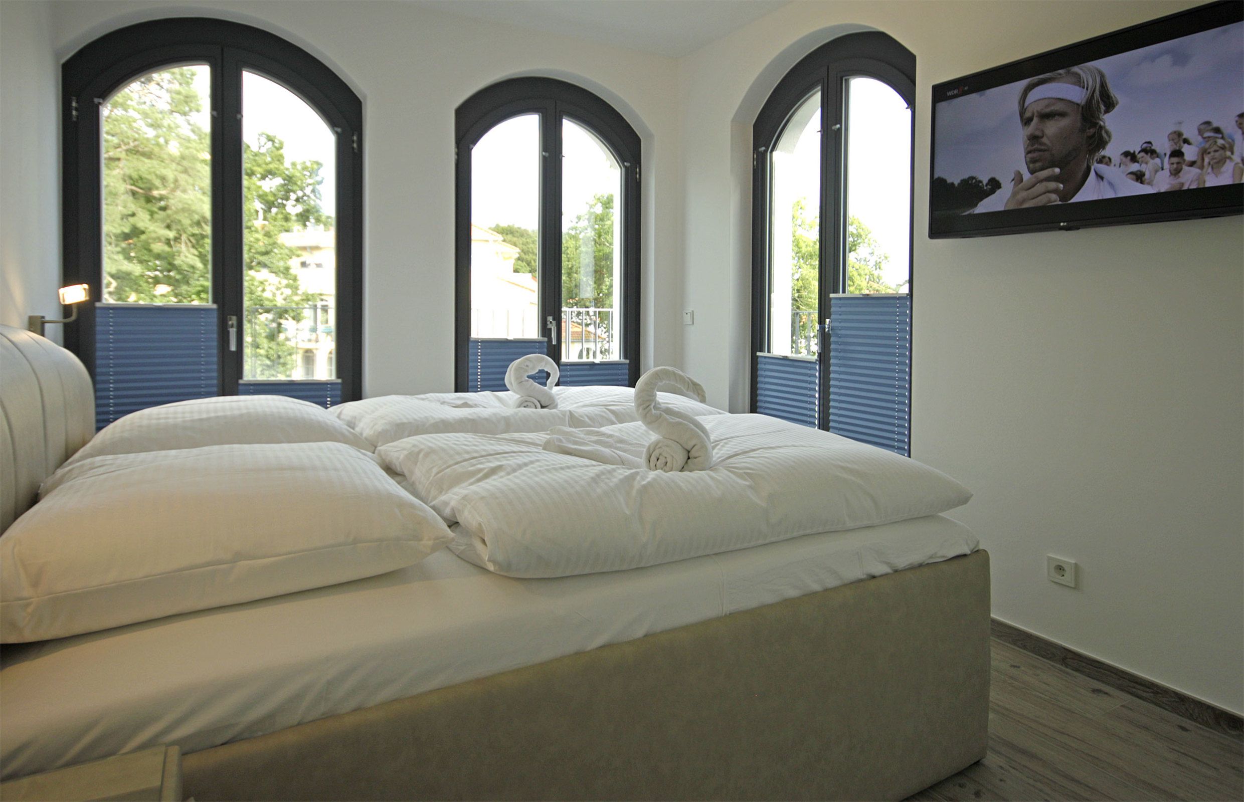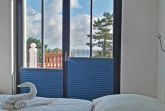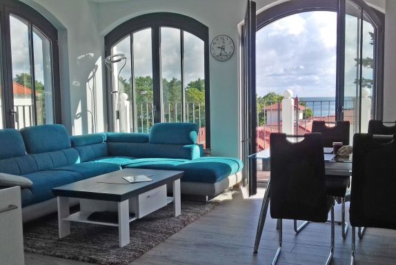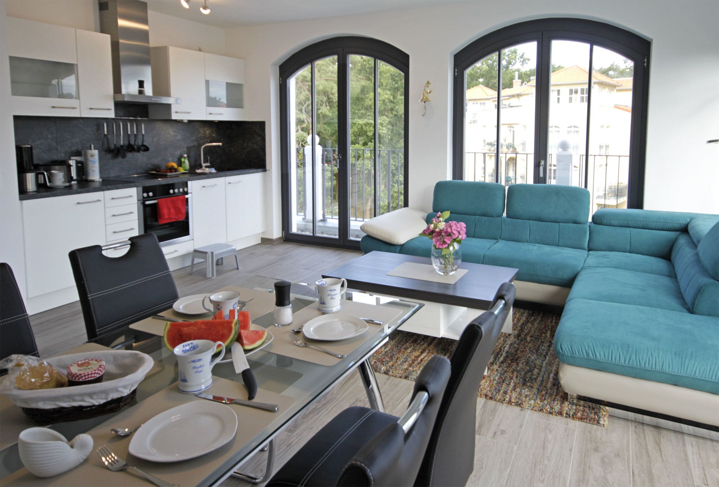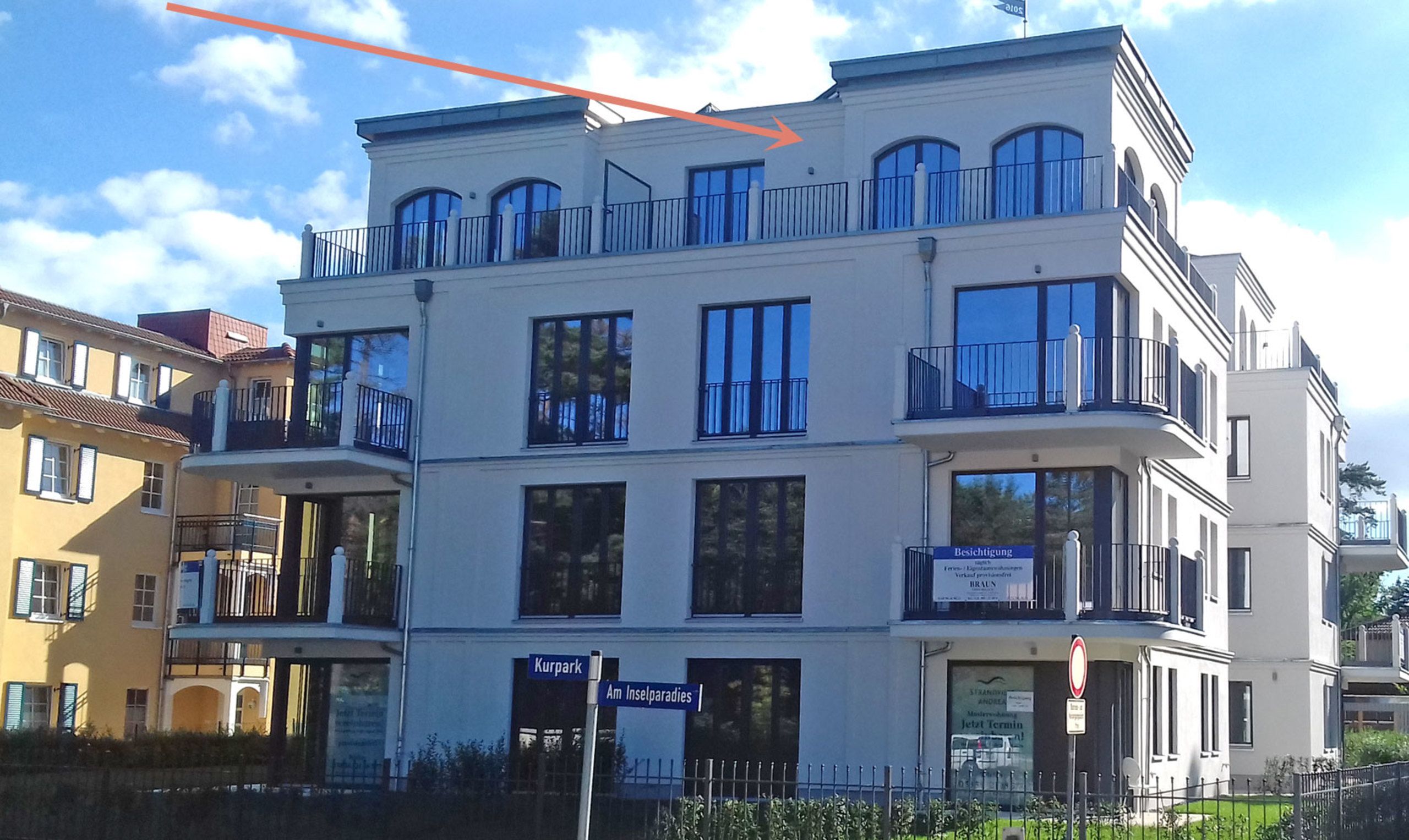 Vis a vis dem Strand, Luxus pur: 98 qm große Penthouse Ferienwohnung mit herrlichen Meerblick an der Promenade von Baabe für 4 Personen mit 2 Schlafzimmern, 2 Bädern und 2 großen Balkonen. Die Villa Andrea liegt in bester Lage zum Strand, verfügt über Lift, WLAN, Tiefgaragenstellplatz und einer Gemeinschaftssauna im Souterrain. Ein schön angelegter Garten umgibt das Haus. Die Wohnung ist ebenfalls gut geeignet für bewegungseingeschränkte Personen, da auch das Duschbad ebenerdig ist.