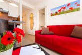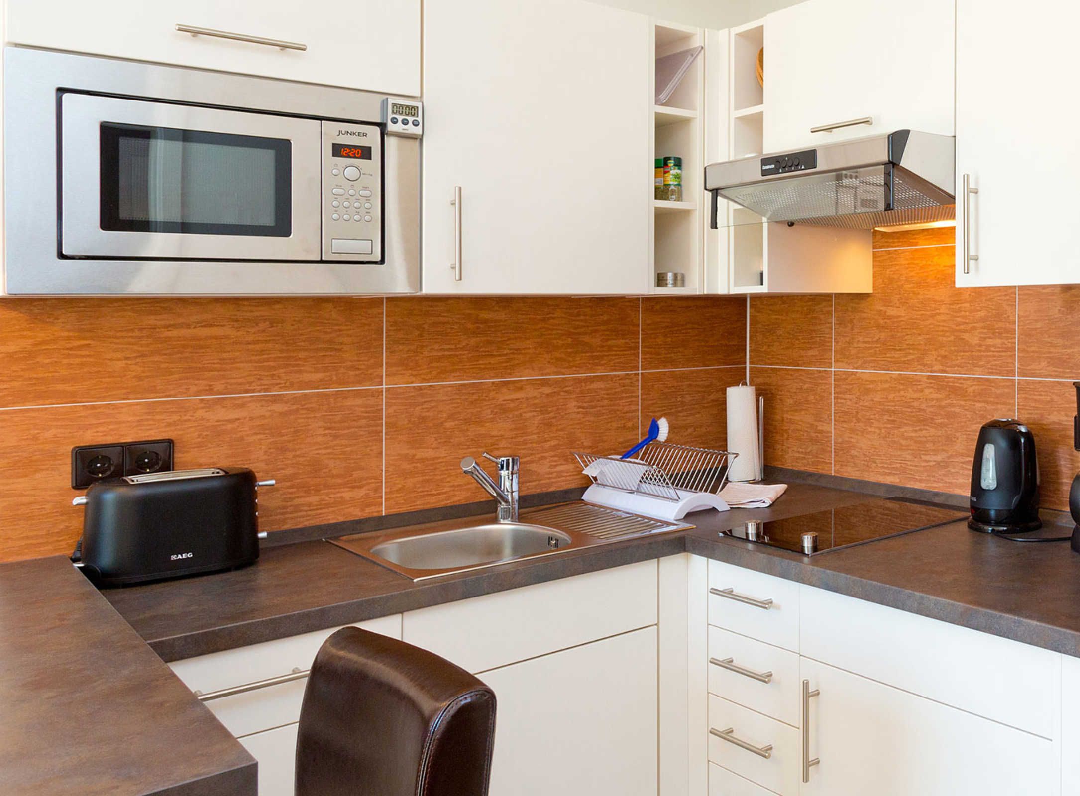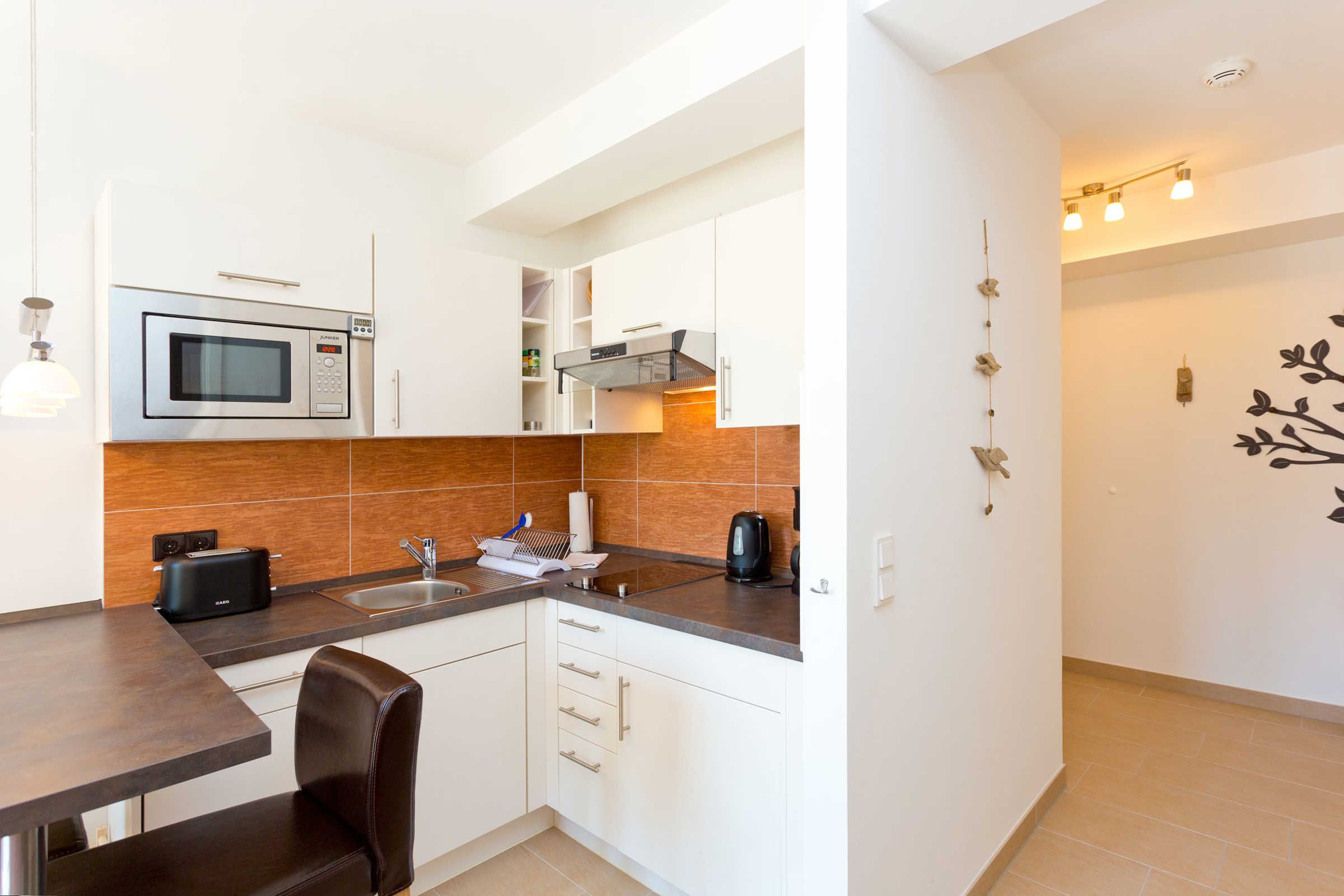 Die moderne 2-Zimmer-Ferienwohnung für 2 Personen liegt im Erdgeschoss des Hauses und verfügt über einen kombinierten Wohn-/Essbereich mit harmonisch integrierter Küchenzeile, einem Essplatz sowie einem Sofabereich und Zugang zu der Terrasse. Kabel-TV, DVD-Player und ein Radio mit Audiowiedergabe für iPod, iPhone und Wireless LAN sind vorhanden. In dem gemütlichen Schlafzimmer befindet sich ein Doppelbett. Das Bad ist mit einer ebenerdigen Dusche ausgestattet. Genießen sie die sonnige Terrasse.