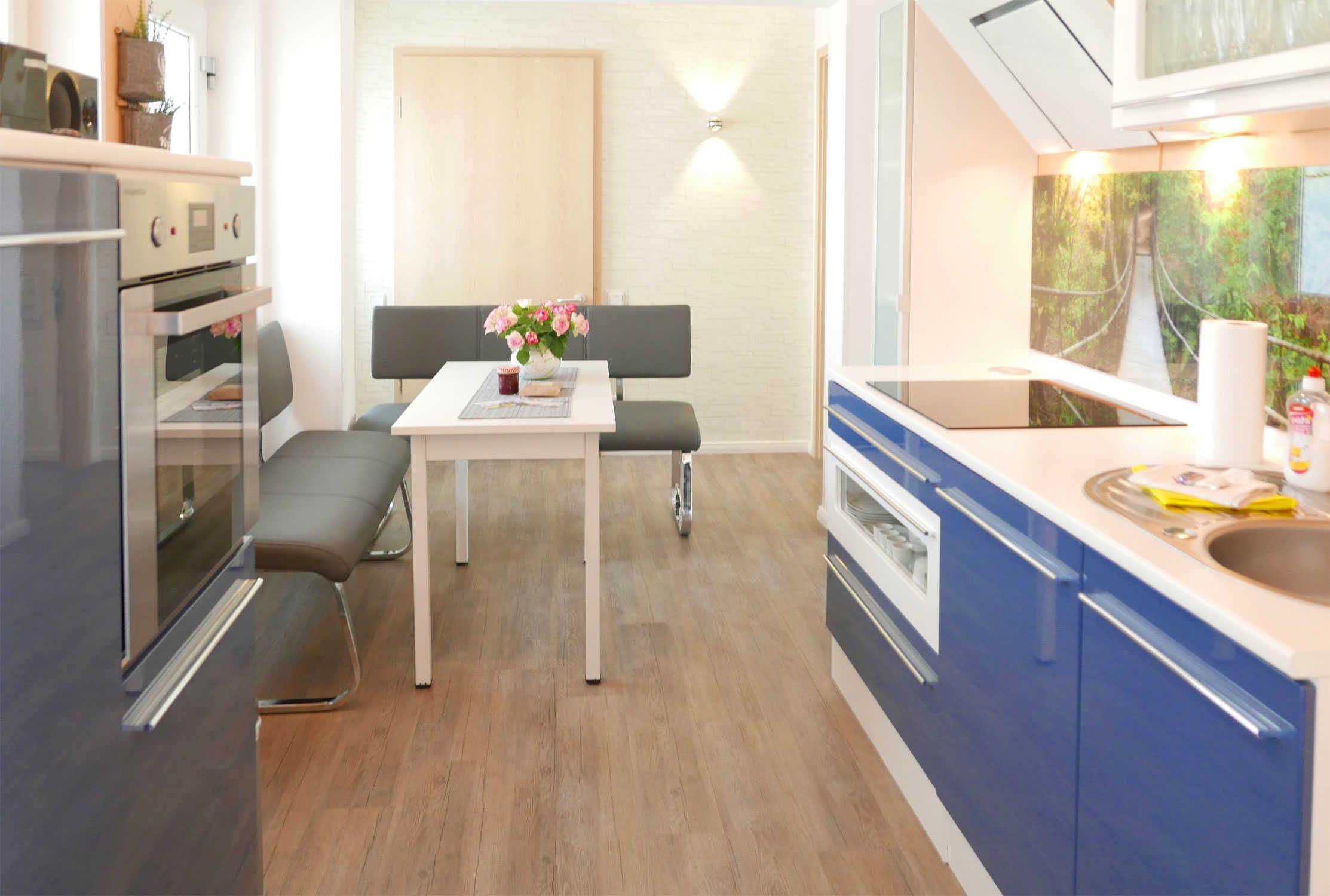 In der Küche befindet sich ein 4-Plattenherd, Backofen, Kühlschrank mit Gefrierfach, Geschirrspülmaschine, Mikrowelle, Kaffeemaschine und ein Toaster. Zudem gibt es einen gemütlichen Sitzbereich.