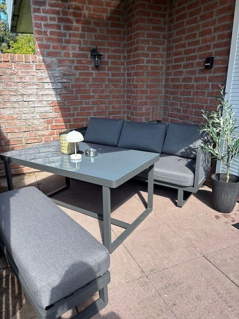 Sonnige, windgeschützte Terrasse mit stilvollen Loungemöbeln zum Entspannen