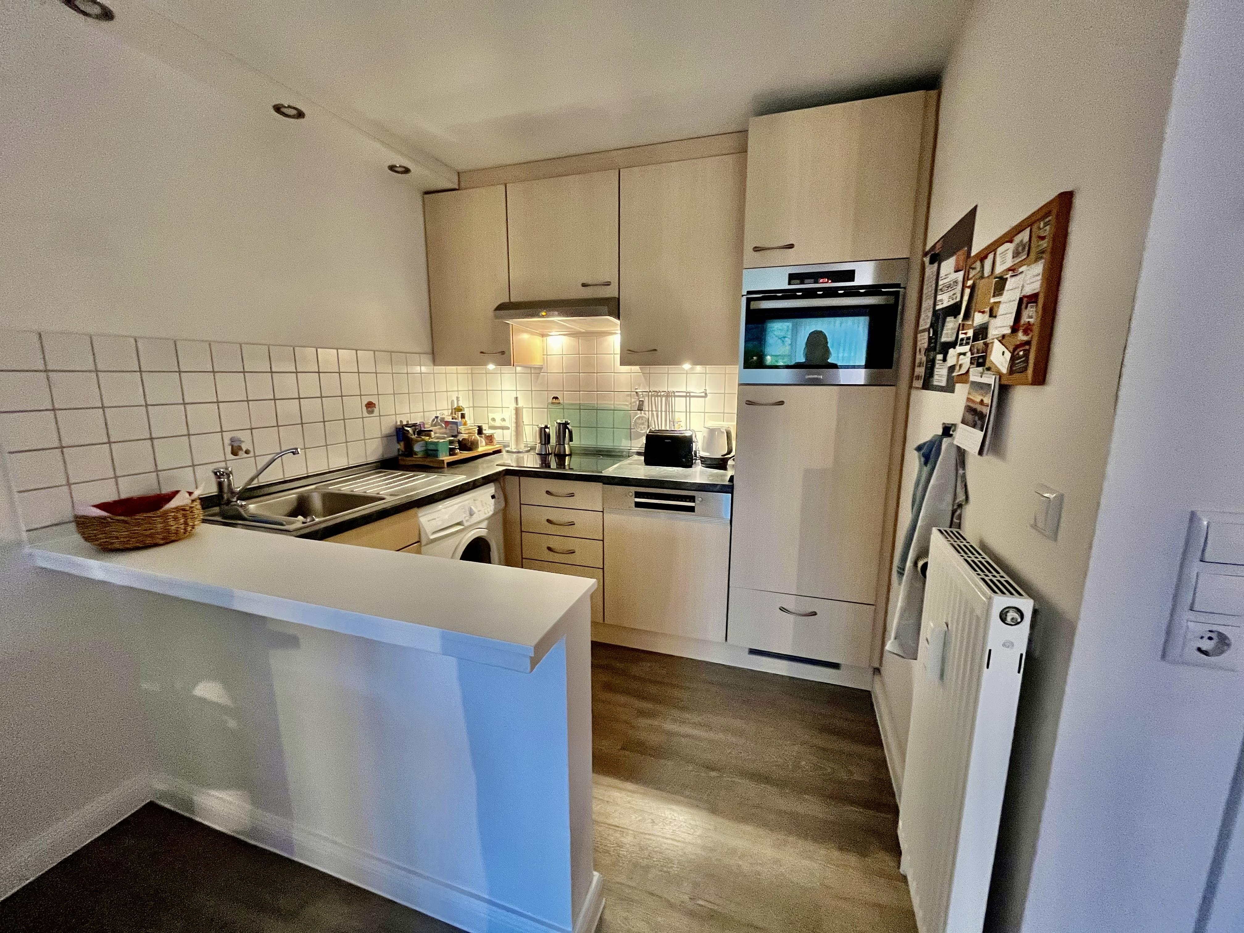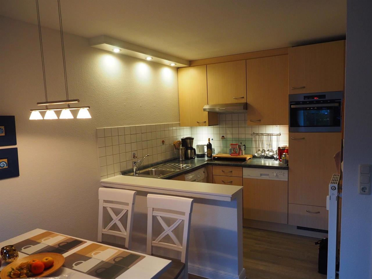 Die Ausstattung entspricht gehobenen Ansprüchen. Das ca 25 qm große Wohn-/Esszimmer mit offener Küche umfasst eine Einbauküche mit Waschmaschine (ohne Zusatzkosten), Geschirrspüler, Cerankochfeld, Kühl-Gefrierkombination, Backofen mit Grill, Heißluft und Mikrowelle, Kaffeemaschine, Toaster, Zauberstab und Mixer.