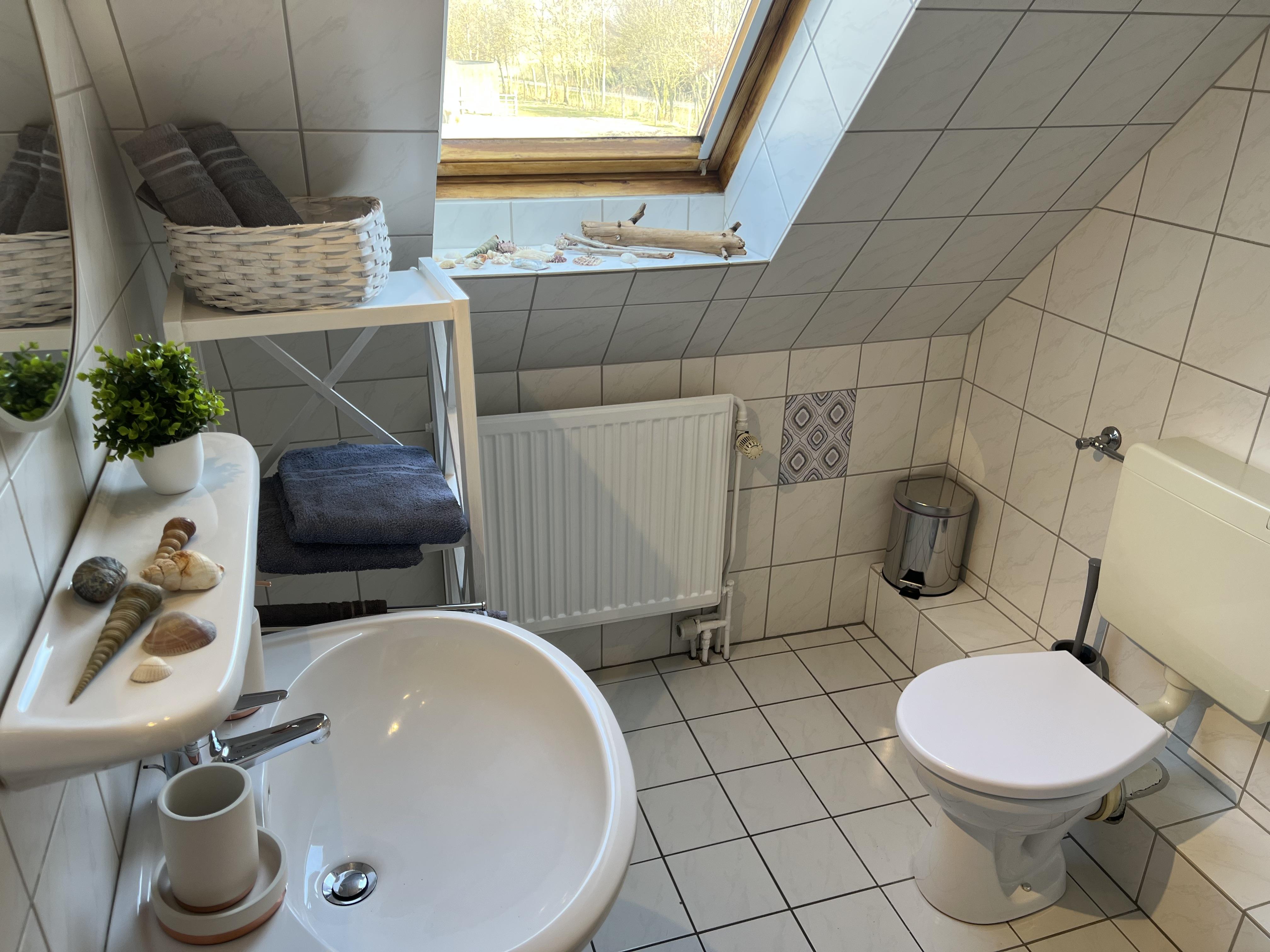 Das Duschbad ist mit einer Fußbodenheizung und ebenso mit einem Fön ausgestattet.