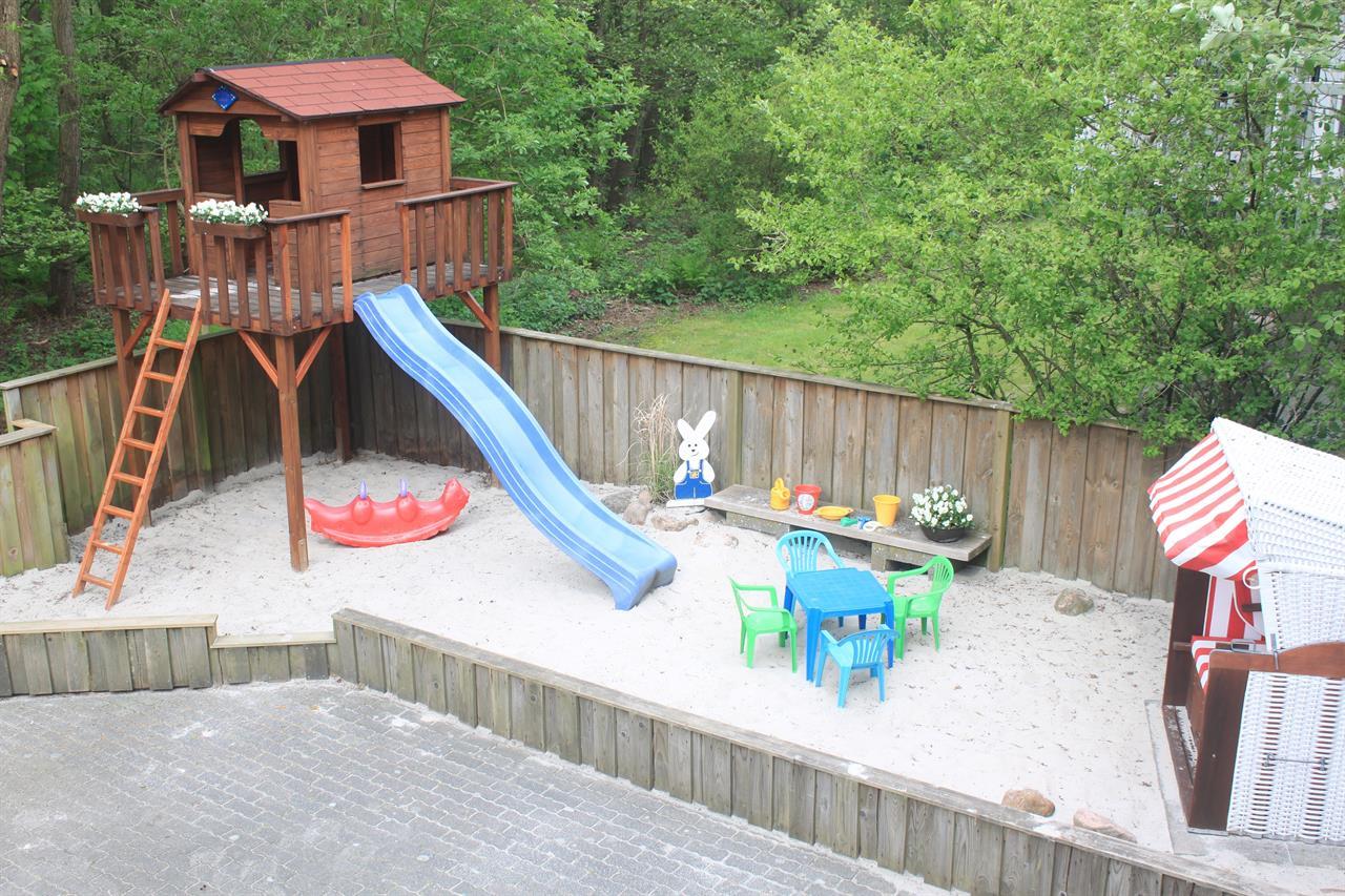 Auf die Kinder warten Bobby Car, Dreirad, Kicker und unsere große Sandspielecke, in der auch ein Strandkorb zum Verweilen einlädt.