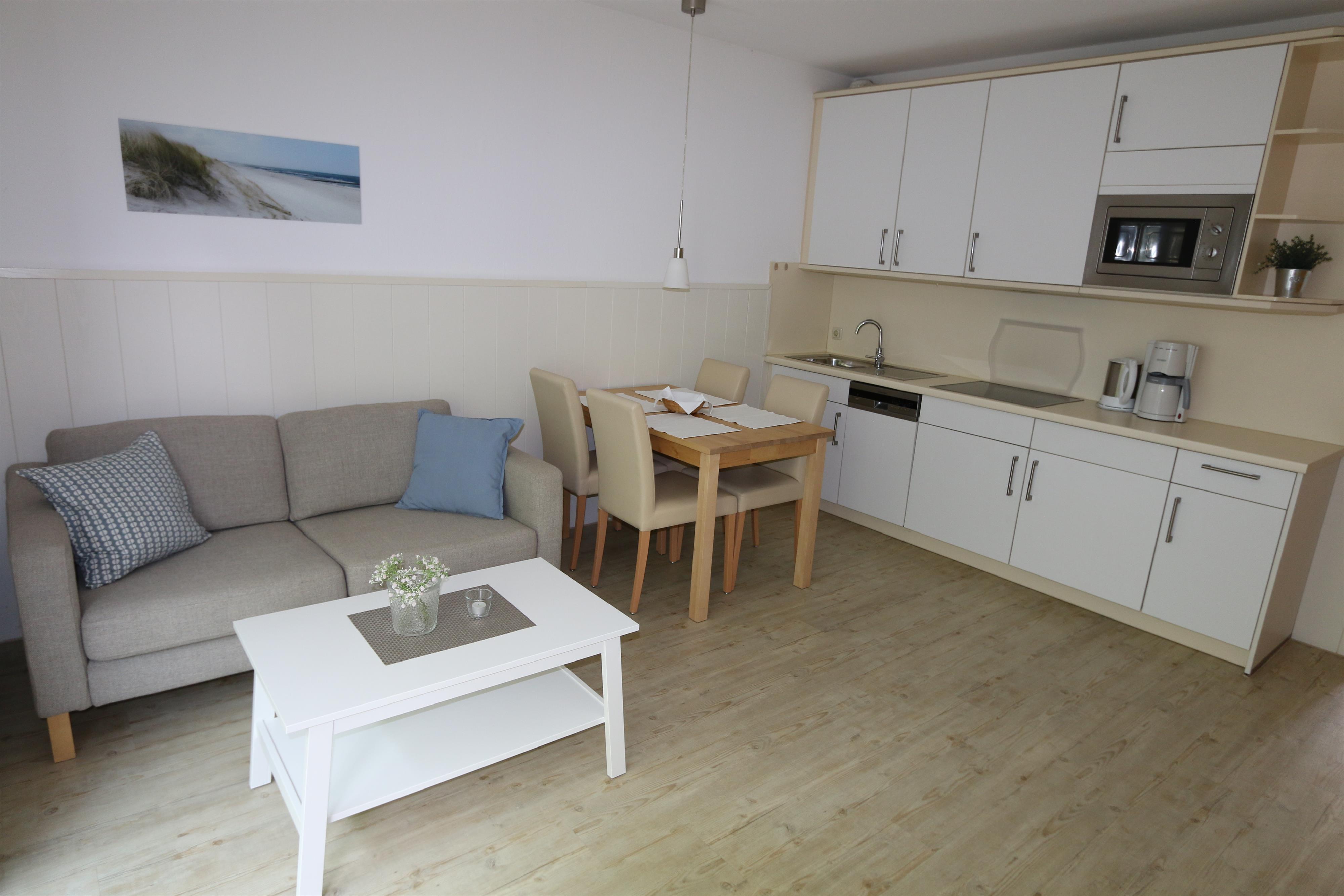 mit zwei Einzelbetten, Flur, Duschbad, sowie einen kombinierten Wohn- Schlafraum (Doppelbett als Schrankbett) mit Küchenzeile.