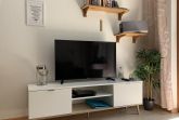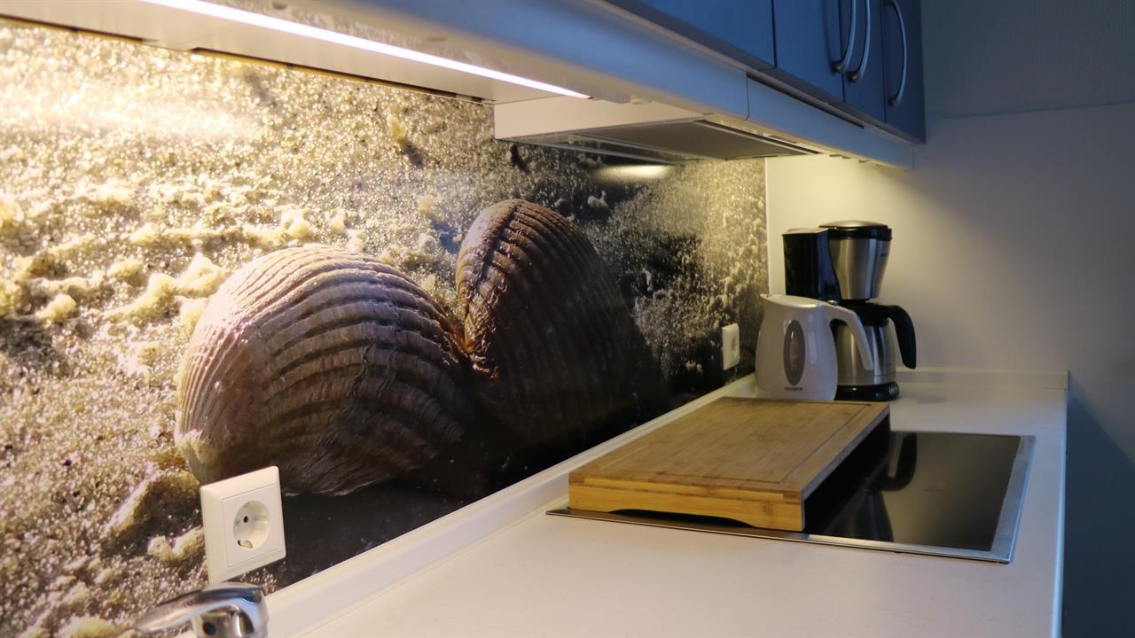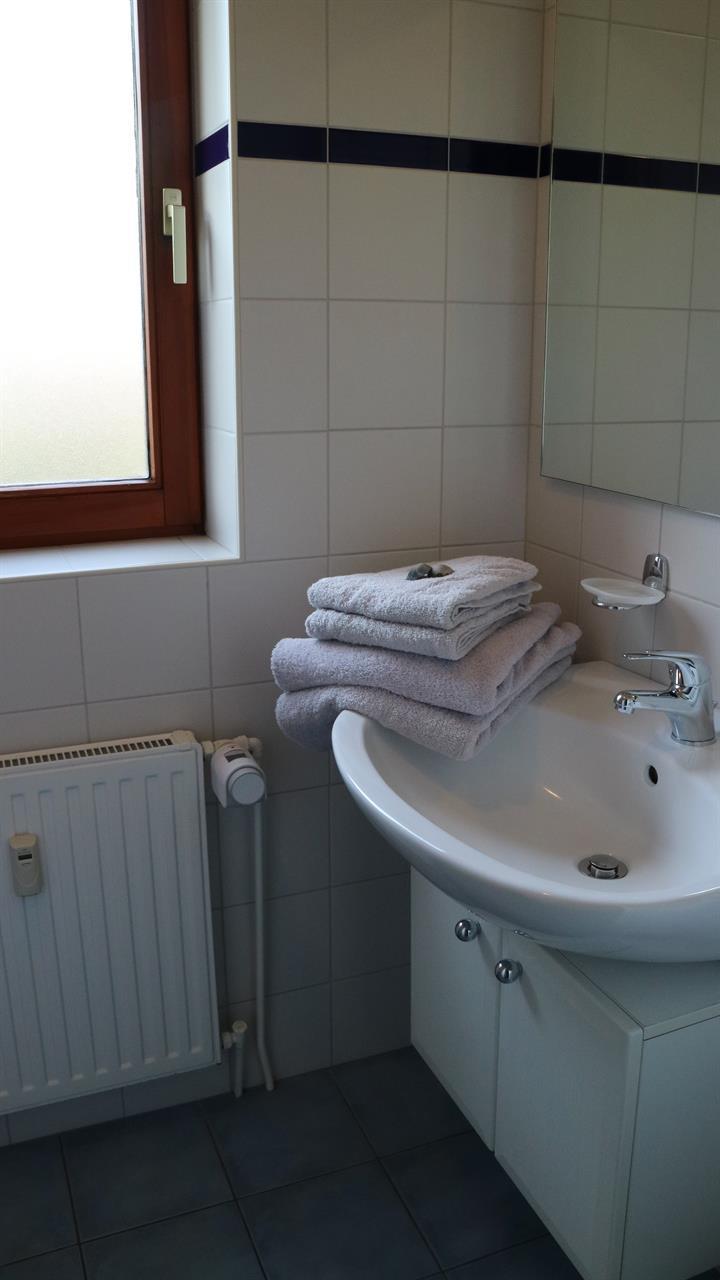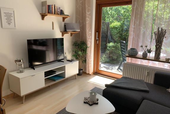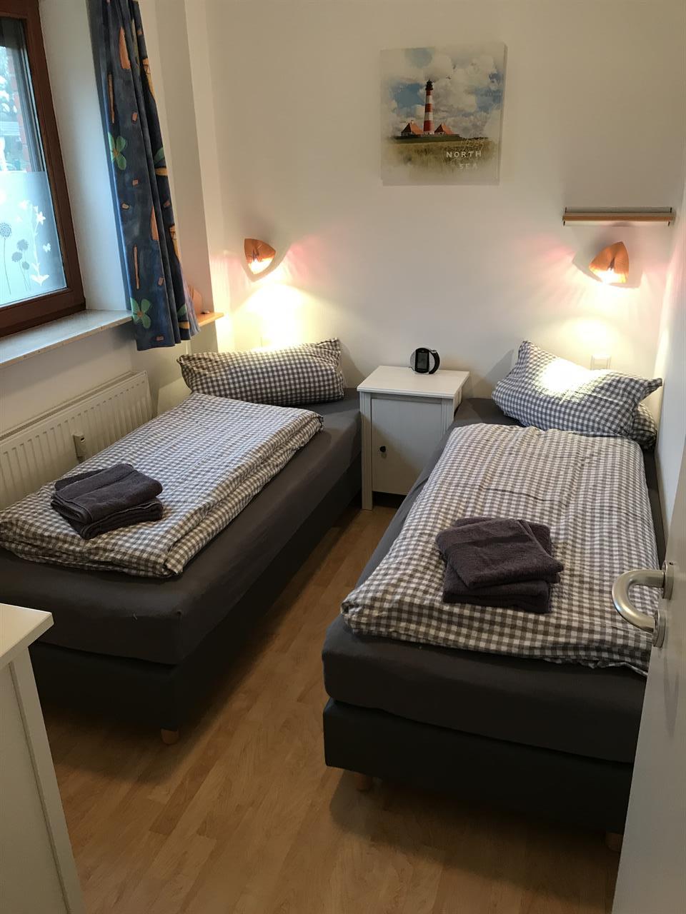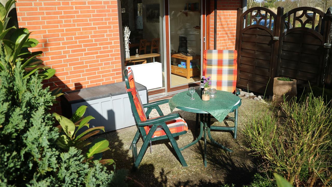 Wir bieten Ihnen eine sehr ansprechende, geschmackvoll eingerichtete Ferienwohnung im Erdgeschoss der kleinen Wohnanlage an. Die Wohnung hat ein Wohn-/Esszimmer mit einer Einbauküchenzeile (4-Platten-Herd, Geschirrspülmaschine und eine Mikrowelle / Backofenkombination (für die Sonntagsbrötchen)), ein Schlafzimmer mit zwei Einzelbetten (die problemlos zusammen geschoben werden können) und einem ebenerdigen Duschbad mit WC (März 2018 renoviert) und Fön. Vom Wohnzimmer gelangen Sie auf eine schöne, windgeschützte Terrasse. Zur Ausstattung gehören SAT-TV, Stereo Anlage und Gartenmöbel, außerdem können Sie gegen Gebühr die Gemeinschaftswaschmaschine und den Trockner nutzen. Abschliessbarer Fahrradabstellraum auf dem Grundstück, Pkw-Stellplatz direkt am Haus.