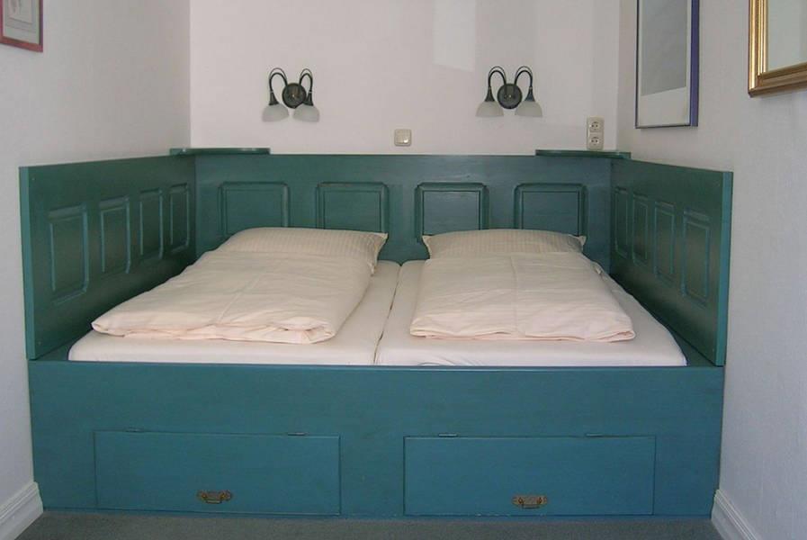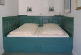 Das mit blau lasiertem Holzpanel eingerahmte Doppelbett ist besonders bei jungen Leuten sehr beliebt. Die Wohnung ist mit gebührenfreiem Telefon, Internetzugang (WLAN), großem Flachbild-Fernseher und Stereoanlage ausgestattet.
