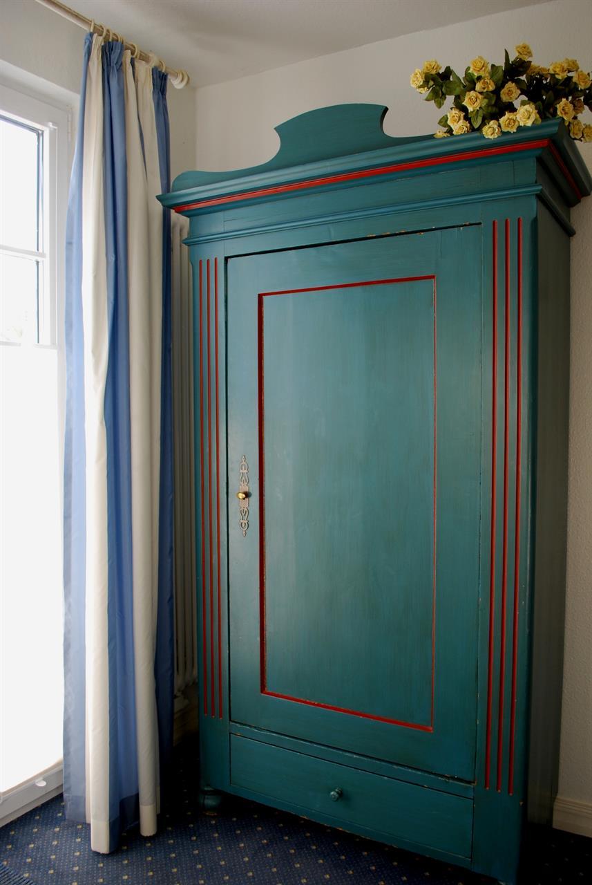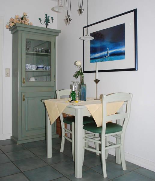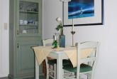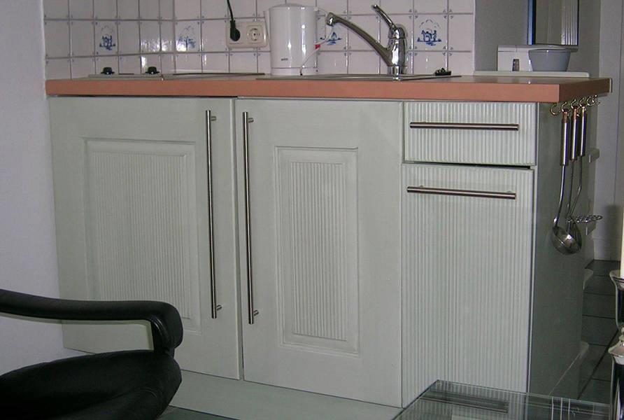 Die Wohnung Everschop ist stilvoll und individuell eingerichtet mit Ledercouch, bequemem Ledersessel und Glastisch sowie integrierter Küchenzeile mit Kühlschrank und 2-Plattenherd, die mit einer grün lasierten Holzfront verkleidet ist. Auf einem Bord oberhalb steht eine zusätzliche Mikrowelle. Kaffeemaschine, Toaster und Mixer sind vorhanden. Farblich passend hierzu sind eine Vitrine aus Massivholz für das Porzellan und die Gläser und die Essgruppe. Ein großes Sprossenfenster nach Osten lässt die Morgensonne ein. Vom Wohnraum führt eine Tür zum Schlafraum mit Doppelbett (1,8 x 2,0 m) und von dort in das Duschbad (mit Föhn).