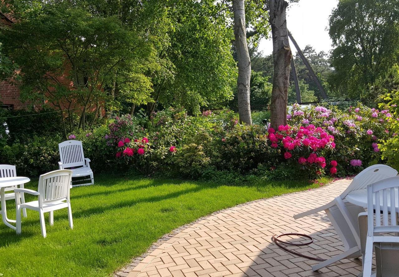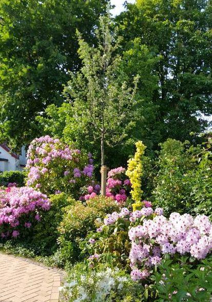 Ein hübscher von Bäumen, Rhododendronbüschen und Rosen eingerahmter Garten mit Liegen, Tischgruppen