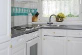 Toaster, Handmixer, sowie blauweißem Friesengeschirr und formschönen Gläsern in Oberschränken.