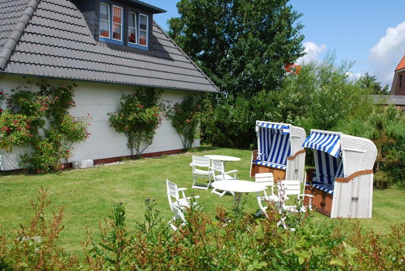 Zwei Wohnungen liegen im EG mit möblierten Terrassen und zwei Wohnungen im OG mit eigener Sitzgruppe und eigenem Strandkorb im Garten.