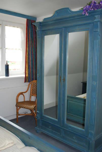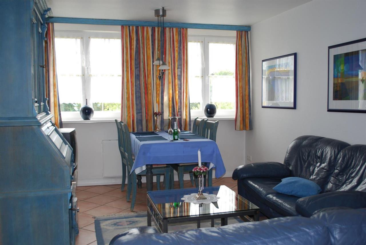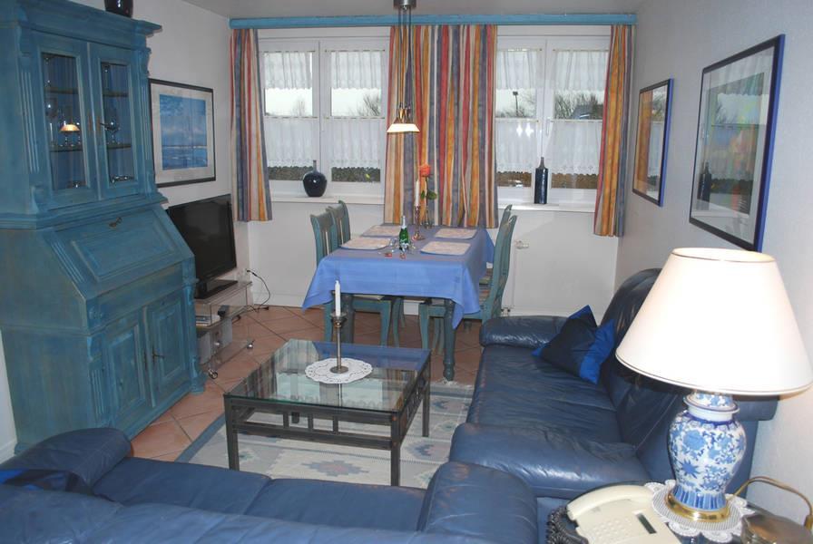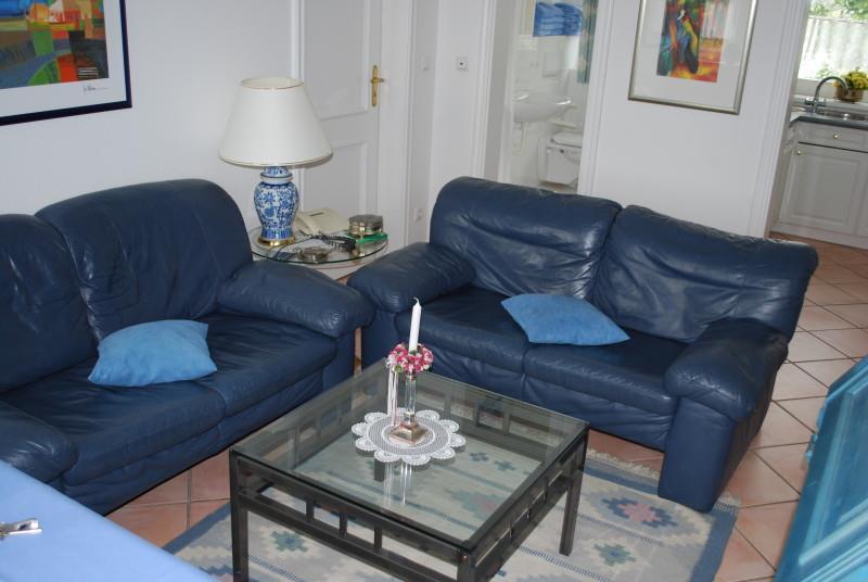 Die Wohnung Oland ist sehr stilvoll und hochwertig mit blauen Ledersofas, blau lasierten Stilmöbeln und viel Liebe für das Detail eingerichtet.