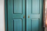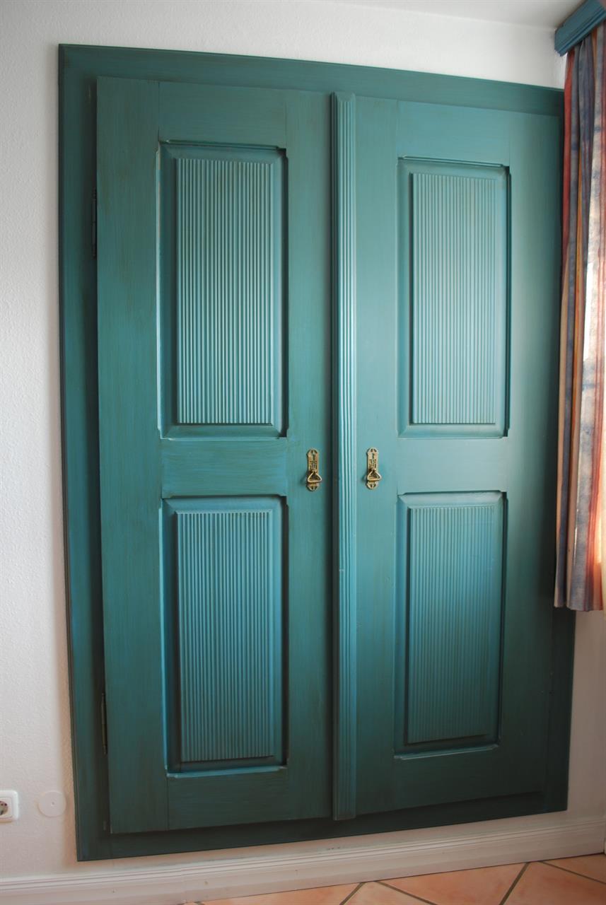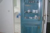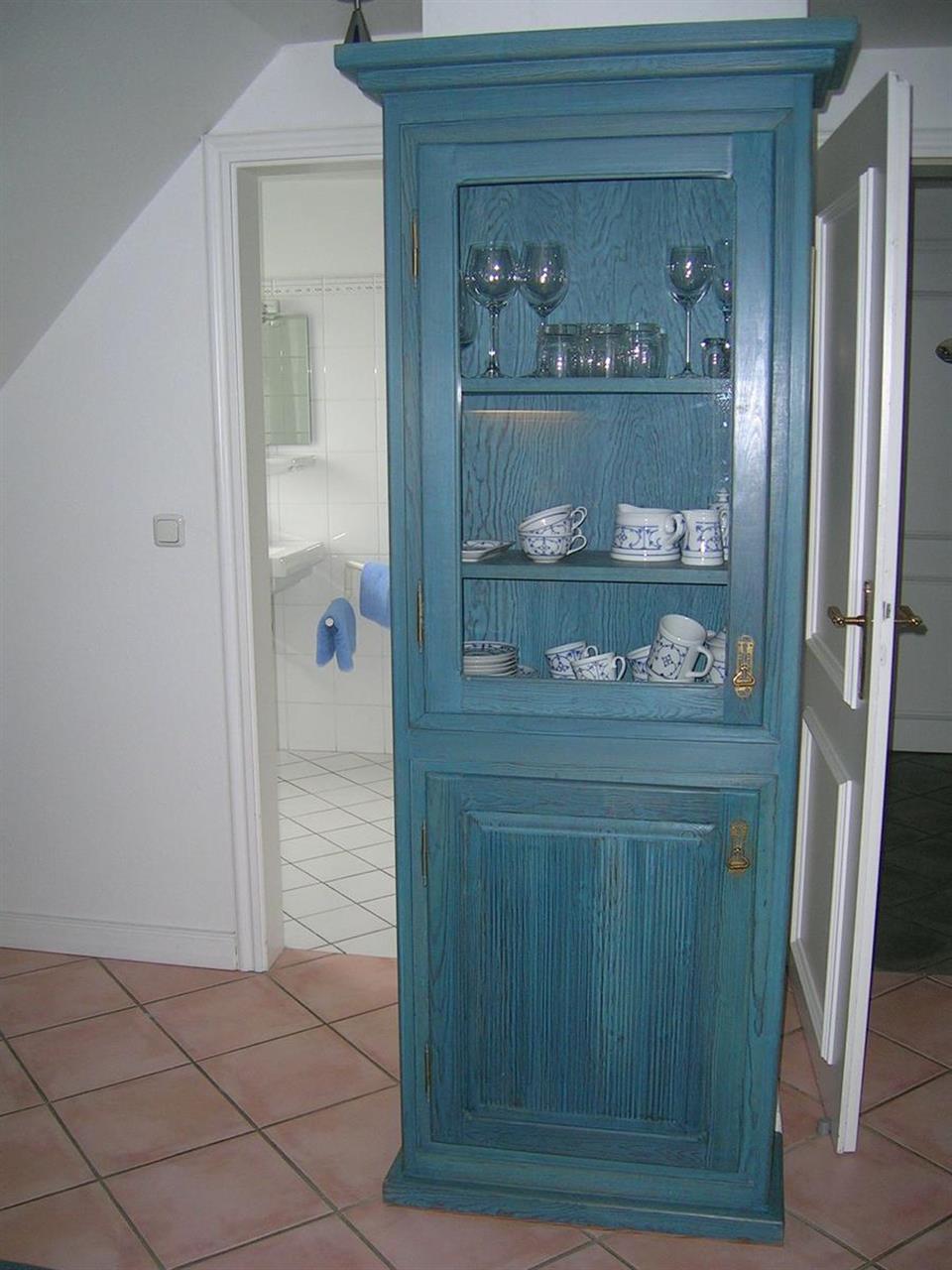 Weitere Details: Sideboard und Vitrine aus massiver blau lasierter Kiefer und antiker Kleiderschrank (Nussbaum).