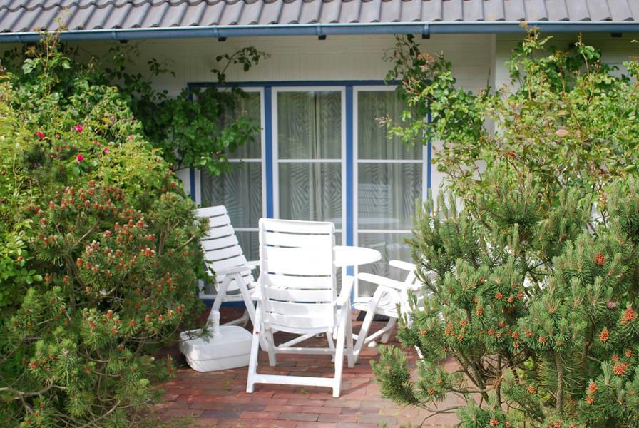 Zwei Wohnungen liegen im EG mit möblierten Terrassen und zwei Wohnungen im OG mit eigener Sitzgruppe und eigenem Strandkorb im Garten.