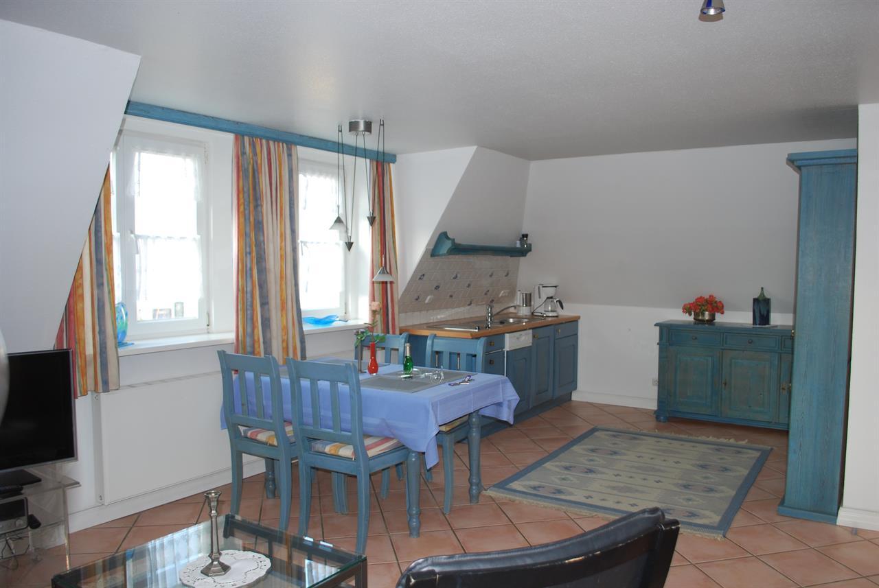 sowie einem Duschbad (mit Föhn und Außenfenster) verfügt sie über eine integrierte Küchenzeile mit Spülmaschine, Kühlschrank,