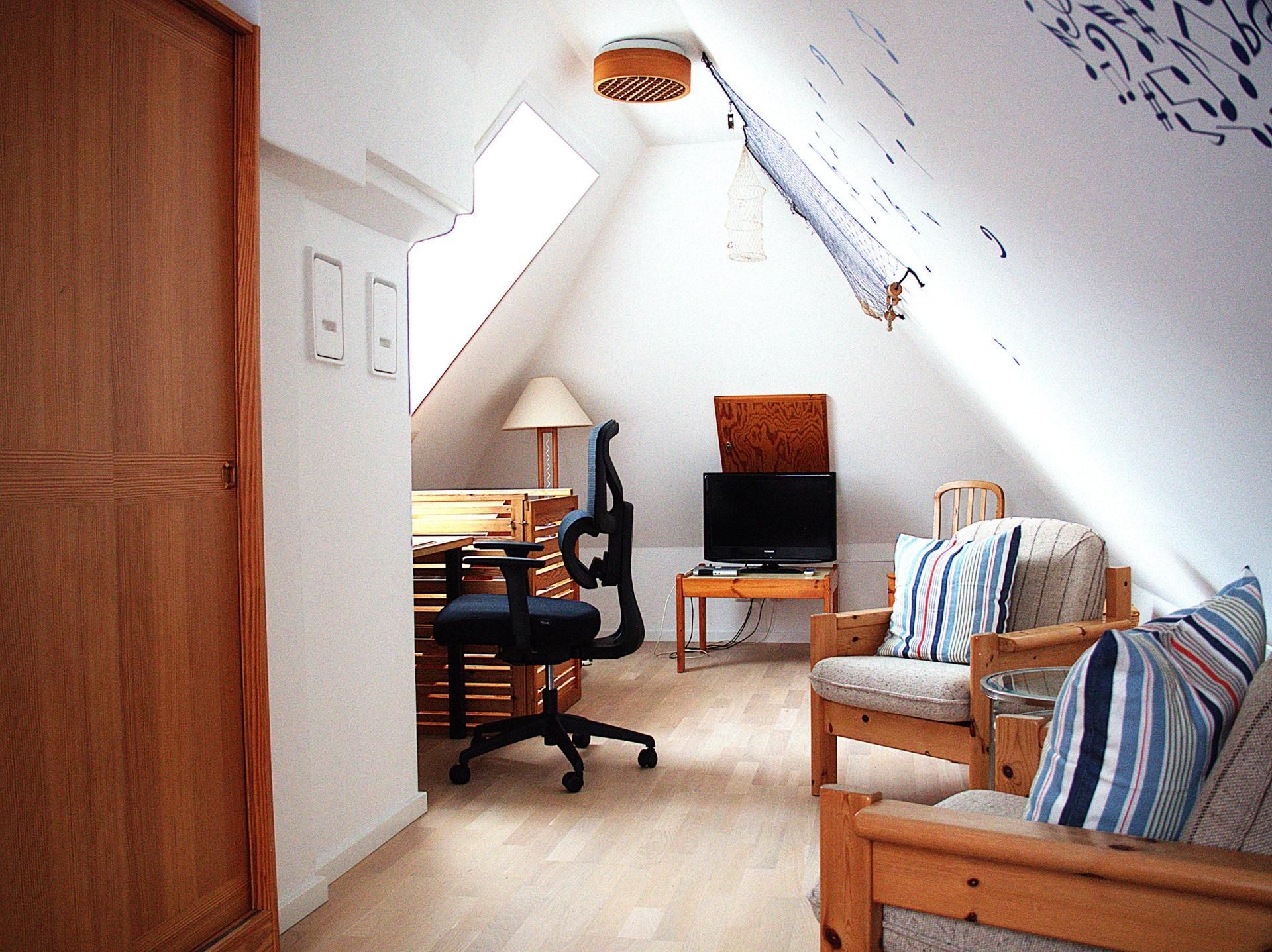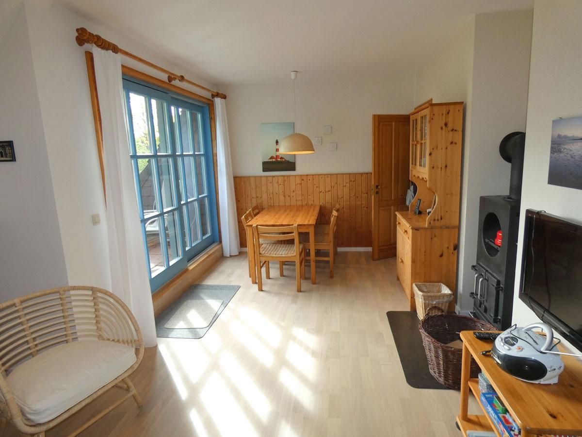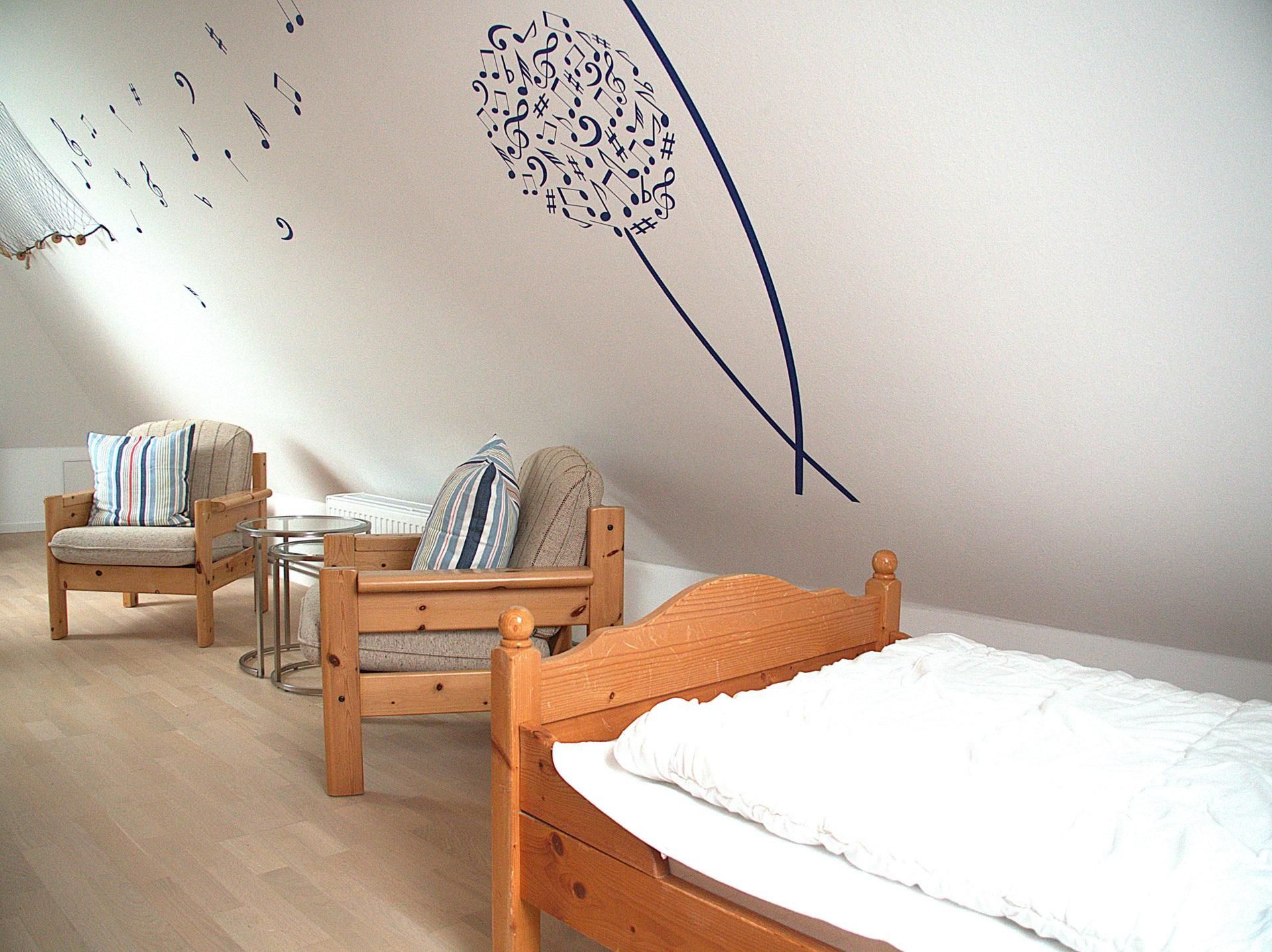 Die Wohnung Rico im Obergeschoß verteilt sich über 2 Etagen auf 75qm. Im Obergeschoß finden Sie einen Wohnschlafraum mit Schlafcouch, Sitz- und Essecke, dänischem Kaminofen, sowie eine sonnige Fensterfront mit Ausgang zum Balkon vor. Die Ferienwohnung ist im skandinavischen Stil mit einer separaten Küche, Insektenschutzfenstern, einem Duschbad, sowie einem separatem WC ausgestattet. Ein Schlafzimmer mit einem Doppelbett läst zum Schlummern ein. Ein weiterer Schlafraum mit 2 Einzelbetten und Kindergitter (ein dritter Schlafplatz wäre hier möglich), einem Couchtisch und zwei Sesseln ist über die Wendeltreppe im Dachgeschoß erreichbar. Bettwäsche und Handtücher sind auf Anfrage mietbar.