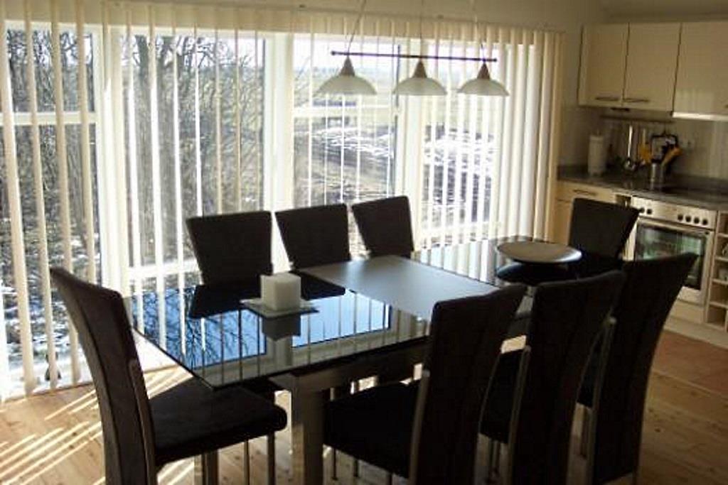 Das sehr große Panoramafenster bietet einen weiten Blick in den Garten und die sich weit hinziehenden Wiesen. In einigen Kilometern Entfernung kann man das Nordseeheilbad St. Peter-Ording erkennen.