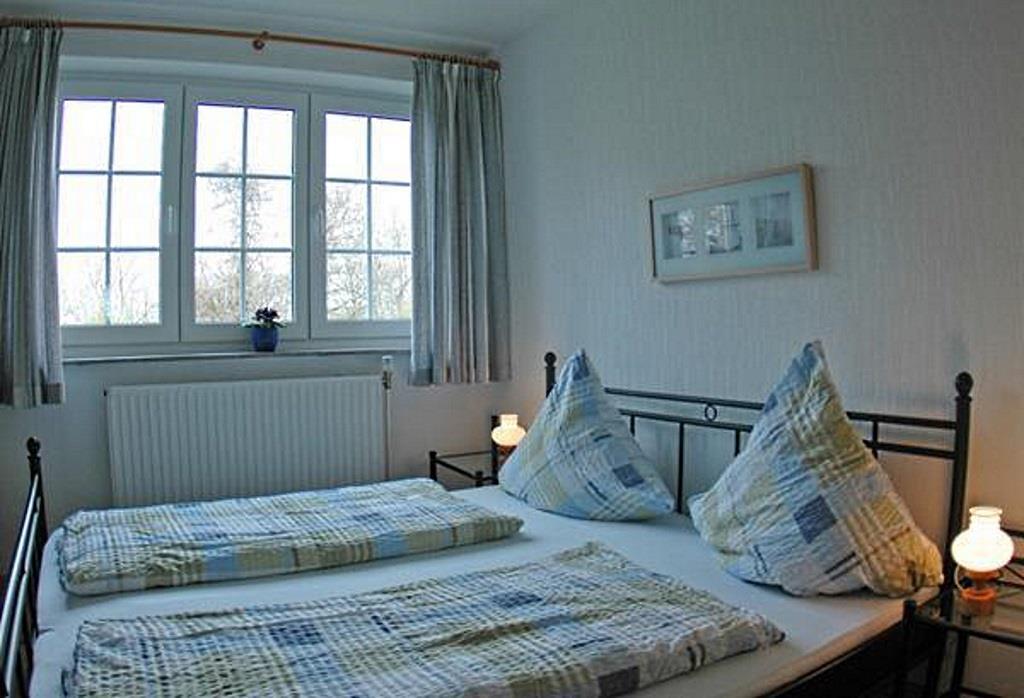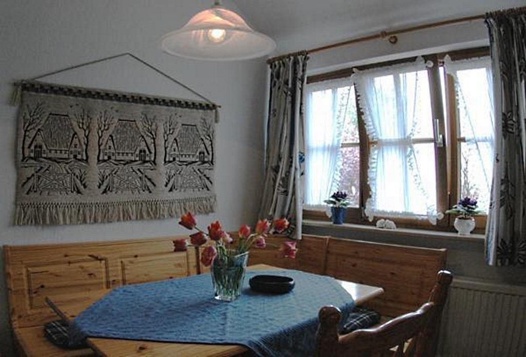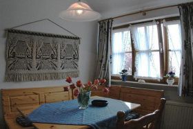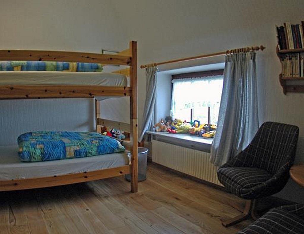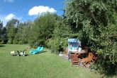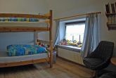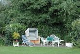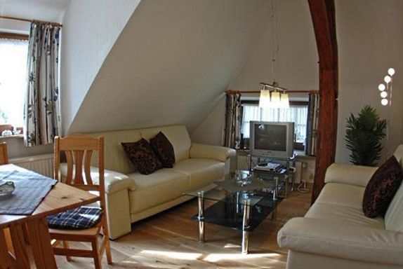 Gemütliche Ferienwohnung für 4 Personen im Obergeschoß, ca. 50 qm. Wohnraum mit Couchgarnitur aus hellem Kunstleder, Kochnische, Flachbild-TV und Radio. Die Küche wurde im Frühjahr 2010 komplett mordernisiert und mit Backofen, Ceranfeld, Spülmaschine und einer Arbeitsplatte aus Granit ausgestattet. Die Wohnung verfügt darüber hinaus über 2 Schlafräume mit Doppelbett bzw. Etagenbetten und 1 Wannenbad mit Fenster. Das Badezimmer ist von beiden Schlafräumen aus direkt erreichbar. Die Badewanne befindet sich unter einer Wandschräge. Der Schlaf- und Wohnbereich verfügt seit Frühjahr 2012 über einen hochwertigen Holzdielenboden. Bettwäsche und Handtücher sind inklusive. Kinderbett und Hochstuhl stehen kostenlos zur Verfügung (auf Anfrage). Zum Sonnen und Faulenzen gibt es separate, idyllisch gelegene Terrassen mit Strandkörben und Gartenmöbeln im großen, gepflegten Garten.