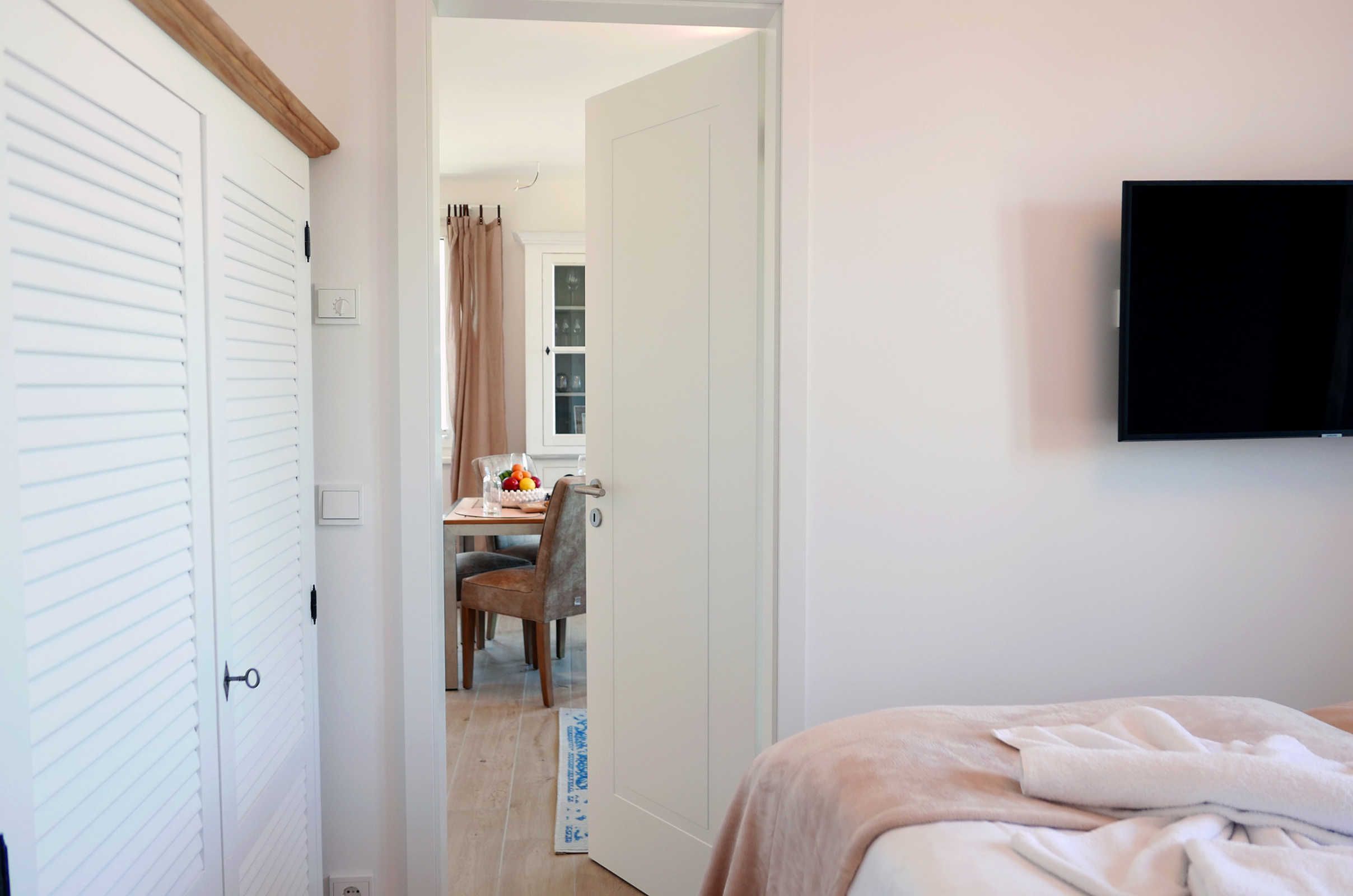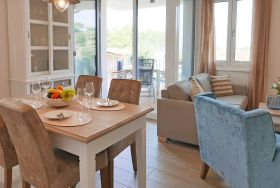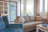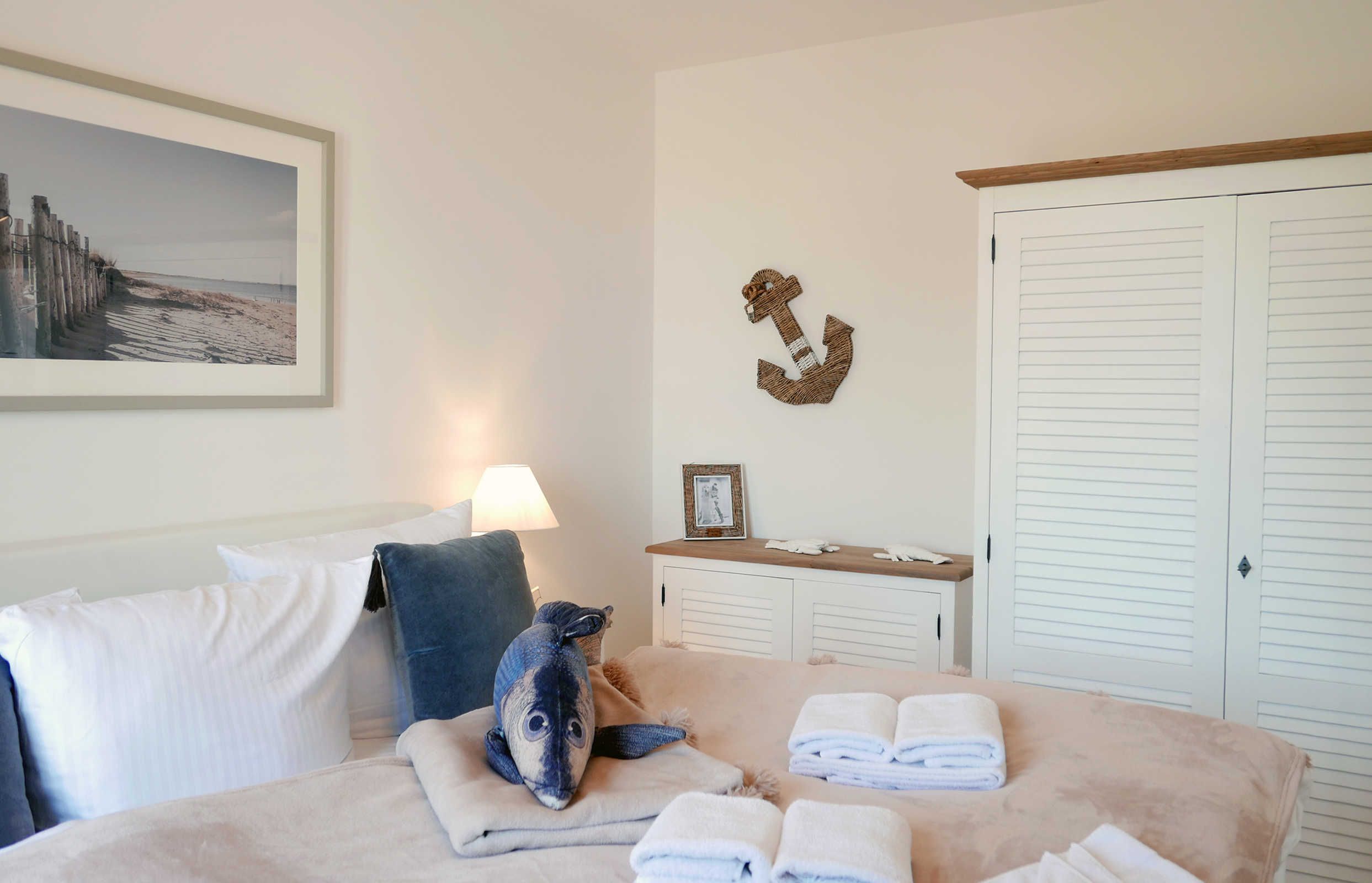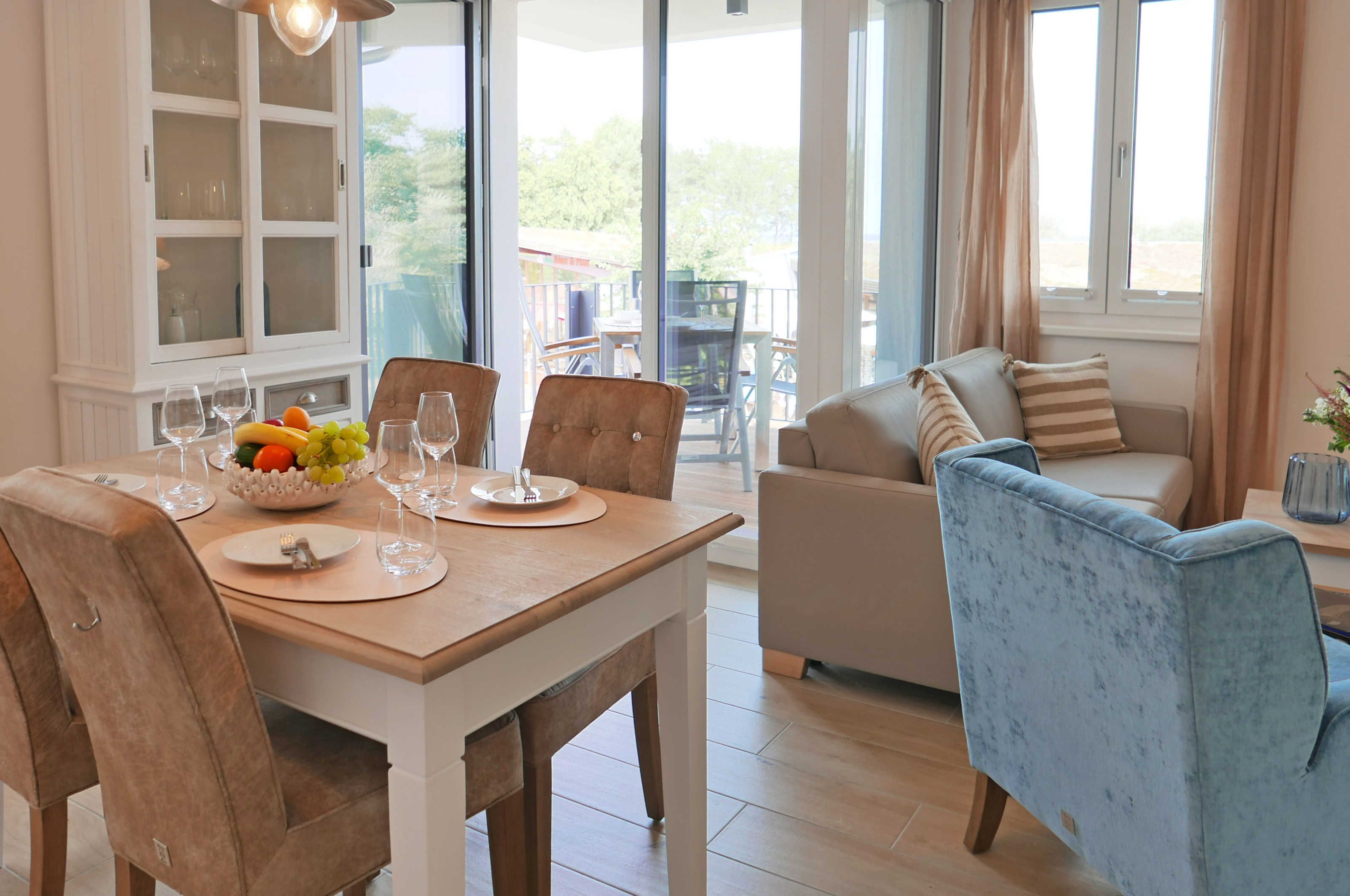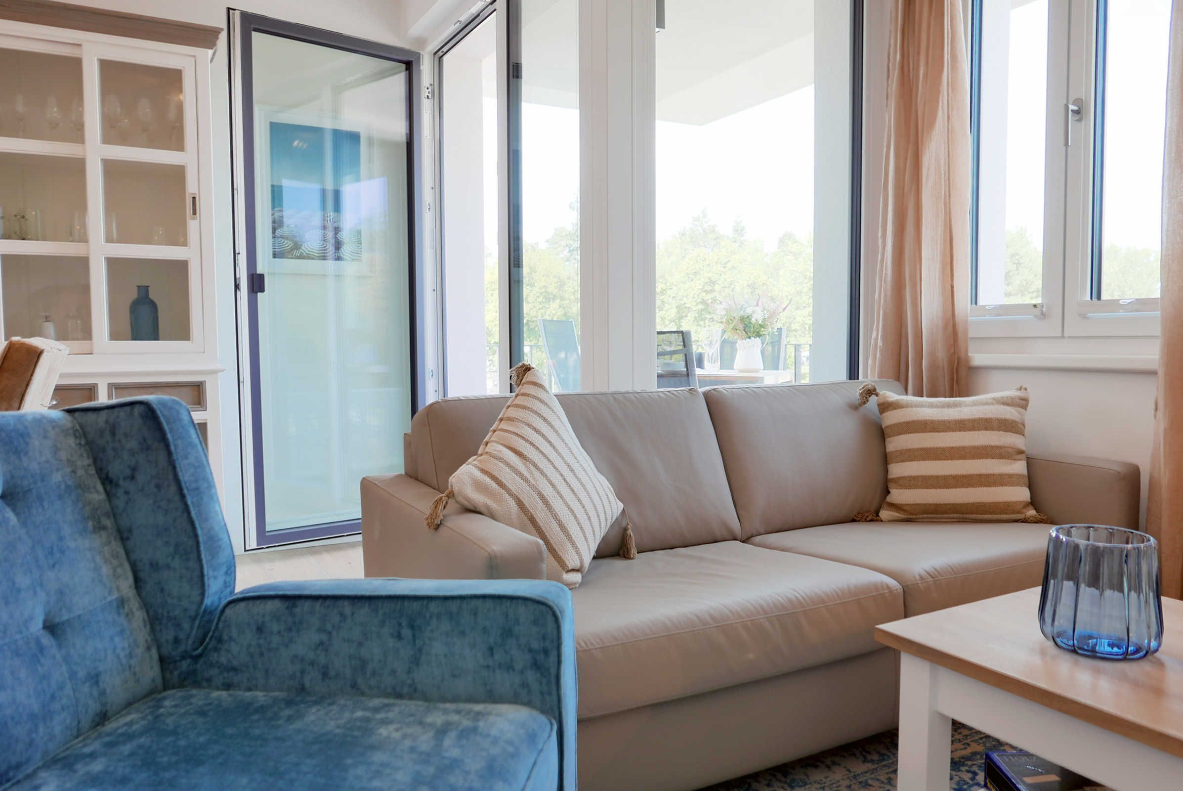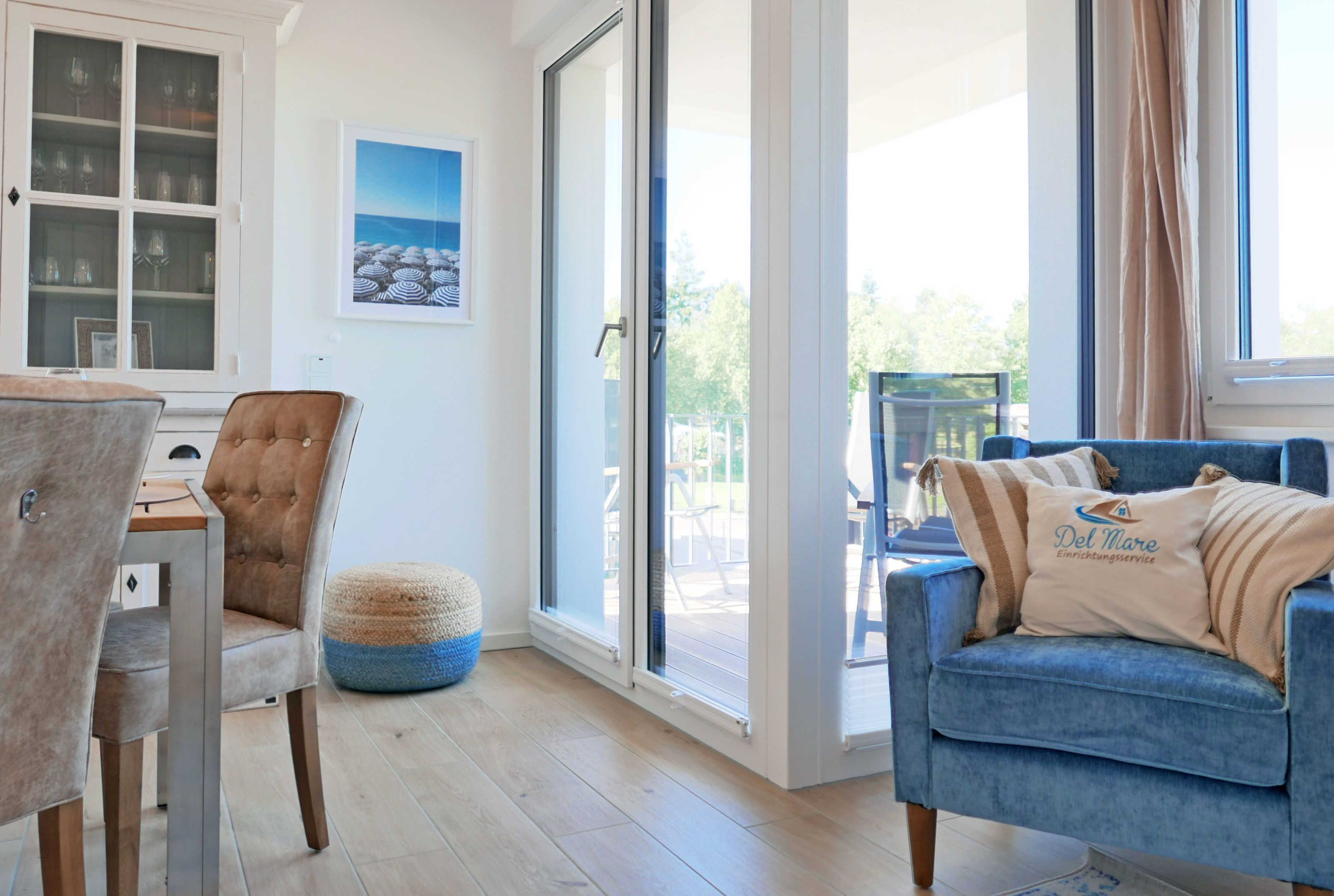 In dieser wunderbar hellen und hochwertig ausgestatteten Ferienwohnung bleiben keine Wünsche offen: Die gesamte Wohnung ist in maritimen Farben gehalten, sodass hier direkt Urlaubsatmosphäre aufkommt. Sowohl vom Balkon als auch von den bodentiefen Fenstern aus können Sie bis zum Meer blicken.